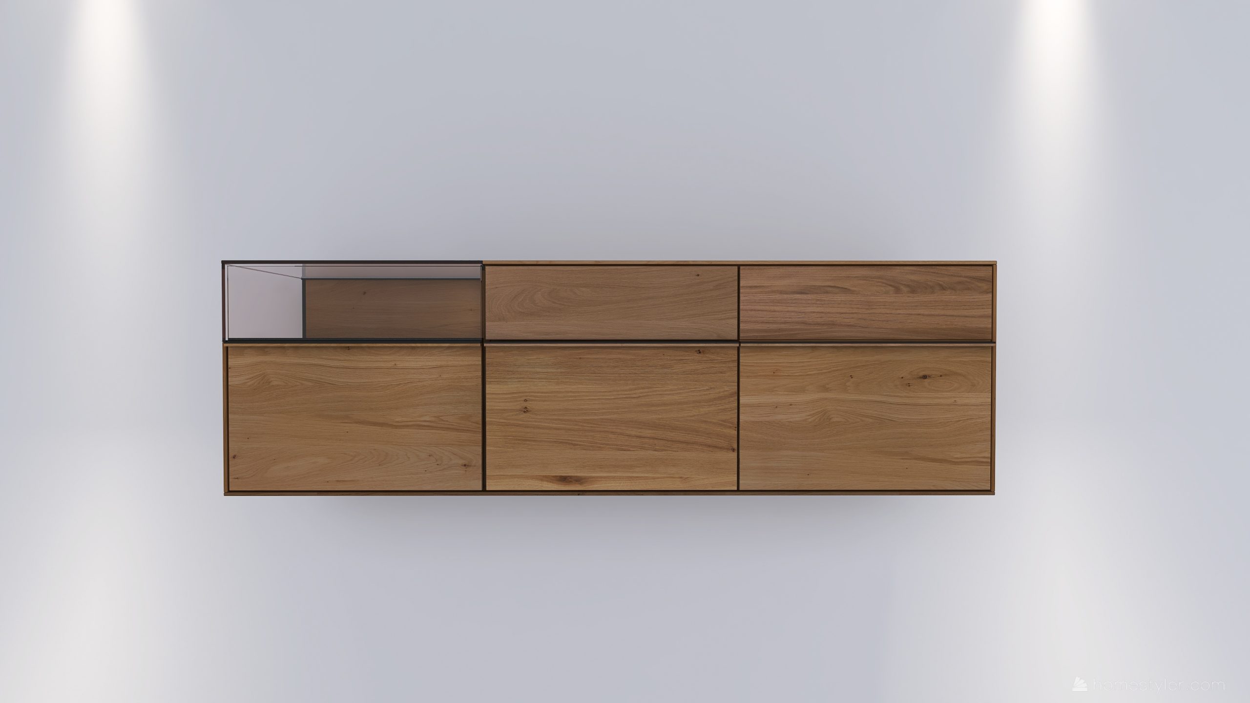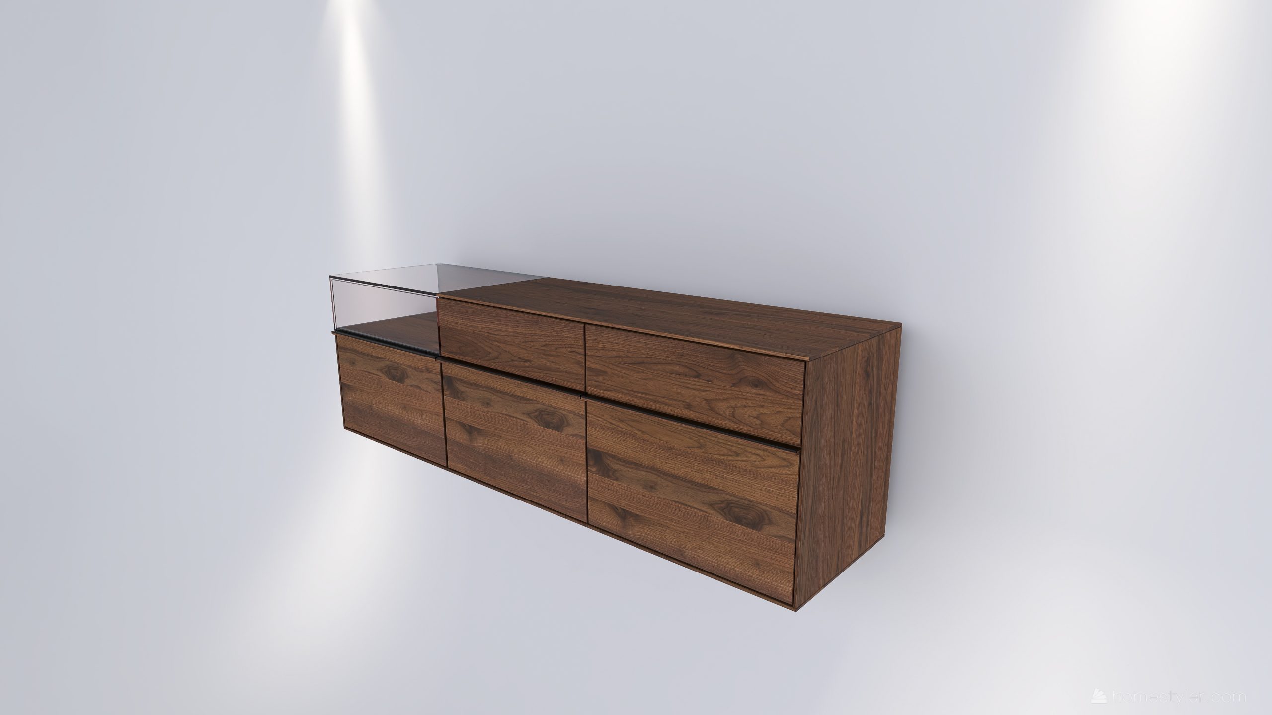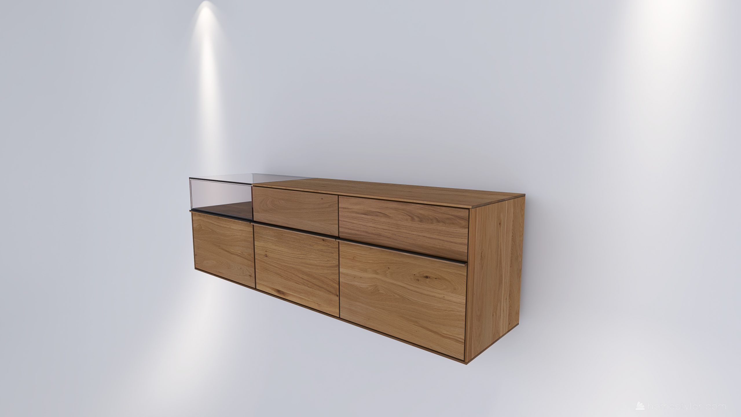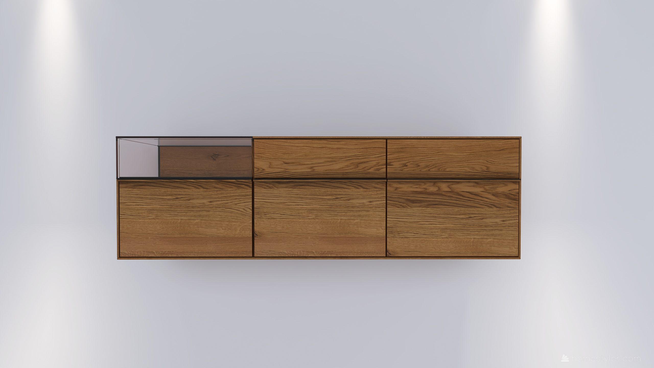 Tömörfa faliszekrény, egy nyíló üvegajtóval, két mély és két keskeny fiókkal. A szélső mély fiókelő anyaga (pala, kerámia) valamint a világítás opcióként választható.