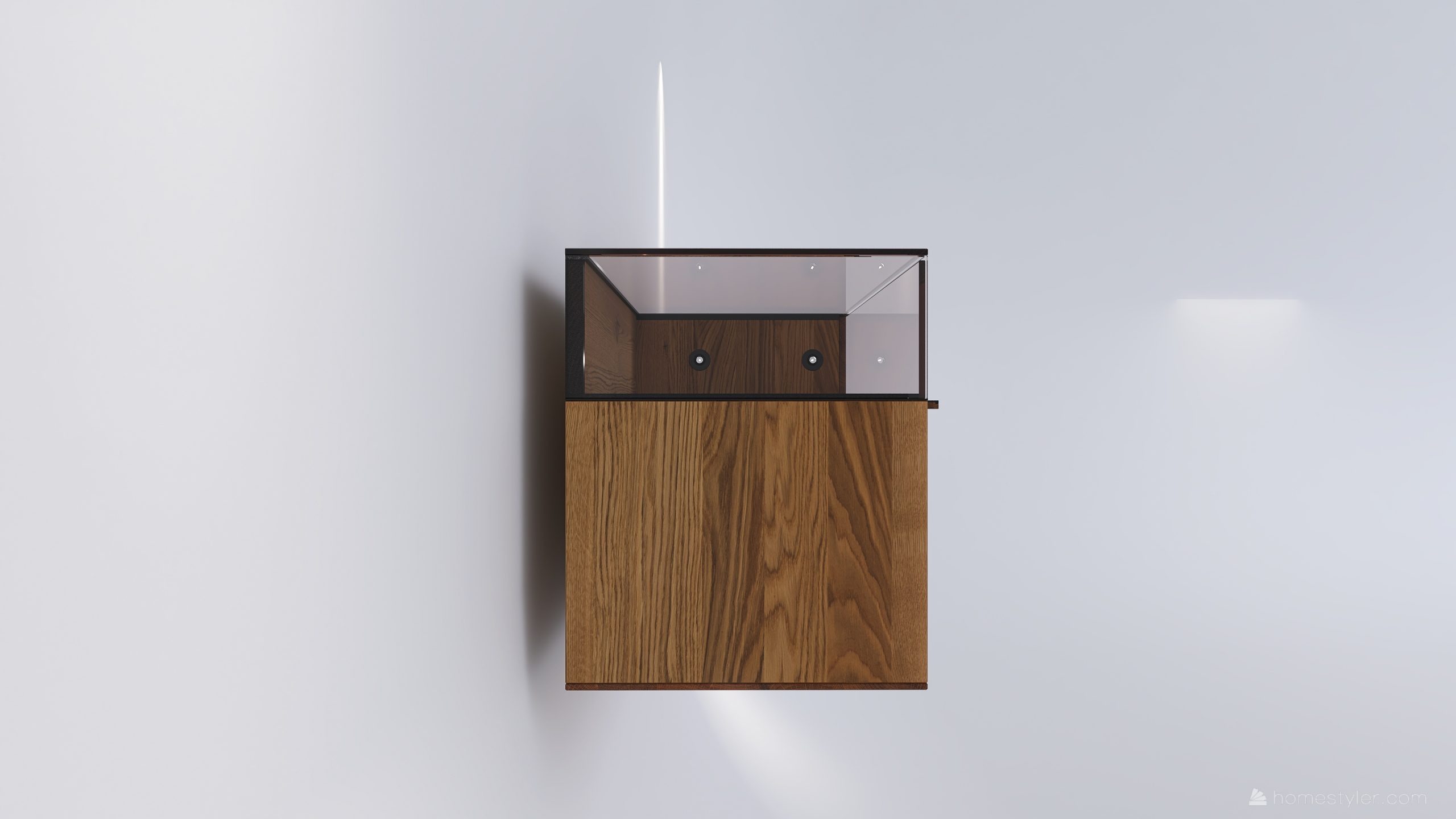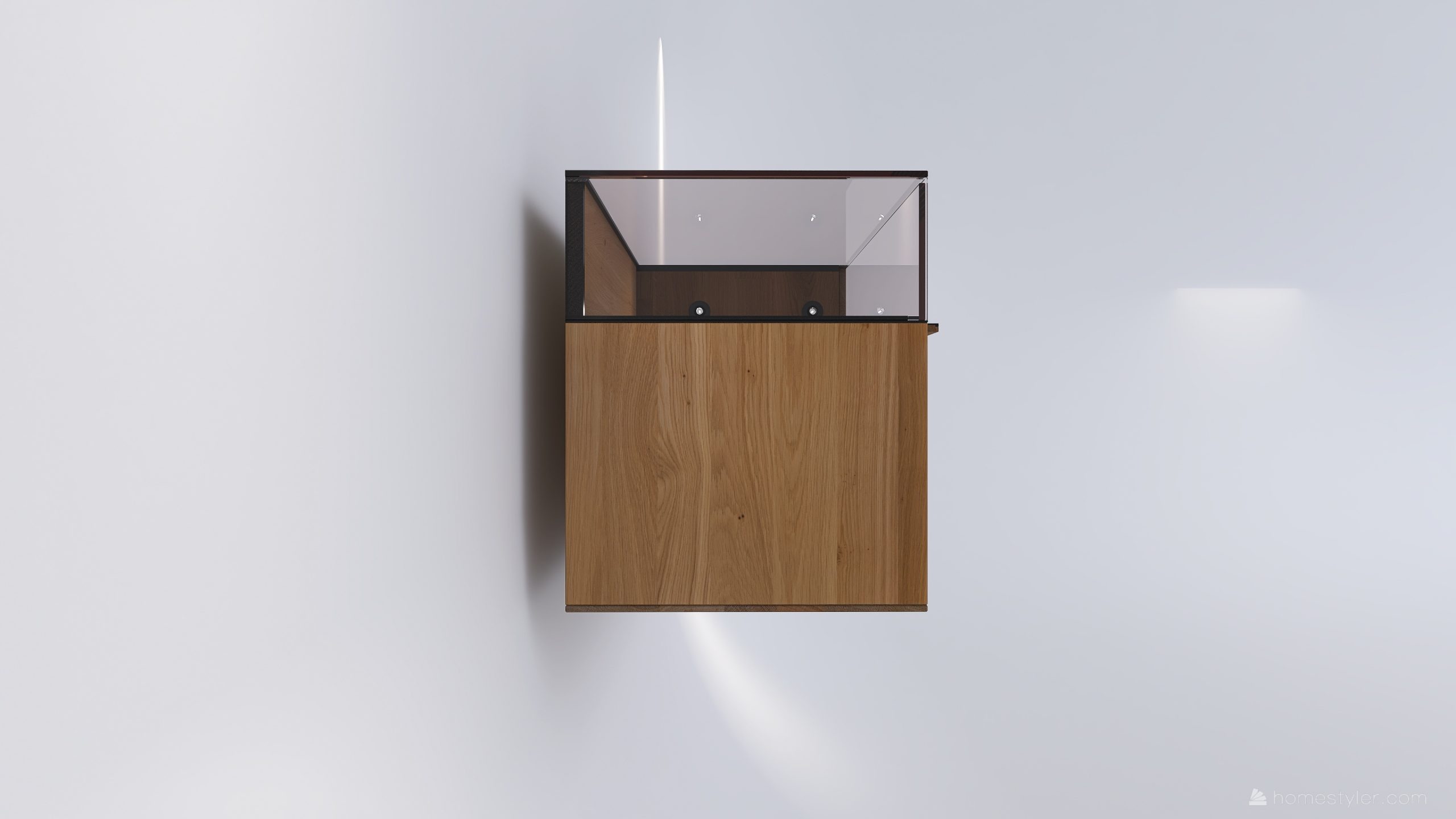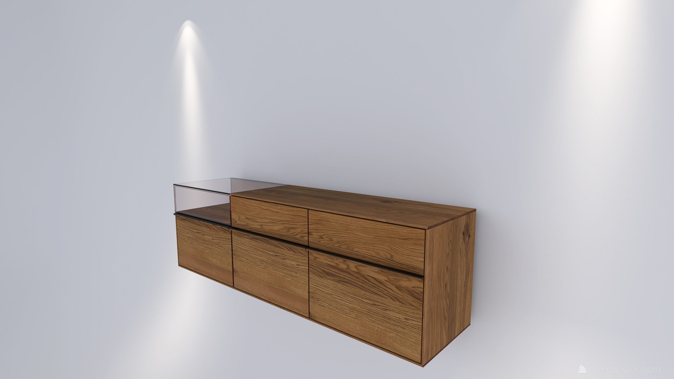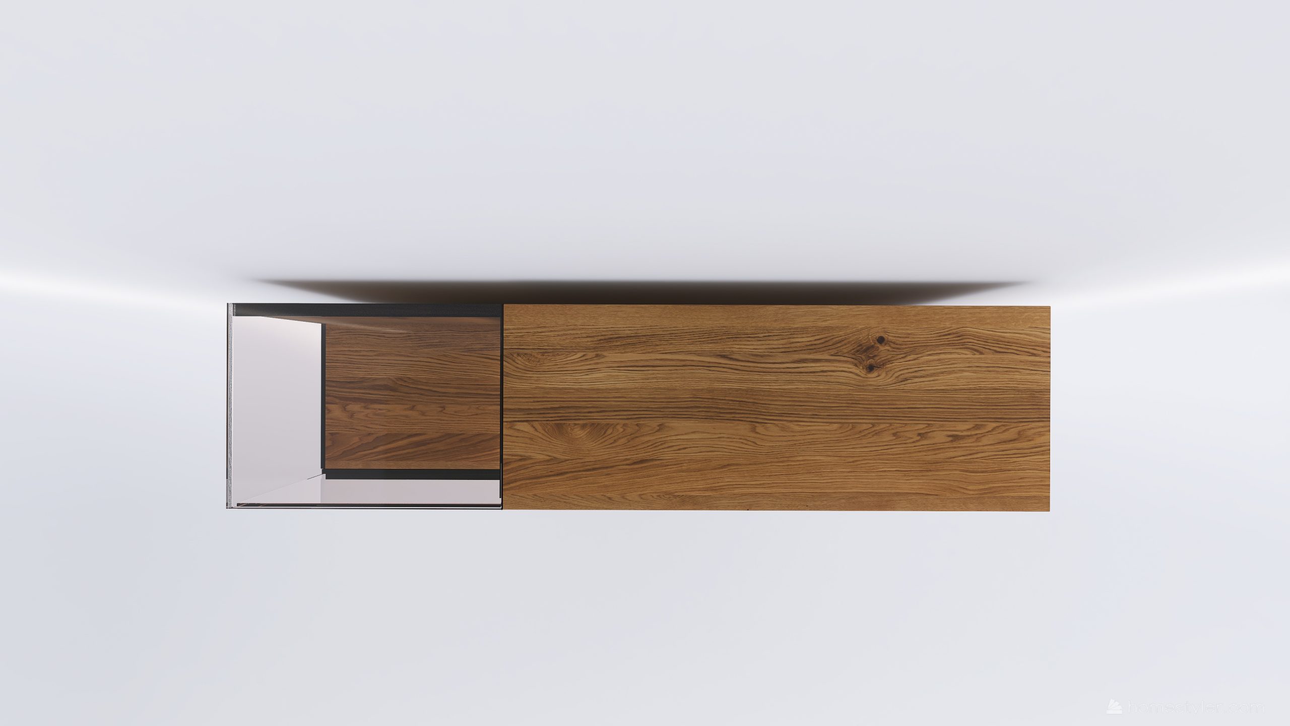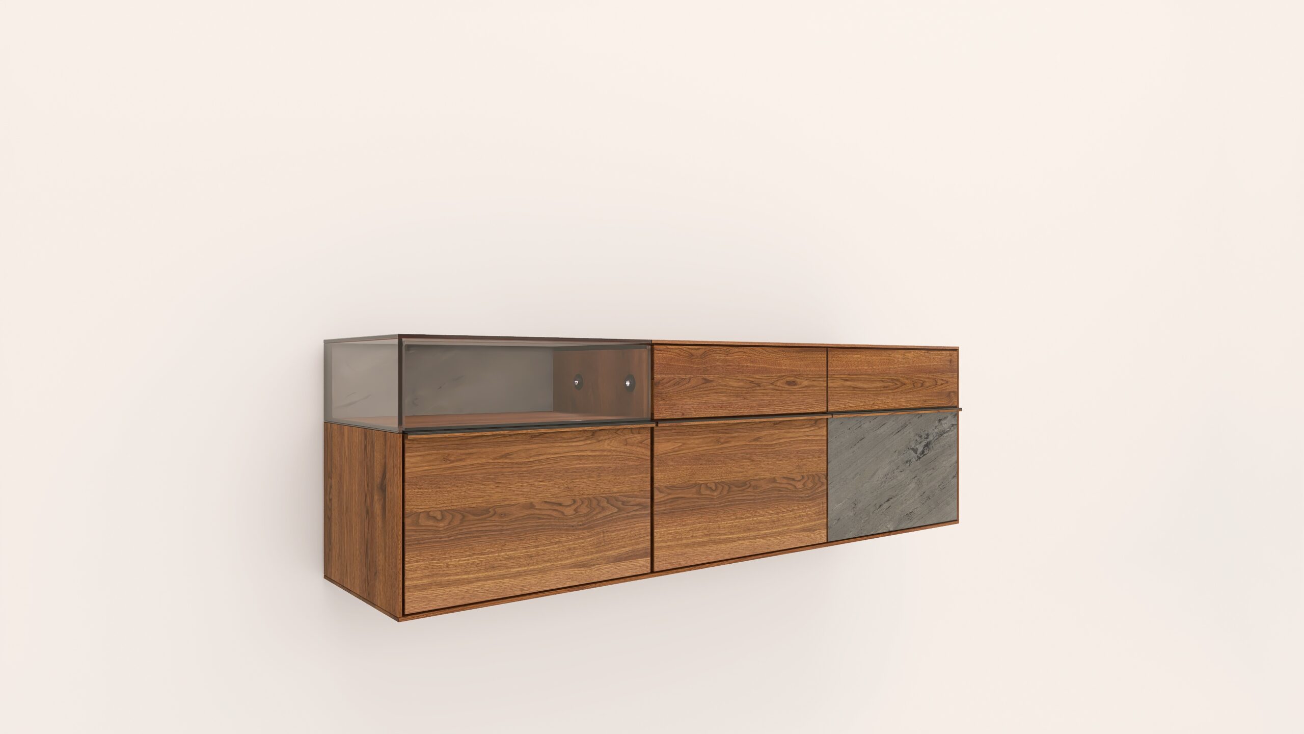 Tömörfa faliszekrény, egy nyíló üvegajtóval, két mély és két keskeny fiókkal. A szélső mély fiókelő anyaga (pala, kerámia) valamint a világítás opcióként választható.