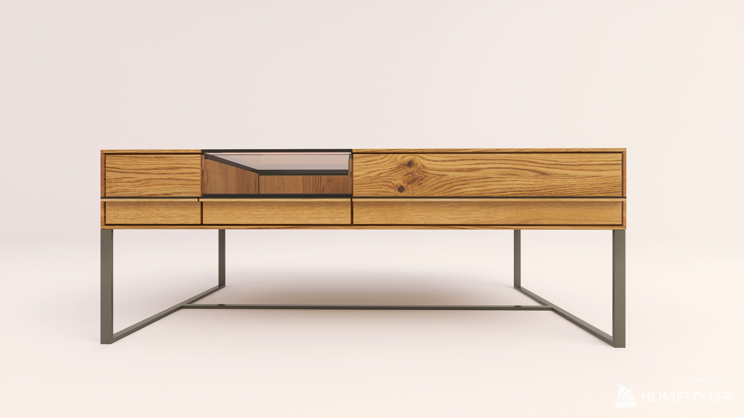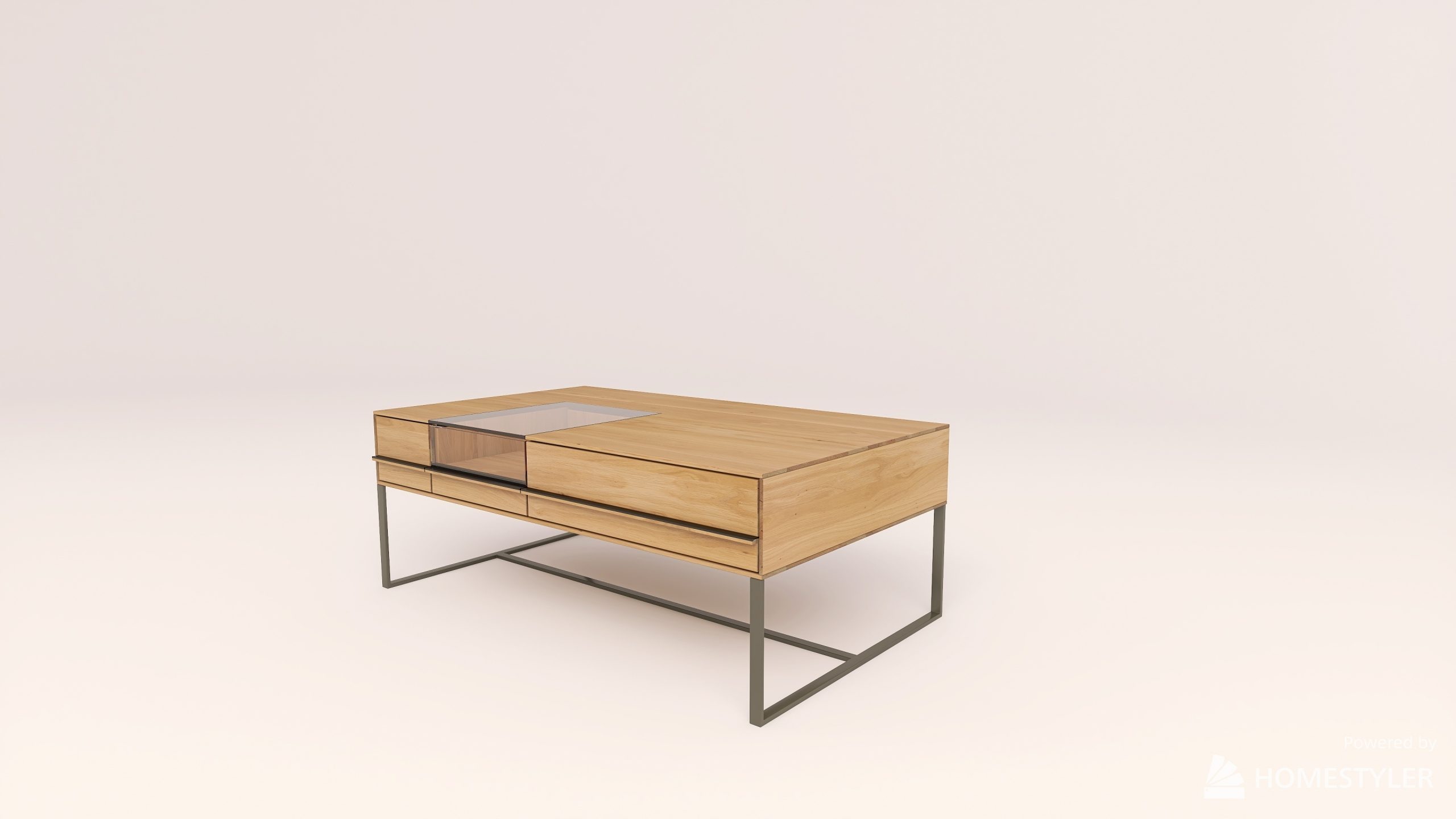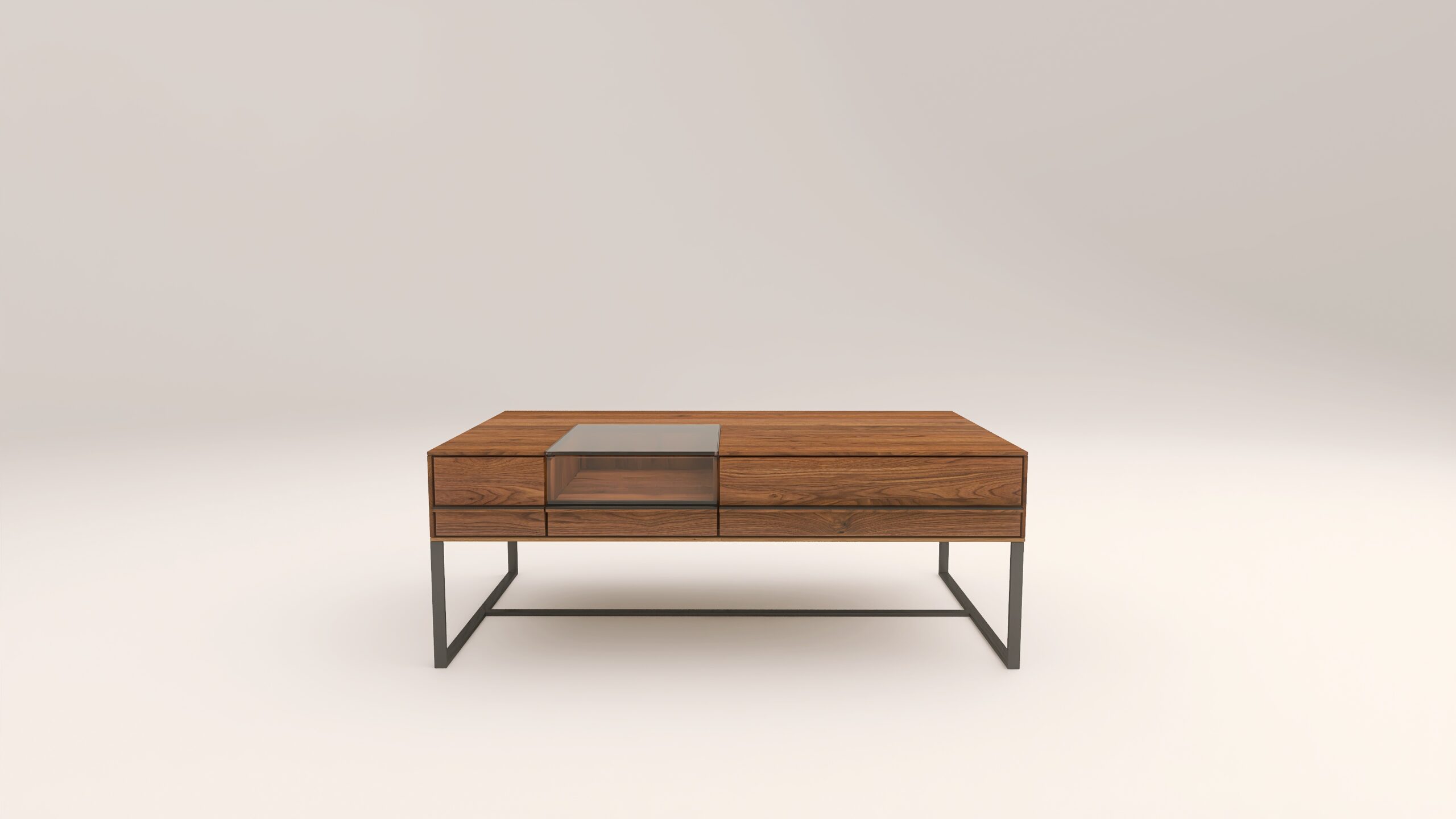 Dohányzóasztal fém lábbal. Egy üveges és egy sima fiókkal.