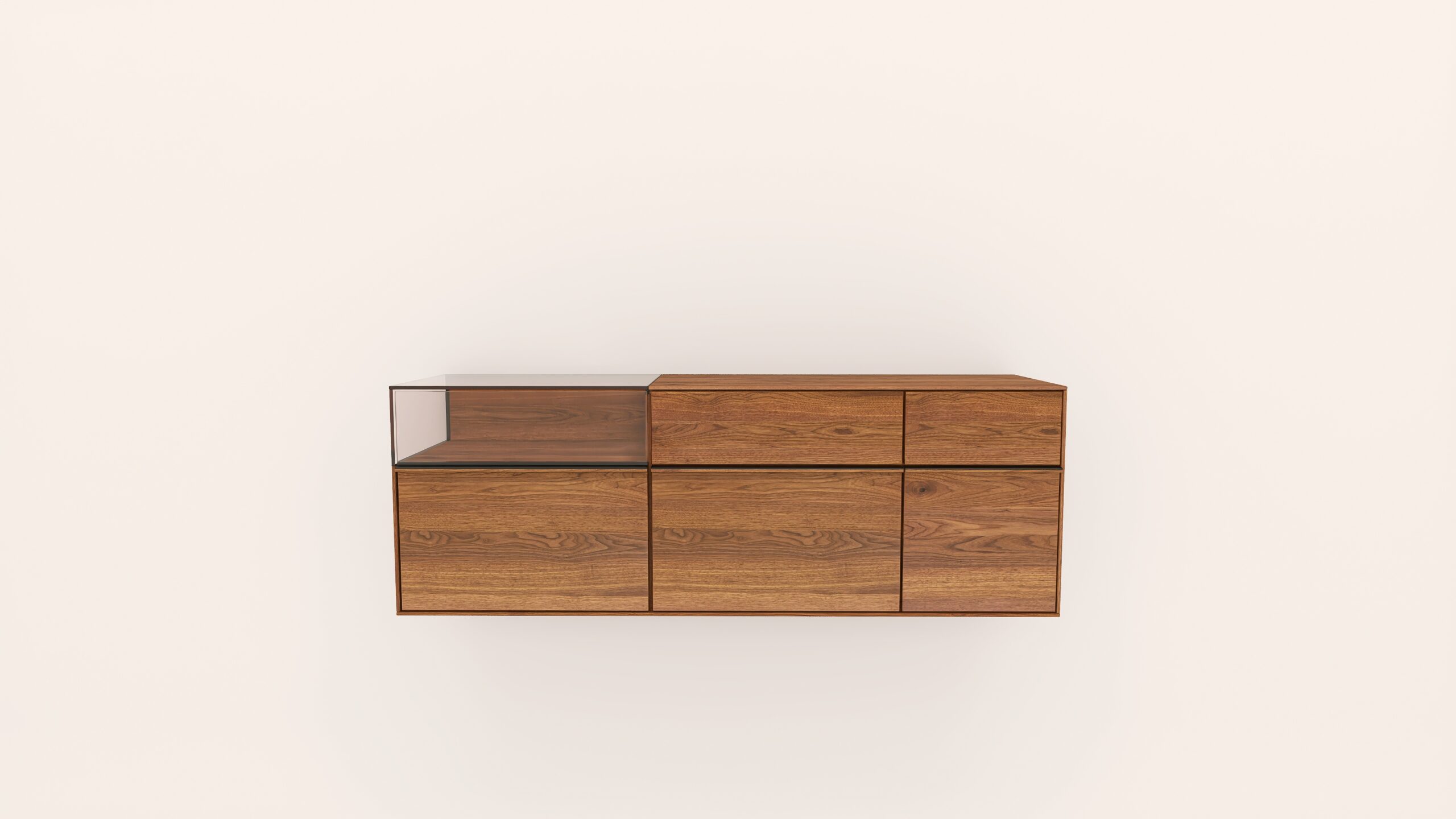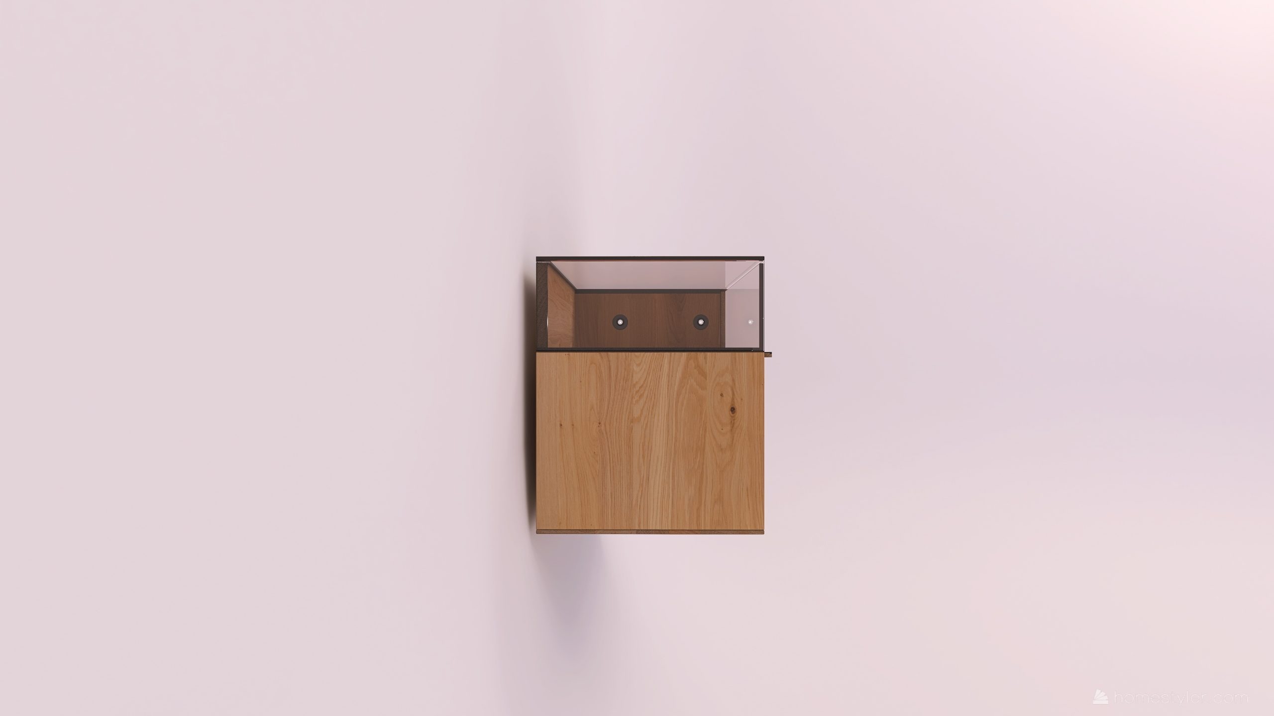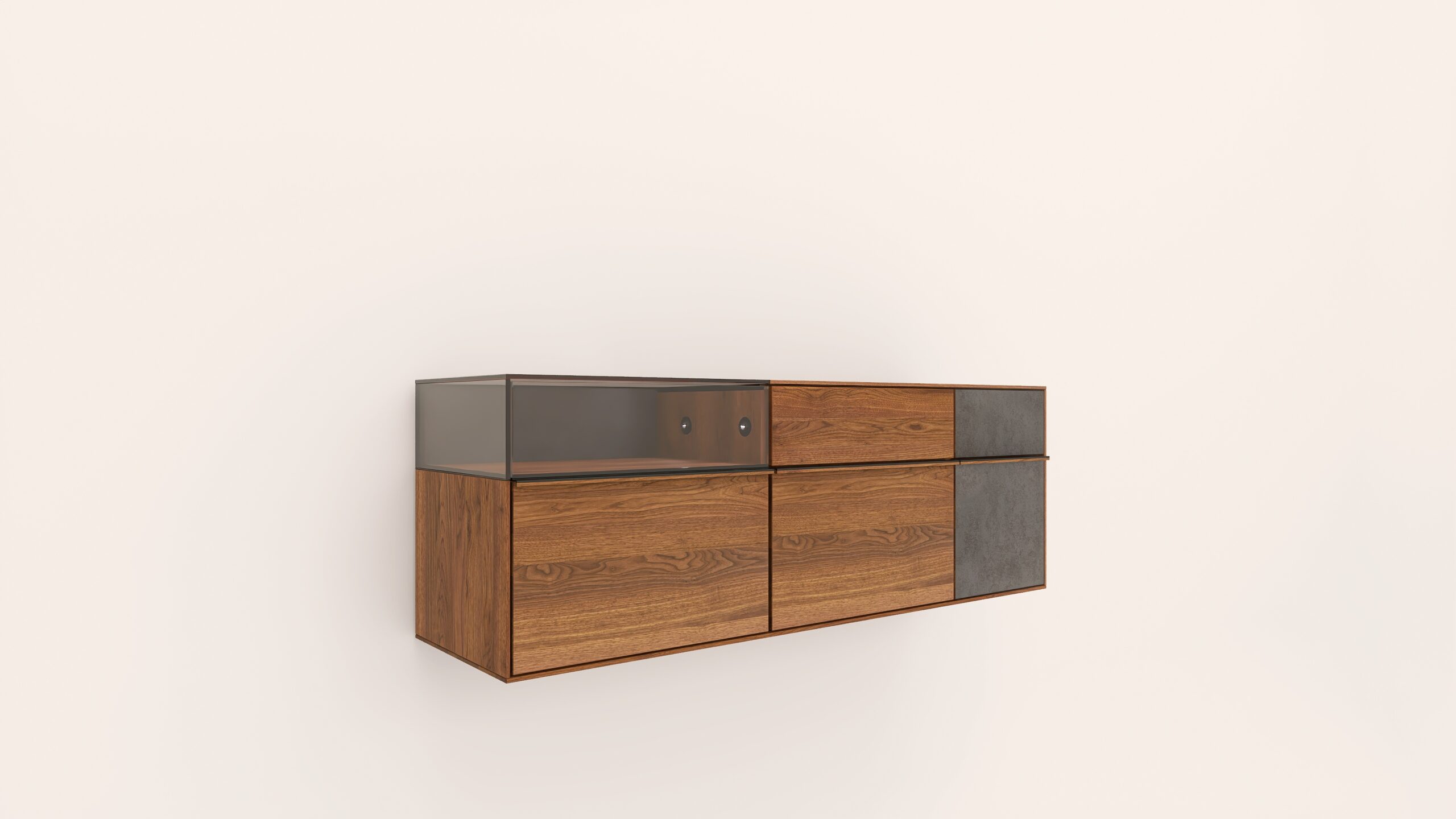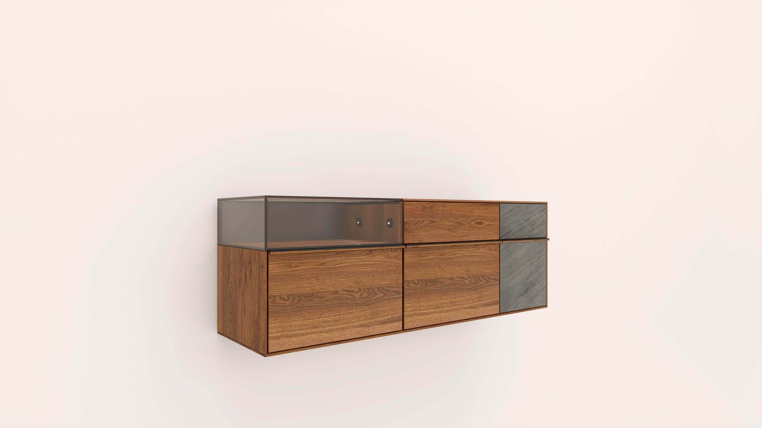 Tömörfa faliszekrény, egy nyíló üvegajtóval, egy fa ajtóval egy mély és egy keskeny fiókkal. A fa ajtó anyaga ( kő, kerámia) valamint a világítás opcióként választható.