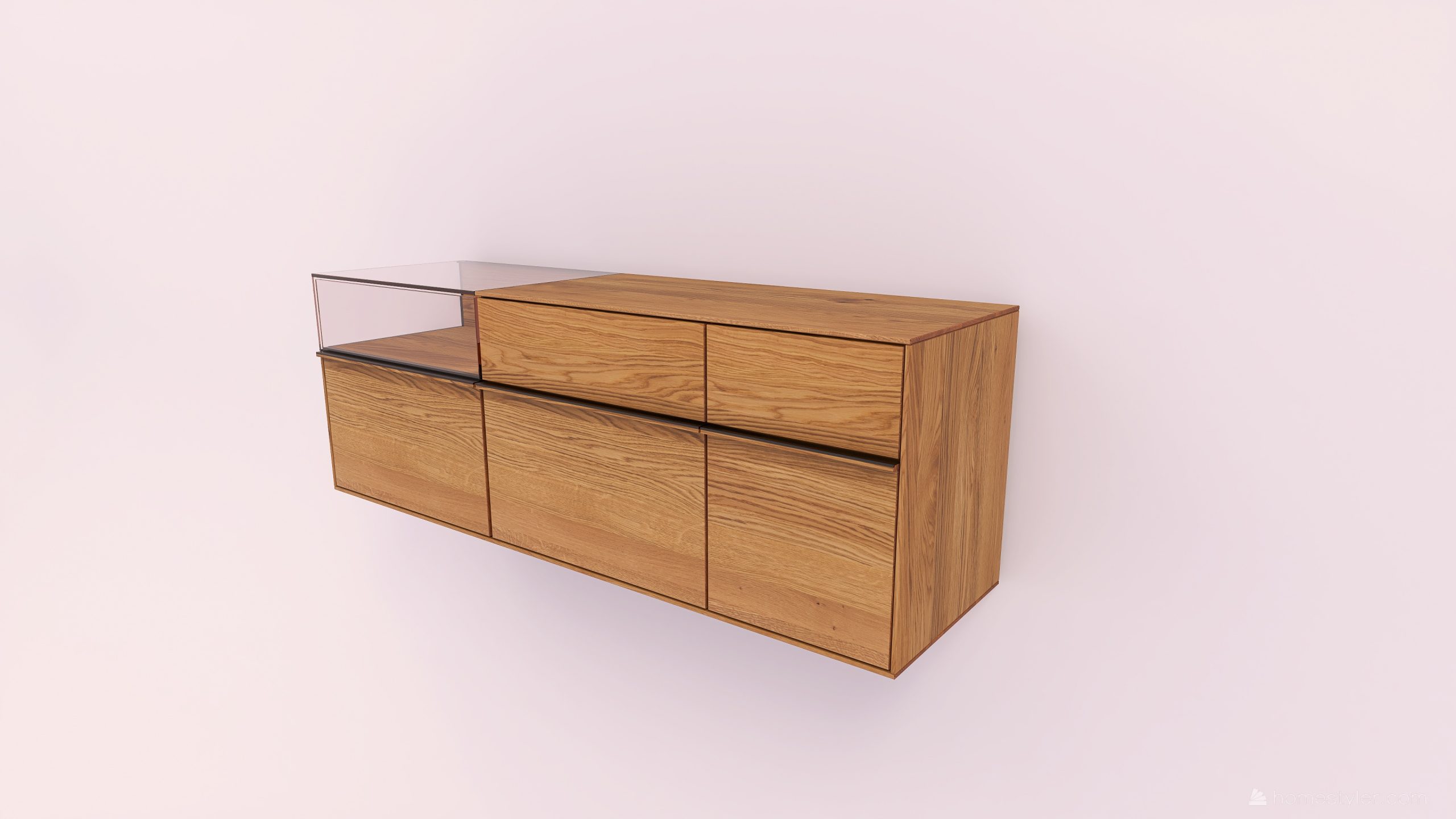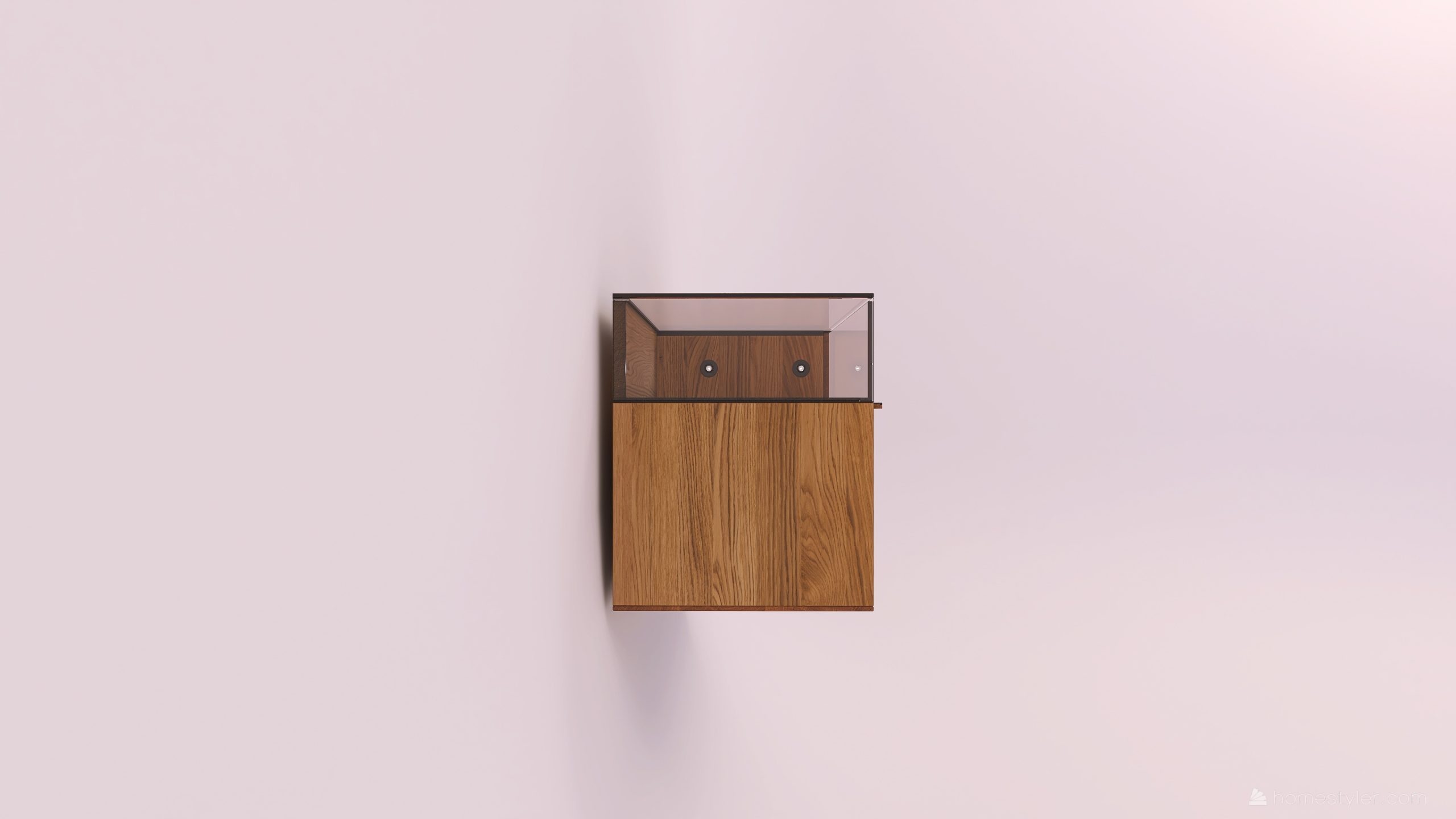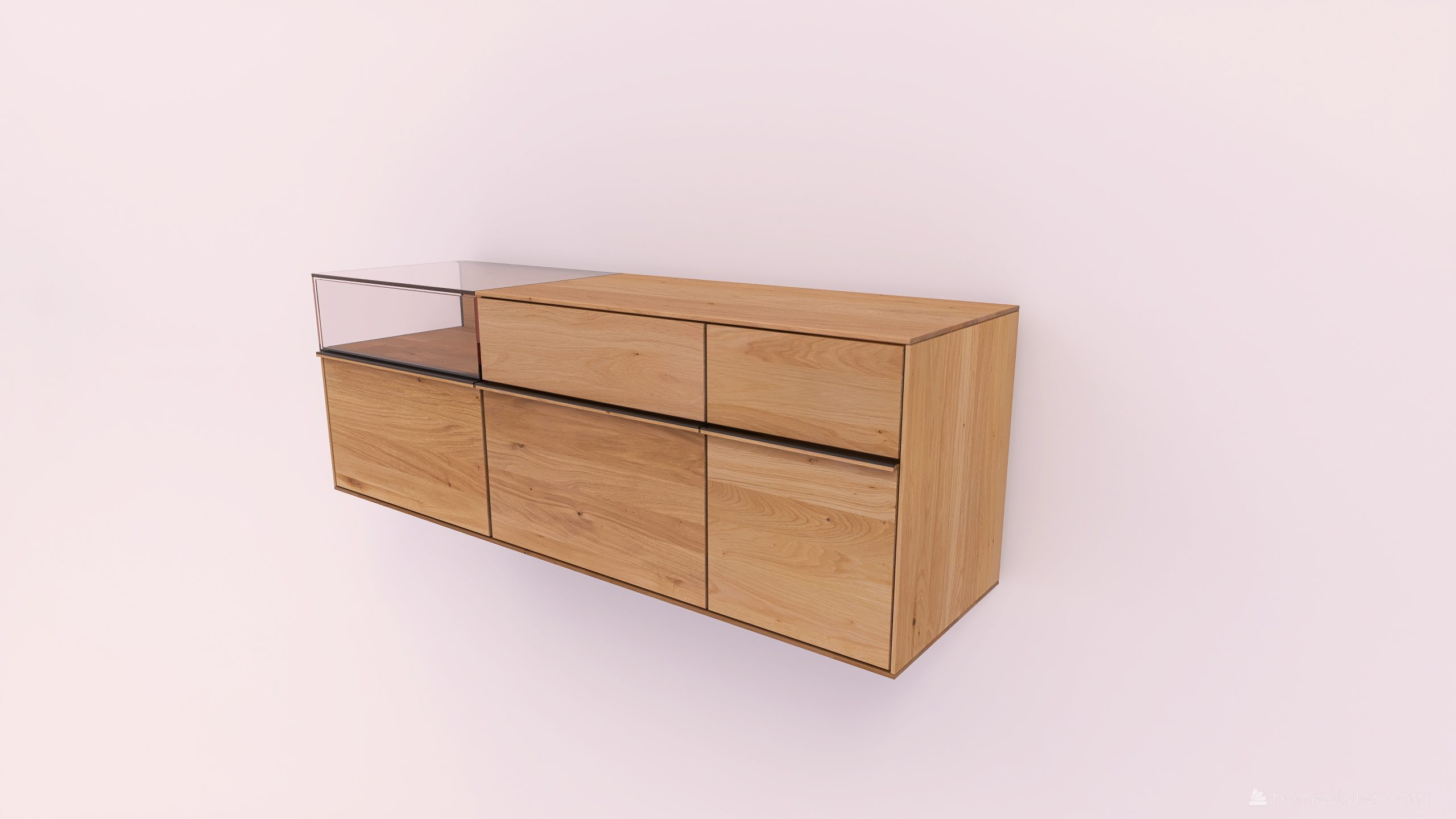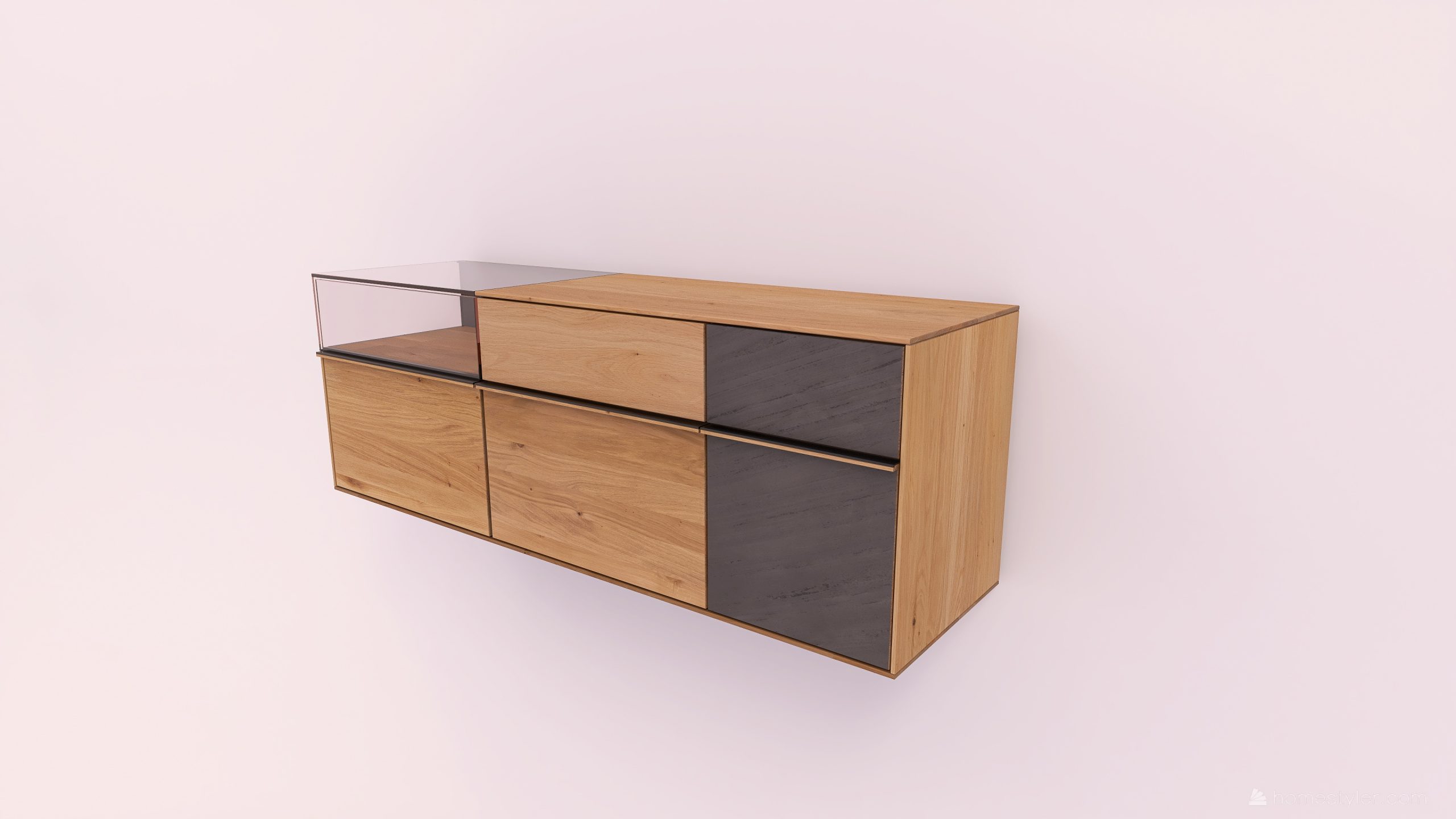 Tömörfa faliszekrény, egy nyíló üvegajtóval, egy fa ajtóval egy mély és egy keskeny fiókkal. A fa ajtó anyaga ( kő, kerámia) valamint a világítás opcióként választható.