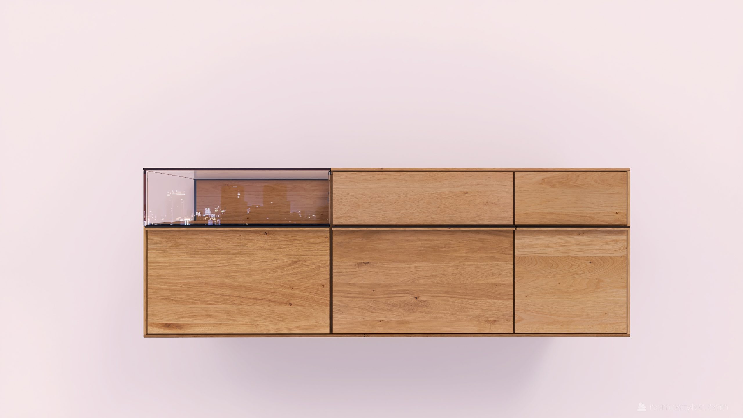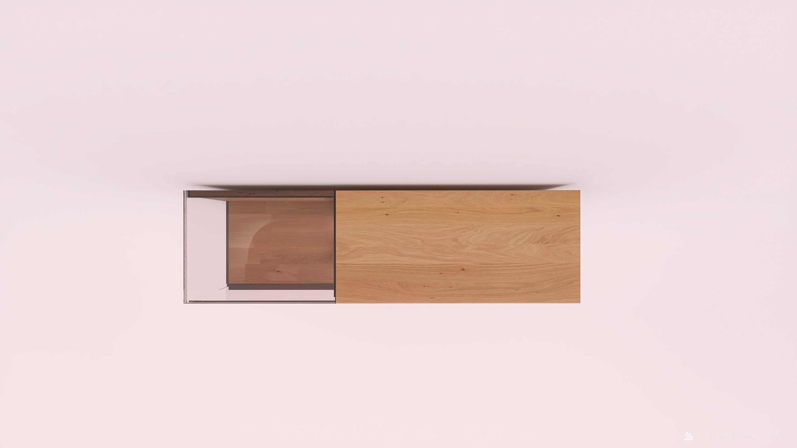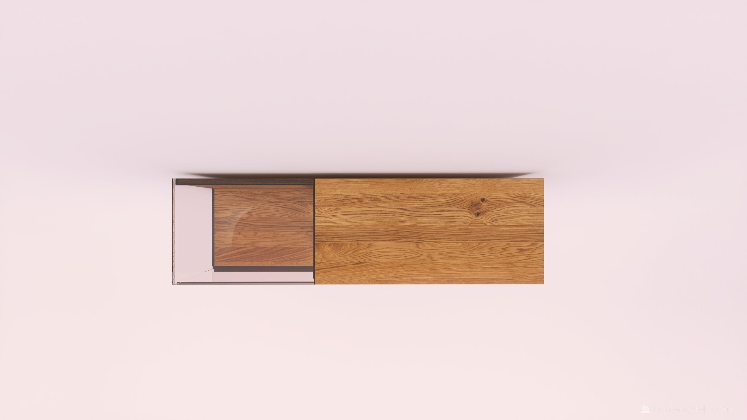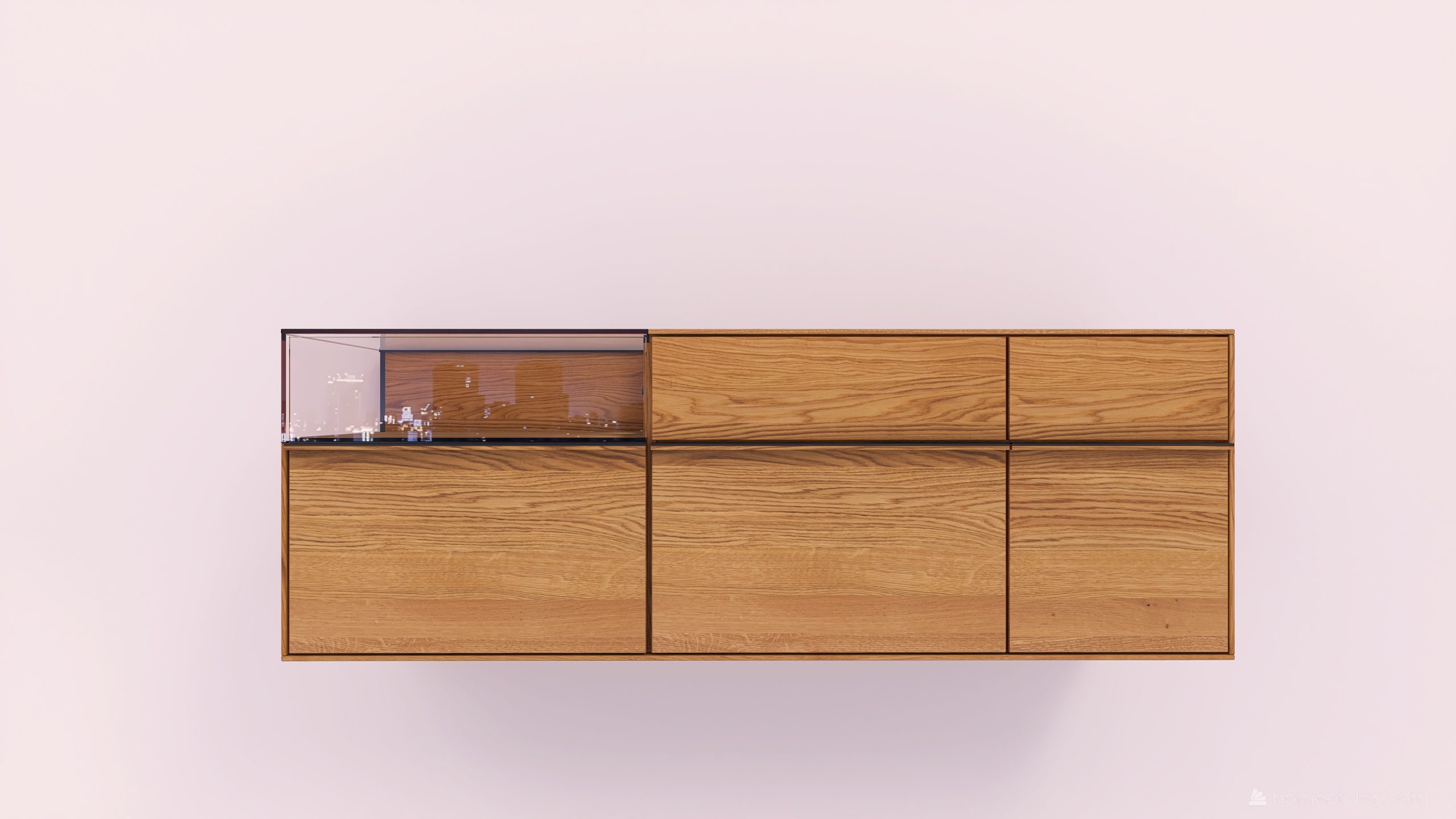 Tömörfa faliszekrény, egy nyíló üvegajtóval, egy fa ajtóval egy mély és egy keskeny fiókkal. A fa ajtó anyaga ( kő, kerámia) valamint a világítás opcióként választható.
