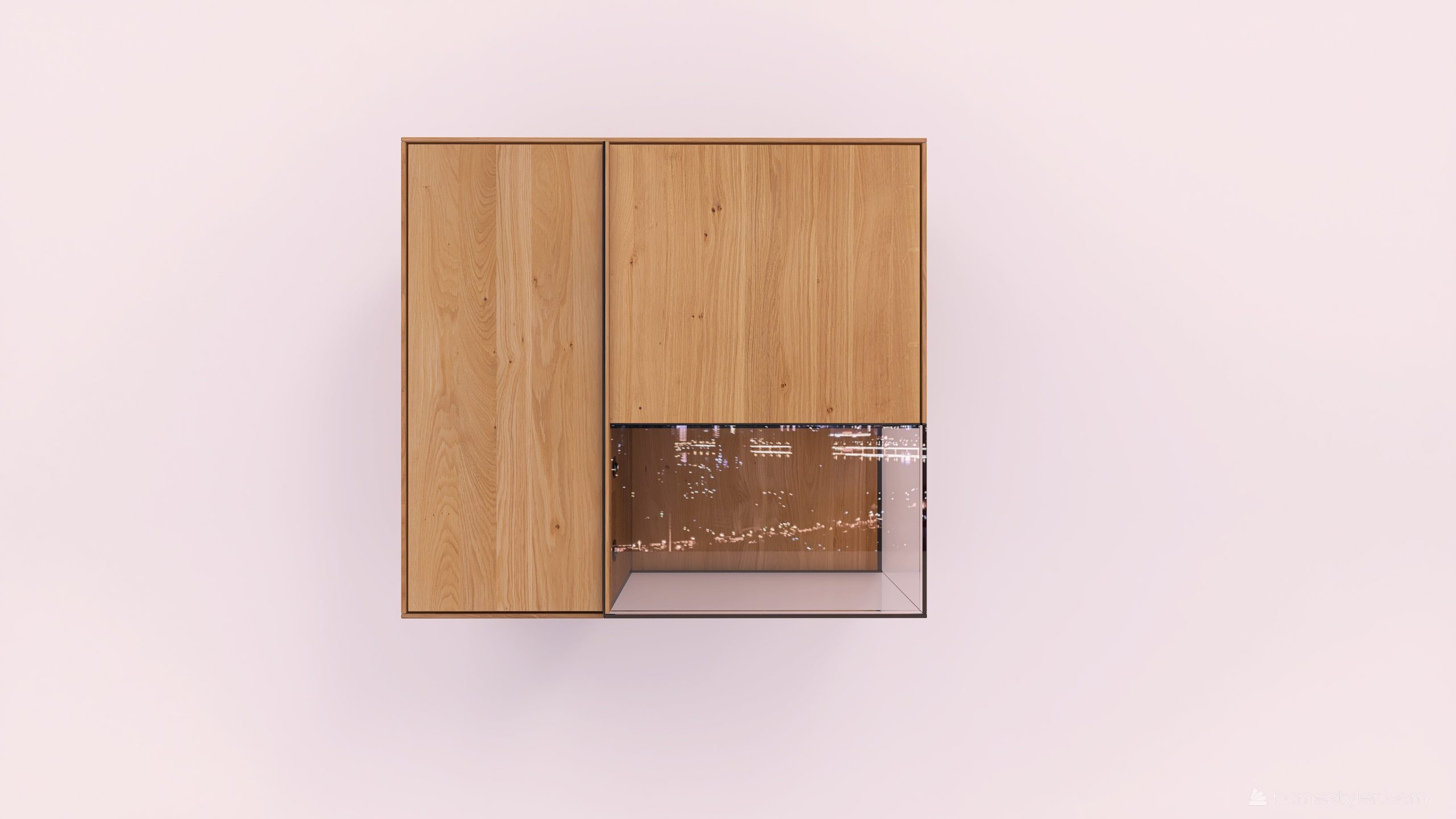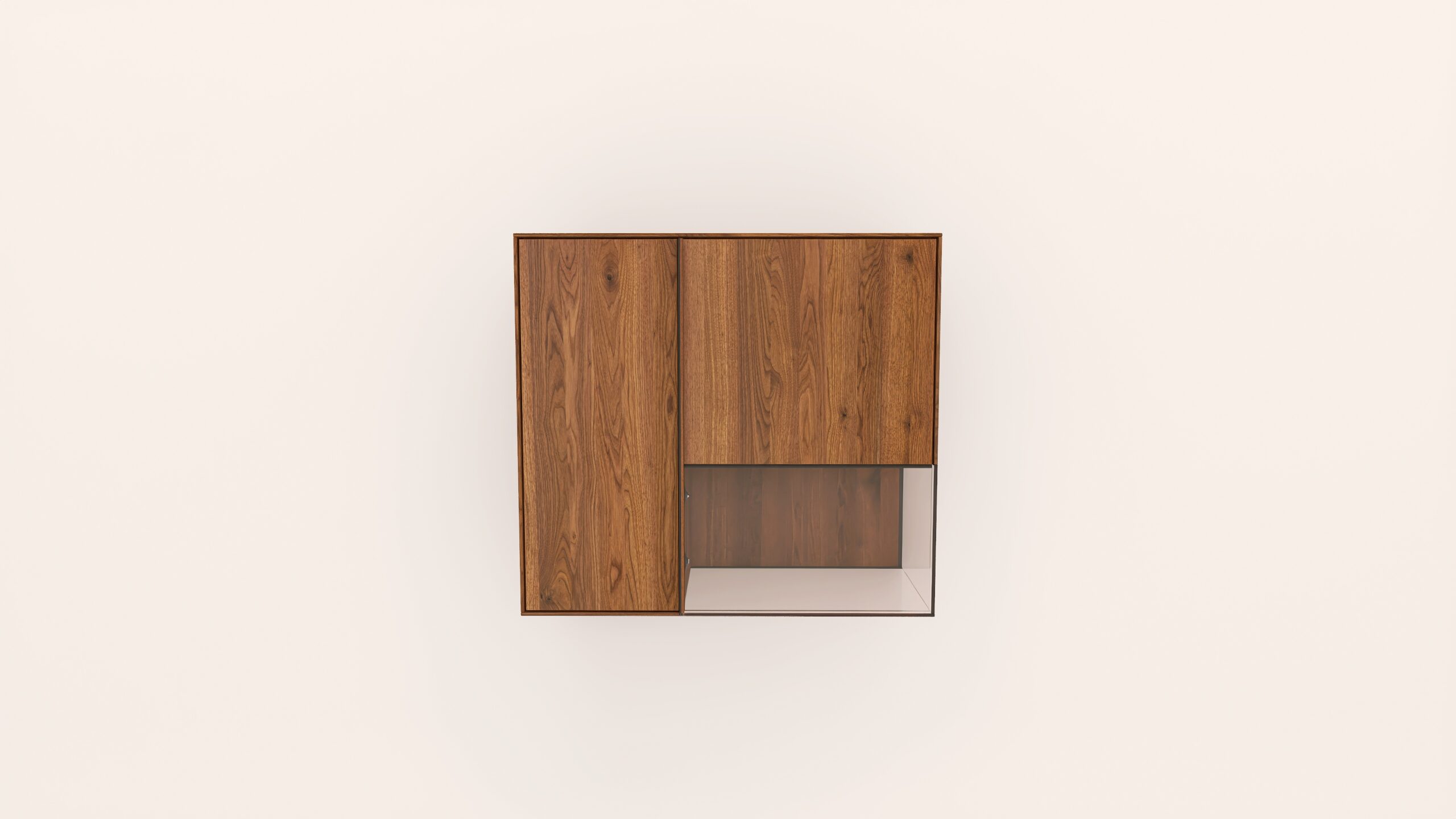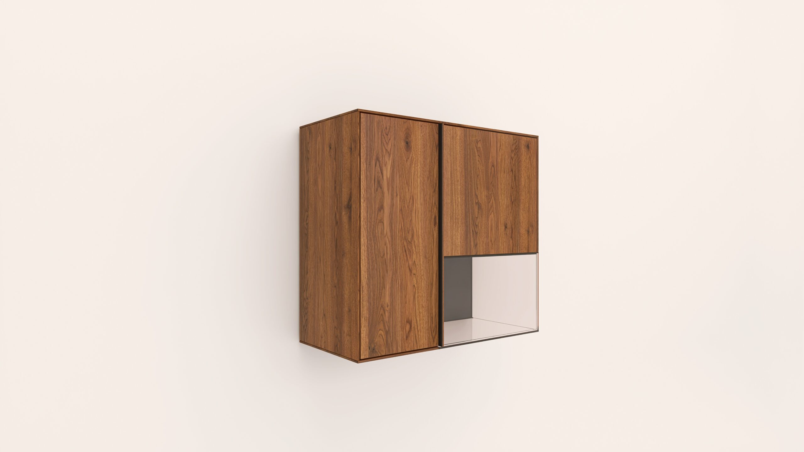 Tömörfa faliszekrény, egy nyíló üvegajtóval és egy nyíló fa ajtóval. A keskeny ajtó mögött két polccal az üveges ajtó mögött pedig egy polccal. A hátfal anyaga az üveges rész mögött ( pala, kerámia) valamint a világítás opcióként választható.