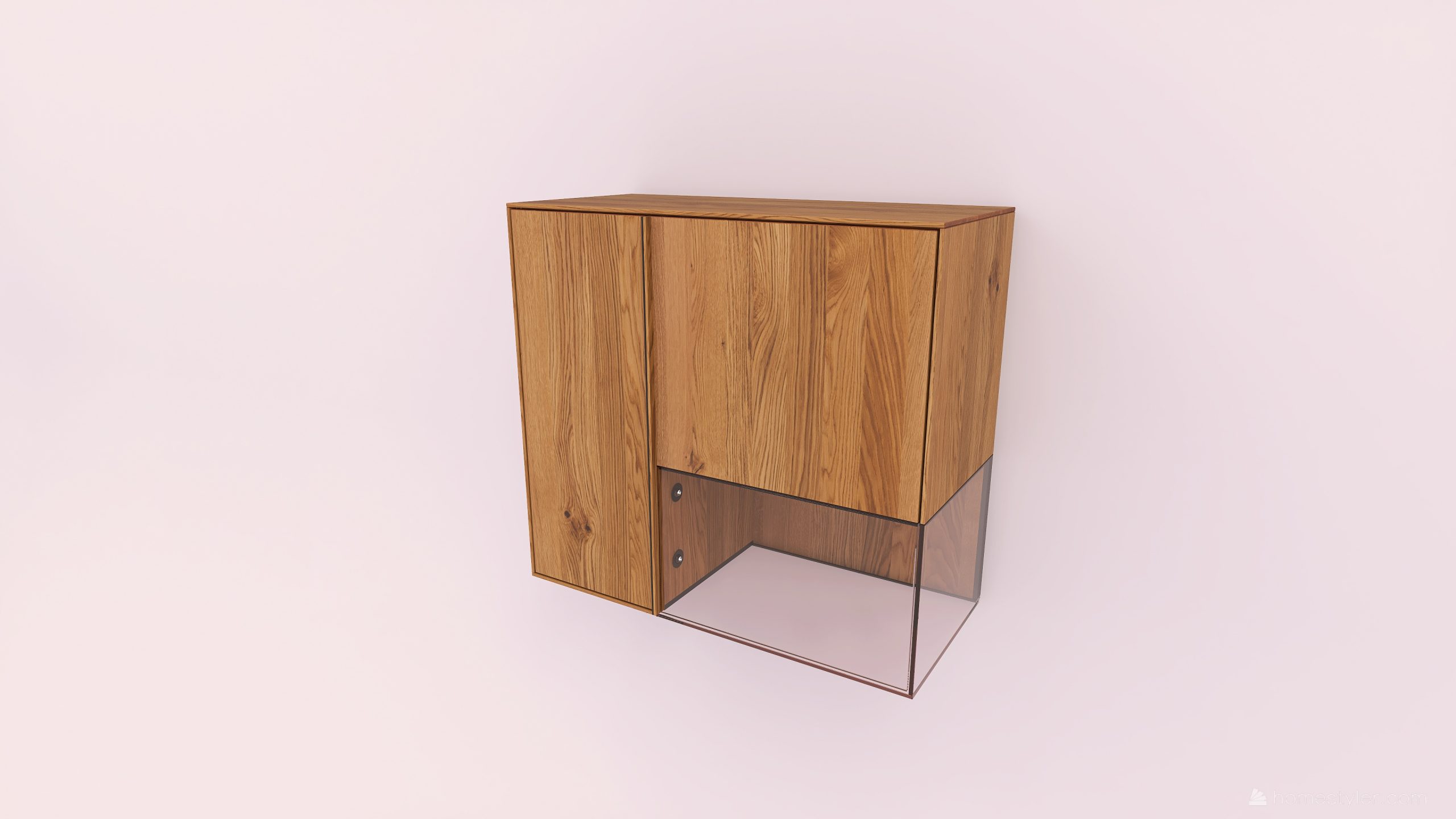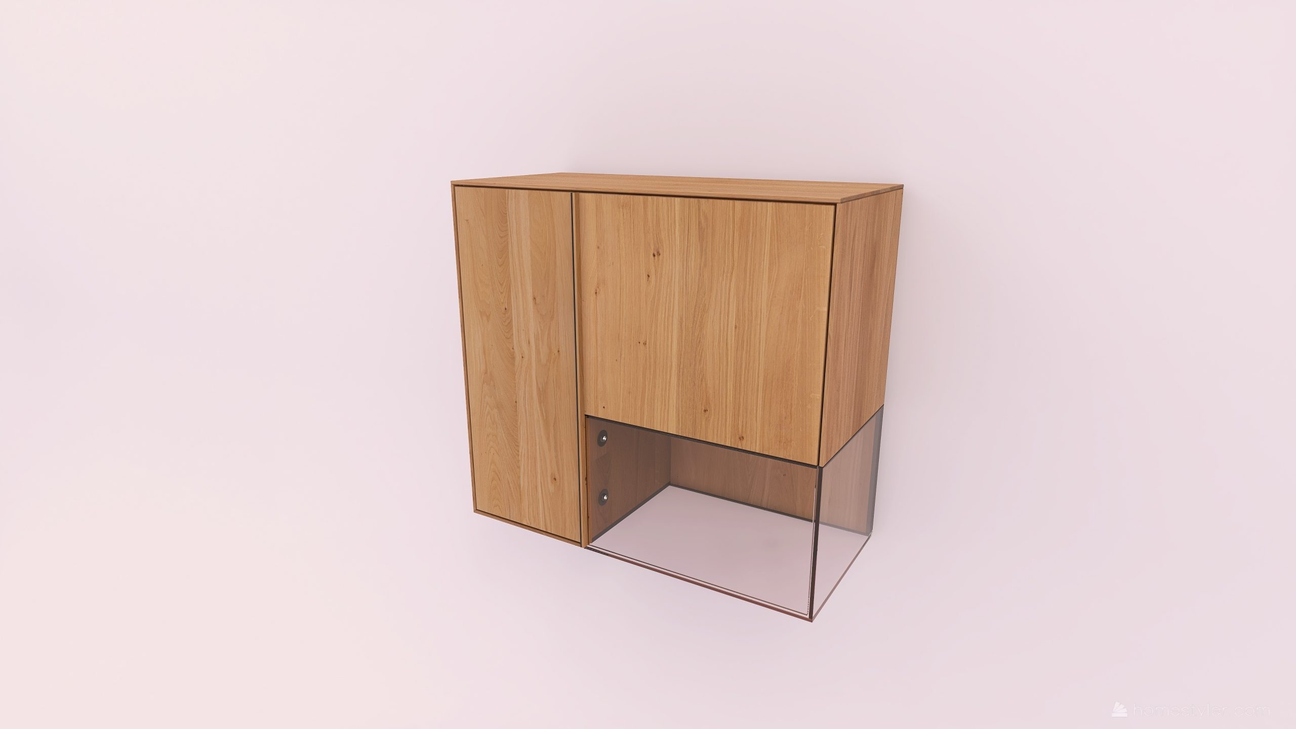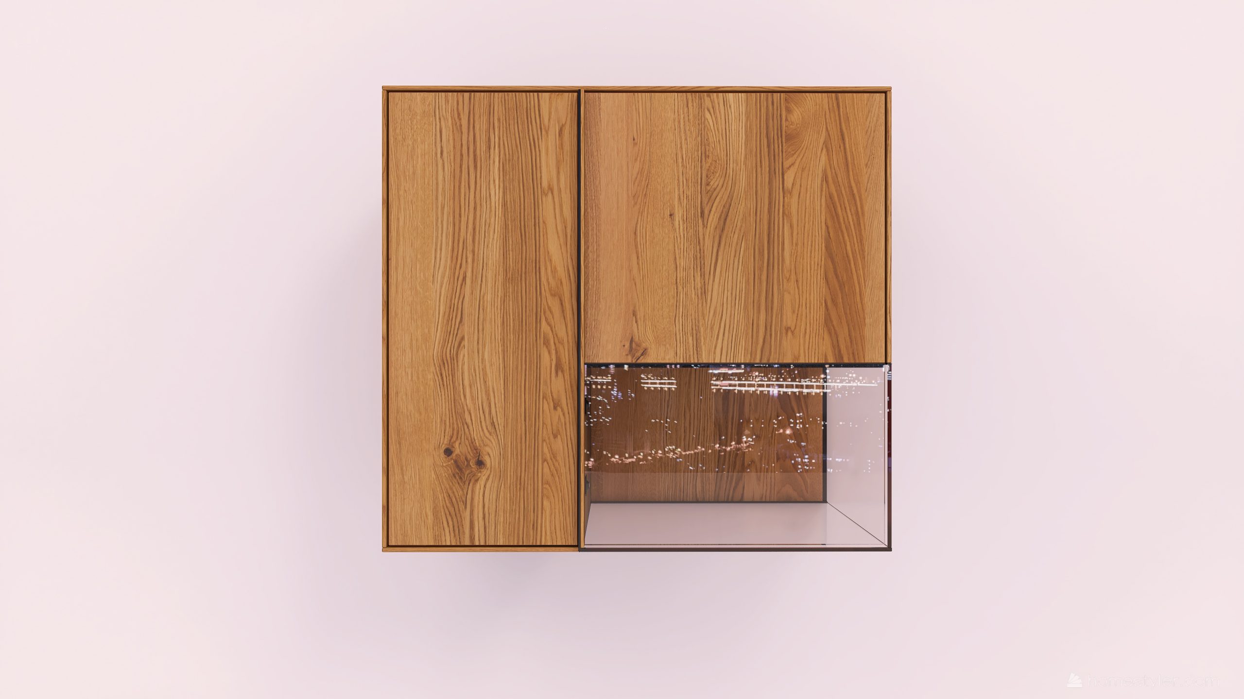 Tömörfa faliszekrény, egy nyíló üvegajtóval és egy nyíló fa ajtóval. A keskeny ajtó mögött két polccal az üveges ajtó mögött pedig egy polccal. A hátfal anyaga az üveges rész mögött ( pala, kerámia) valamint a világítás opcióként választható.
