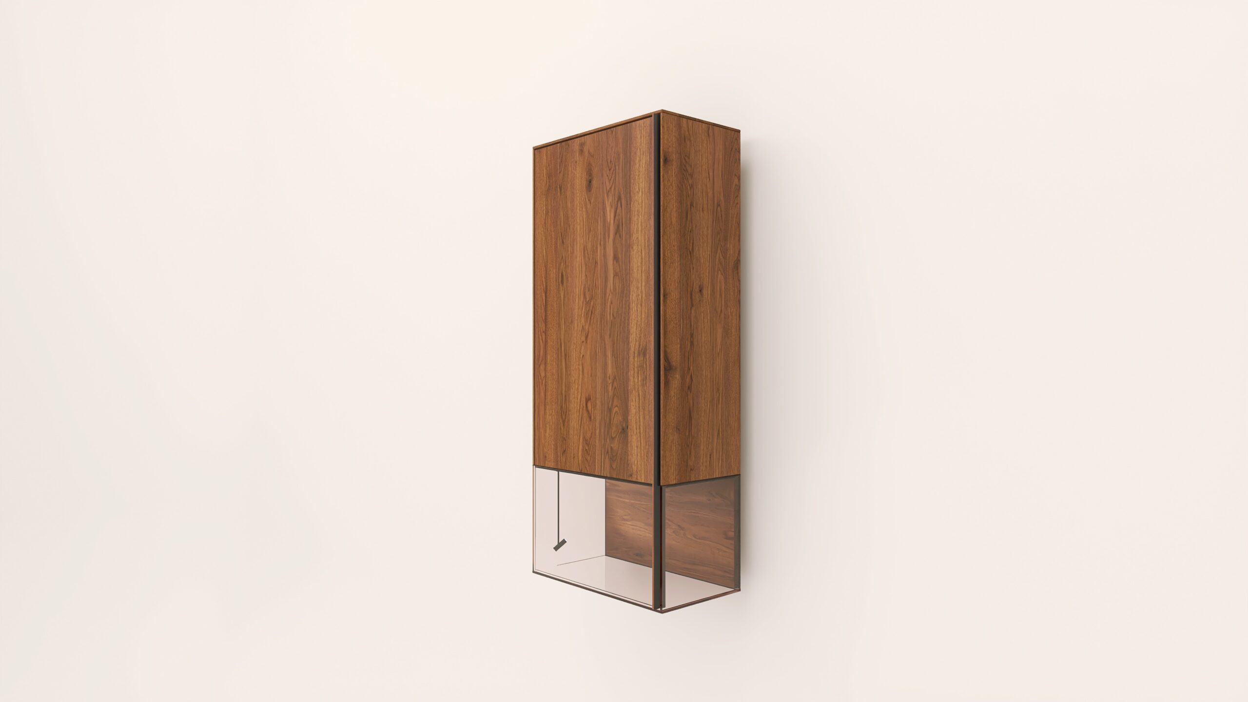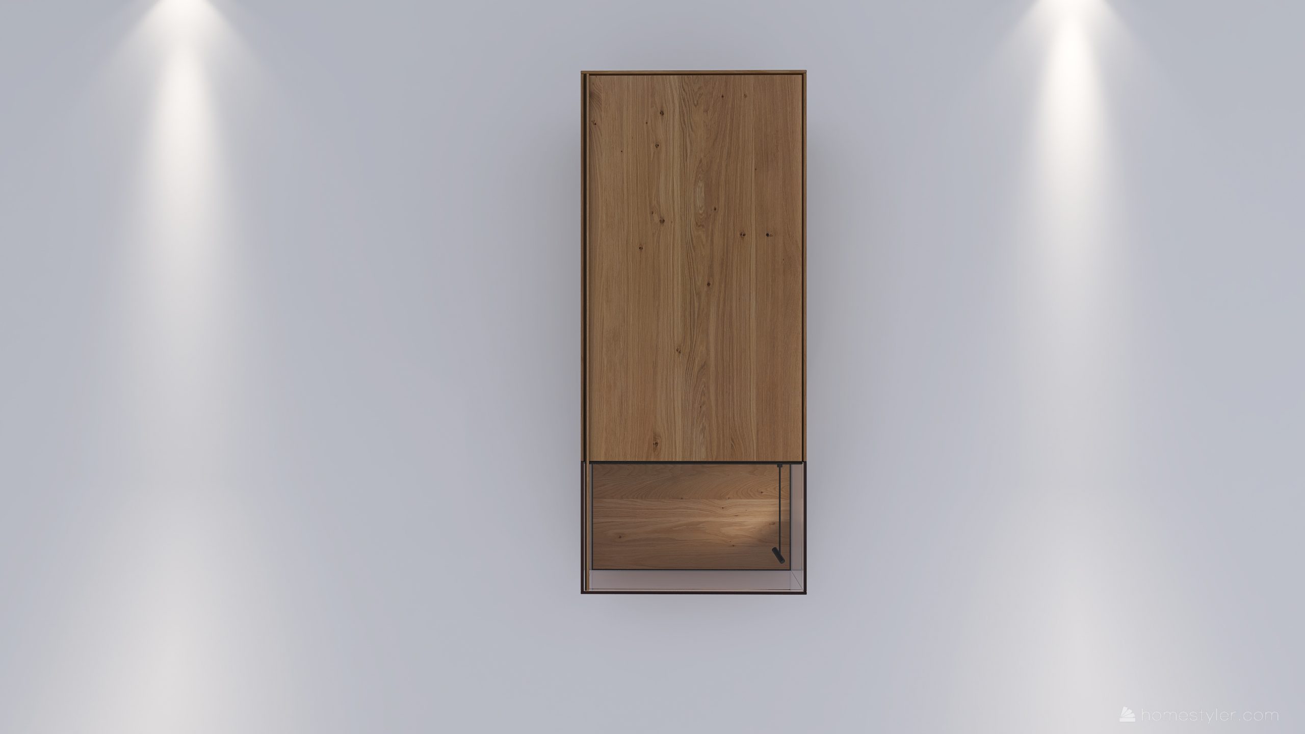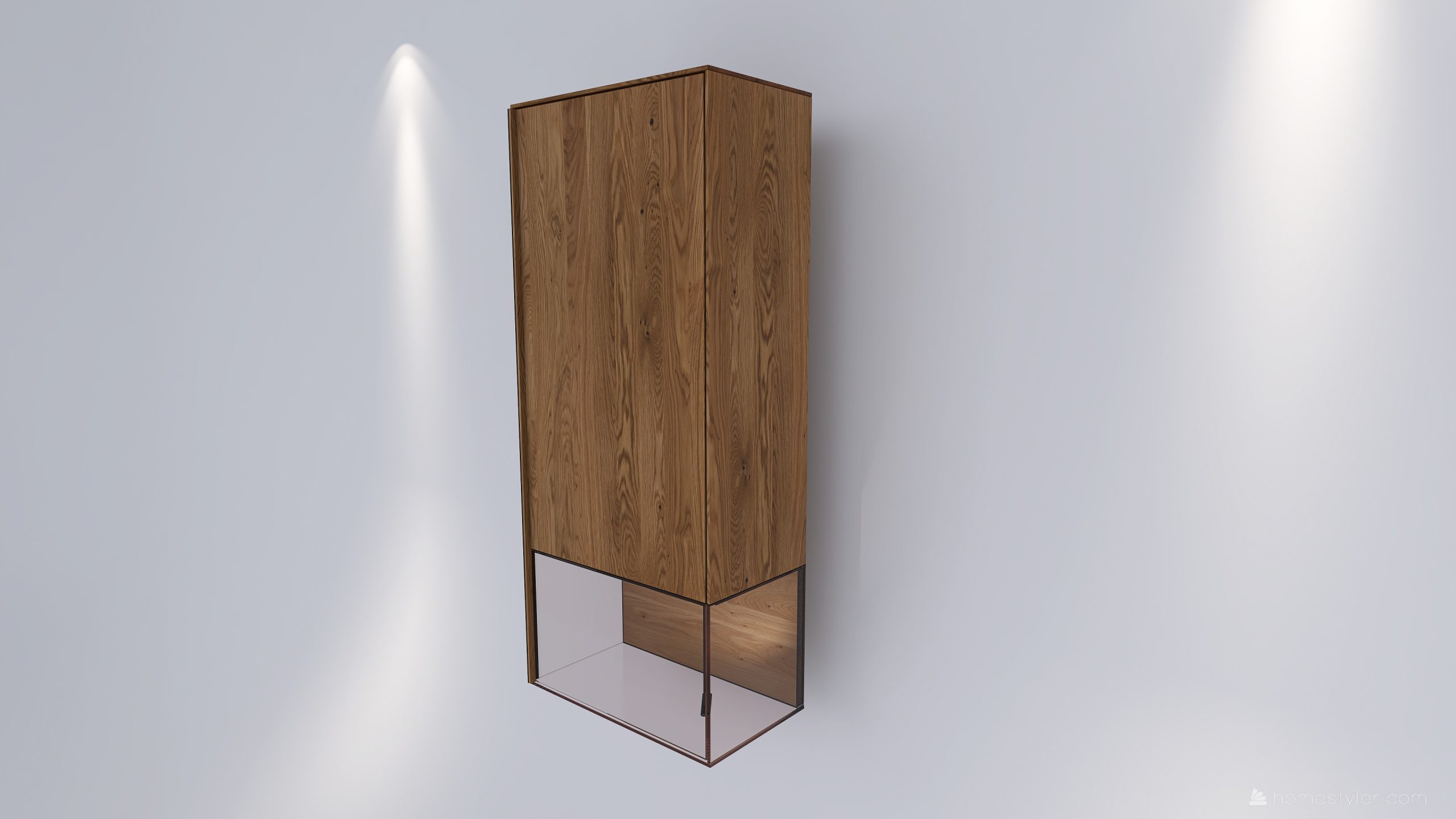 Tömörfa faliszekrény, egy nyíló üvegajtóval mögötte két polccal. A hátfal anyaga az üveges rész mögött ( pala, kerámia) valamint a világítás opcióként választható. Jobbos és balos kivitelben.