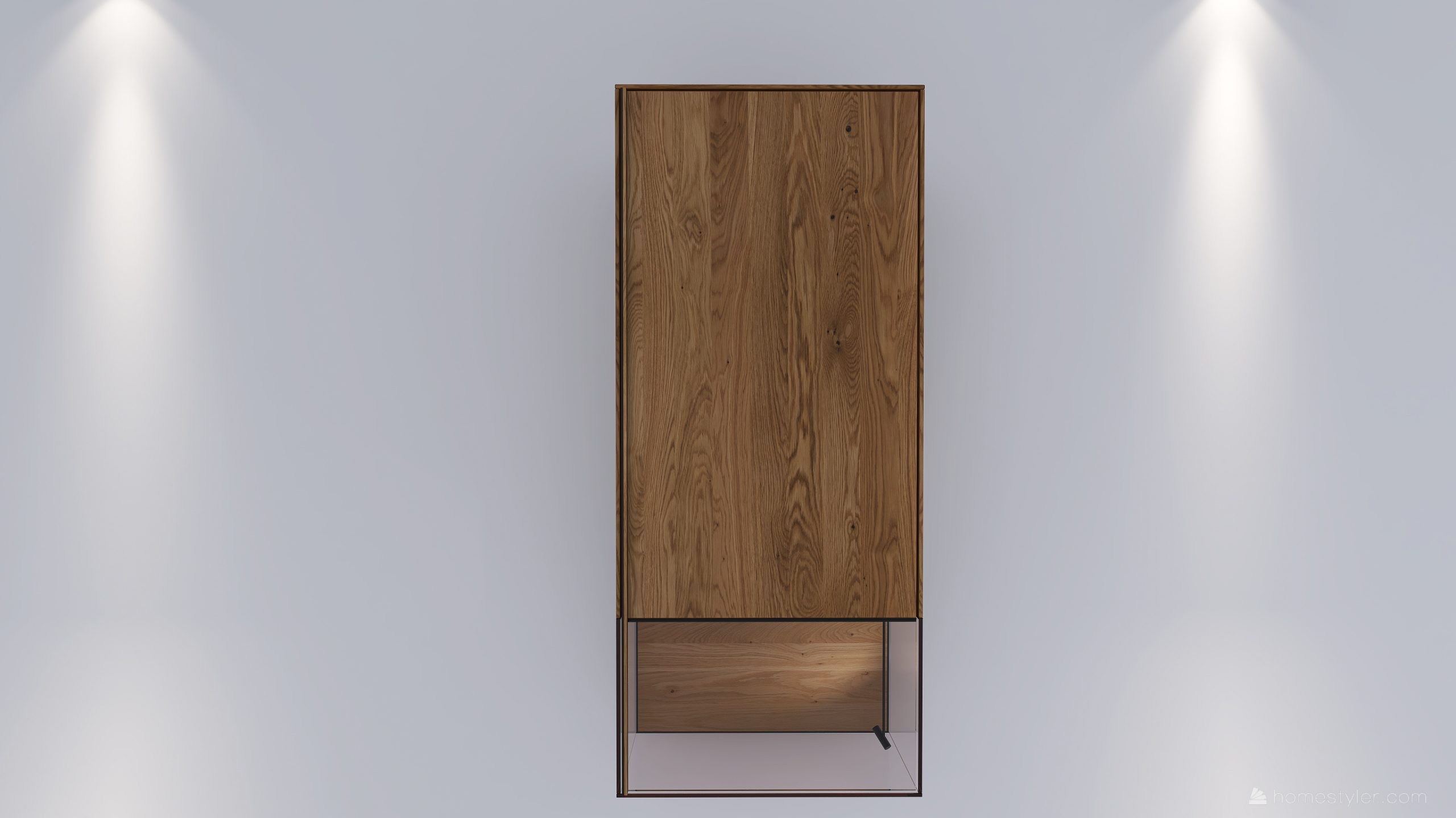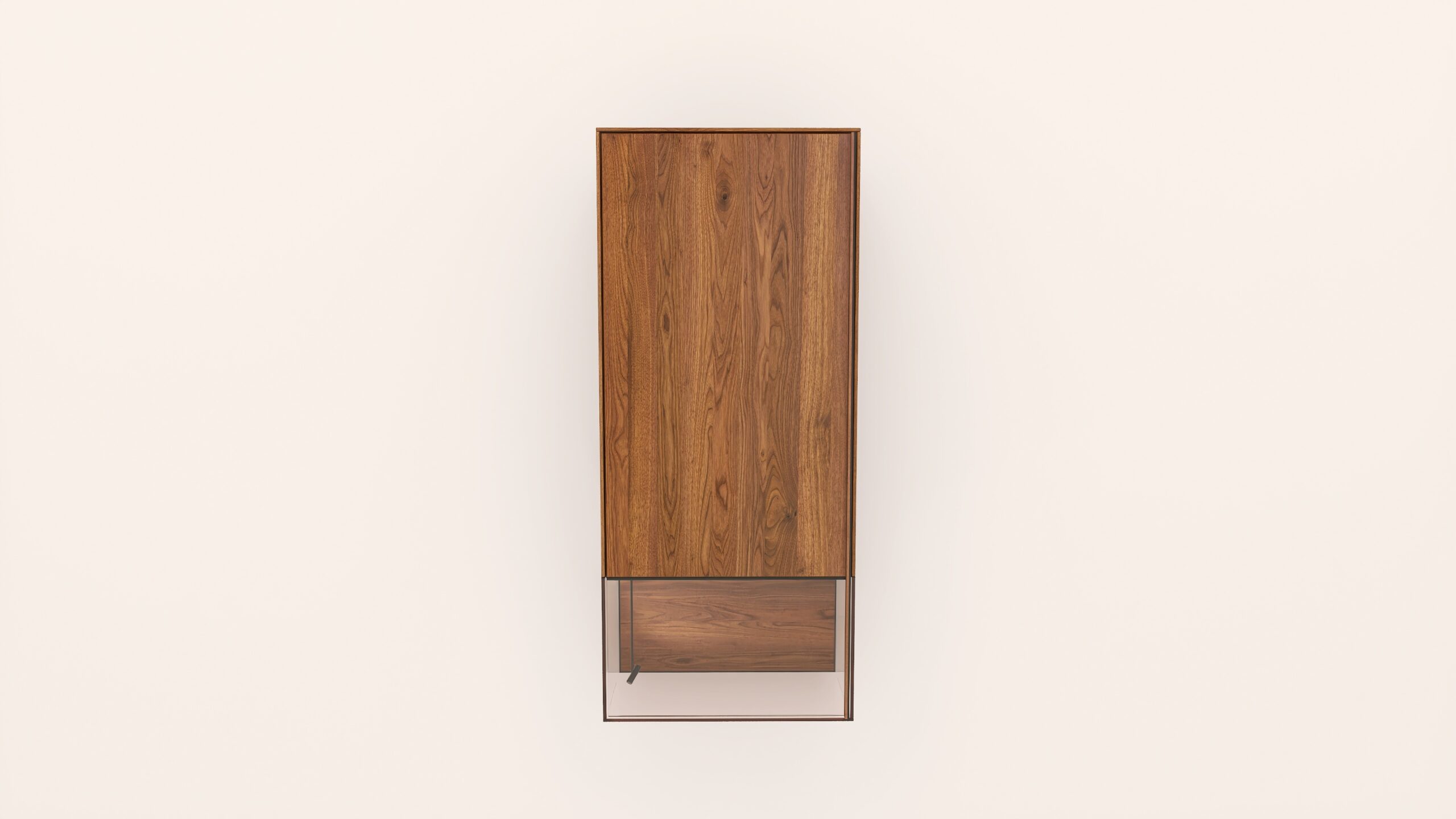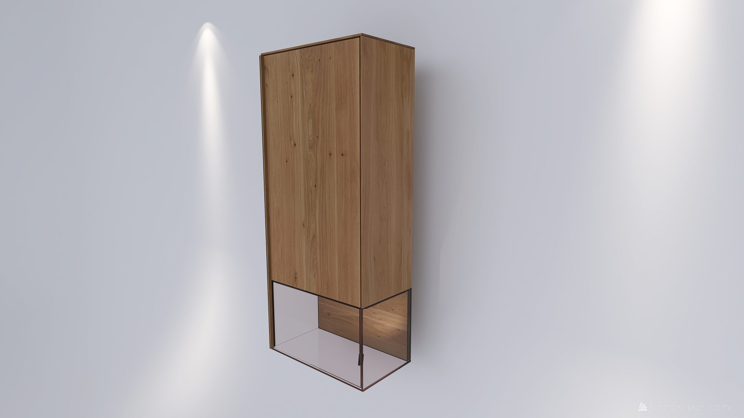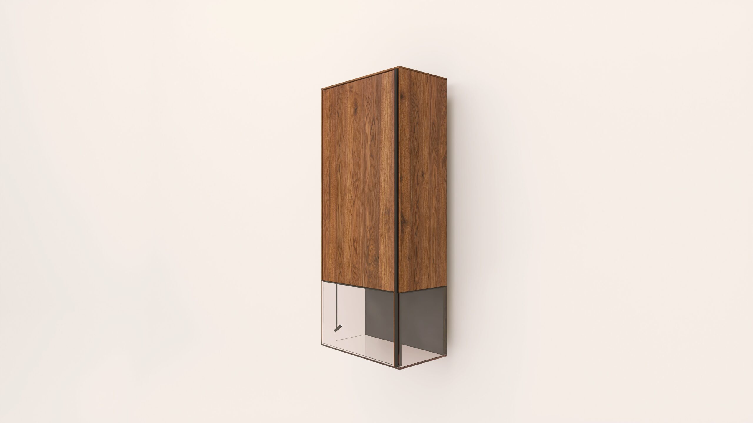 Tömörfa faliszekrény, egy nyíló üvegajtóval mögötte két polccal. A hátfal anyaga az üveges rész mögött ( pala, kerámia) valamint a világítás opcióként választható. Jobbos és balos kivitelben.