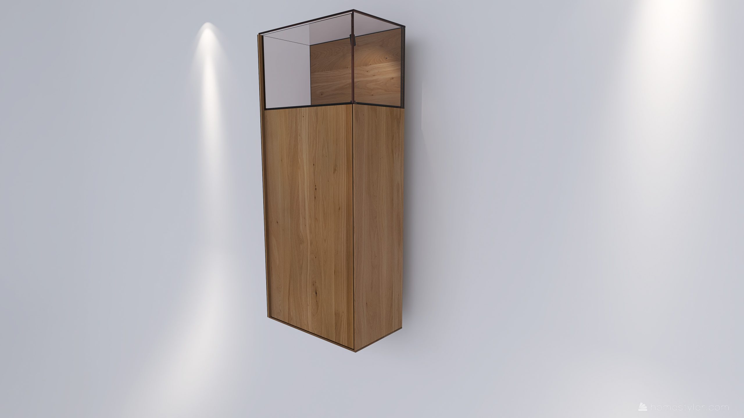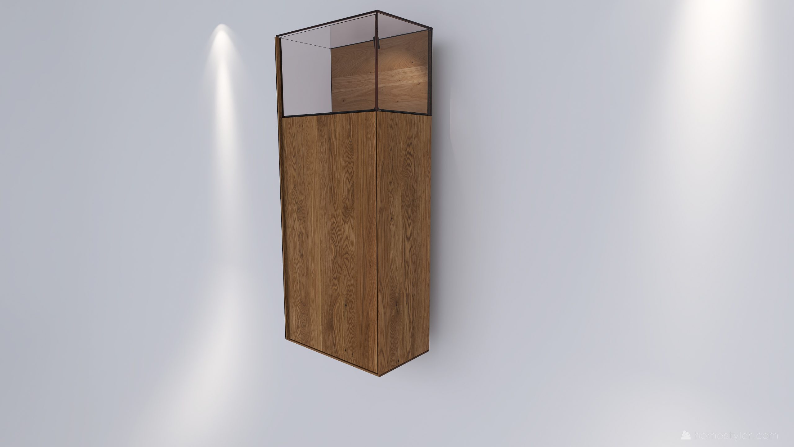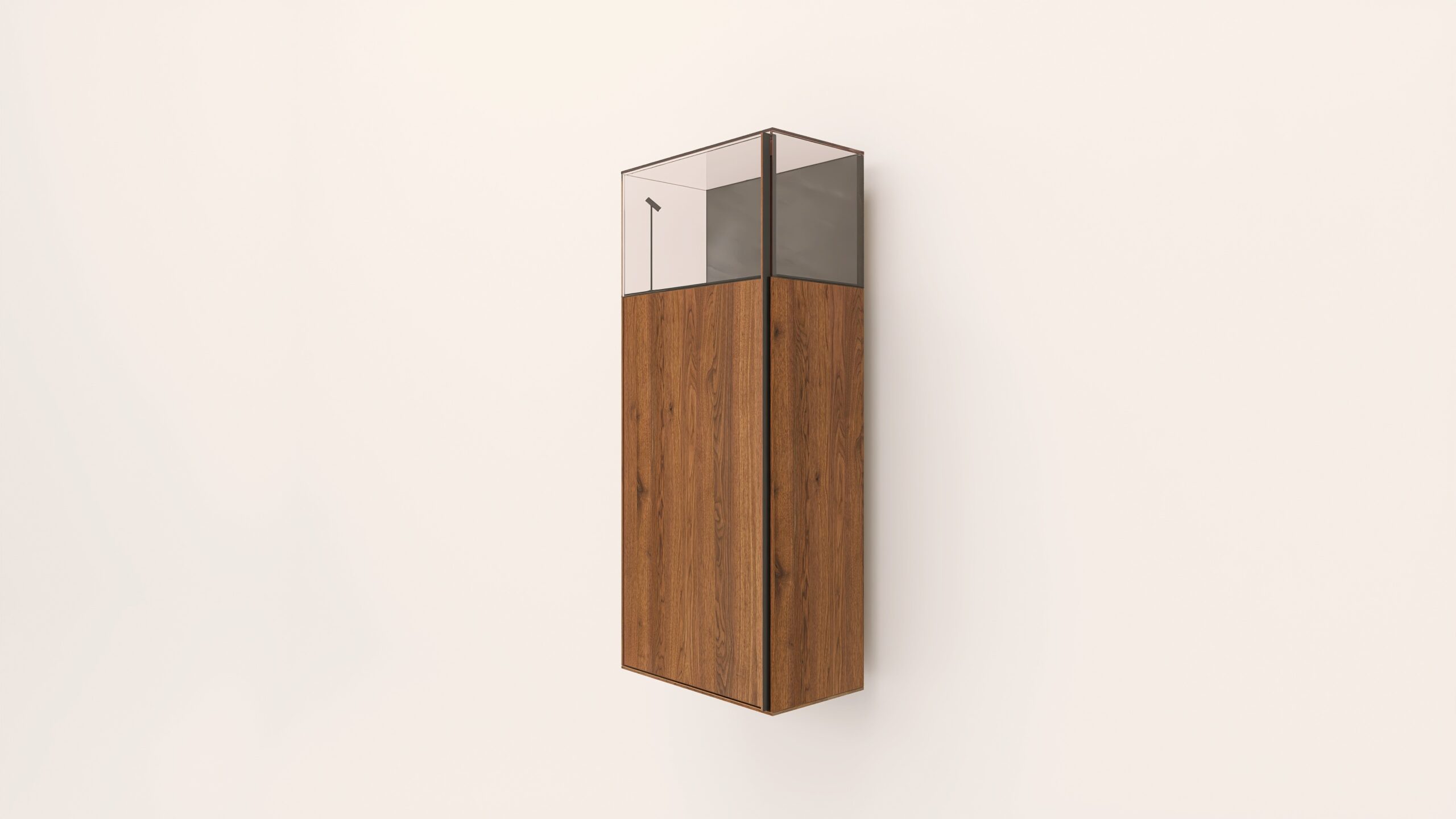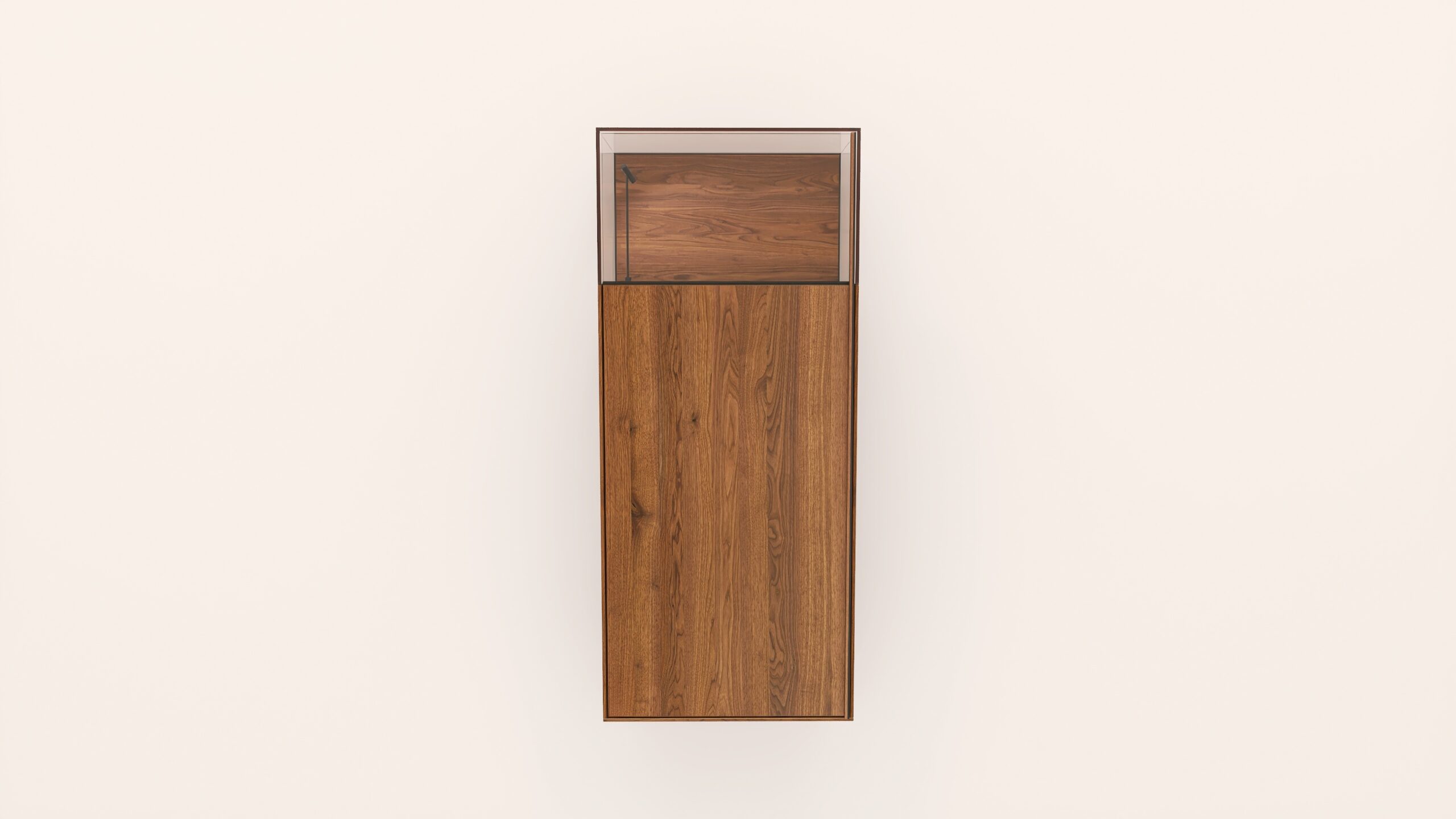 Tömörfa faliszekrény, egy nyíló üvegajtóval, mögötte két polccal. A hátfal anyaga az üveges rész mögött ( pala, kerámia) valamint a világítás opcióként választható. Jobbos és balos kivitelben.