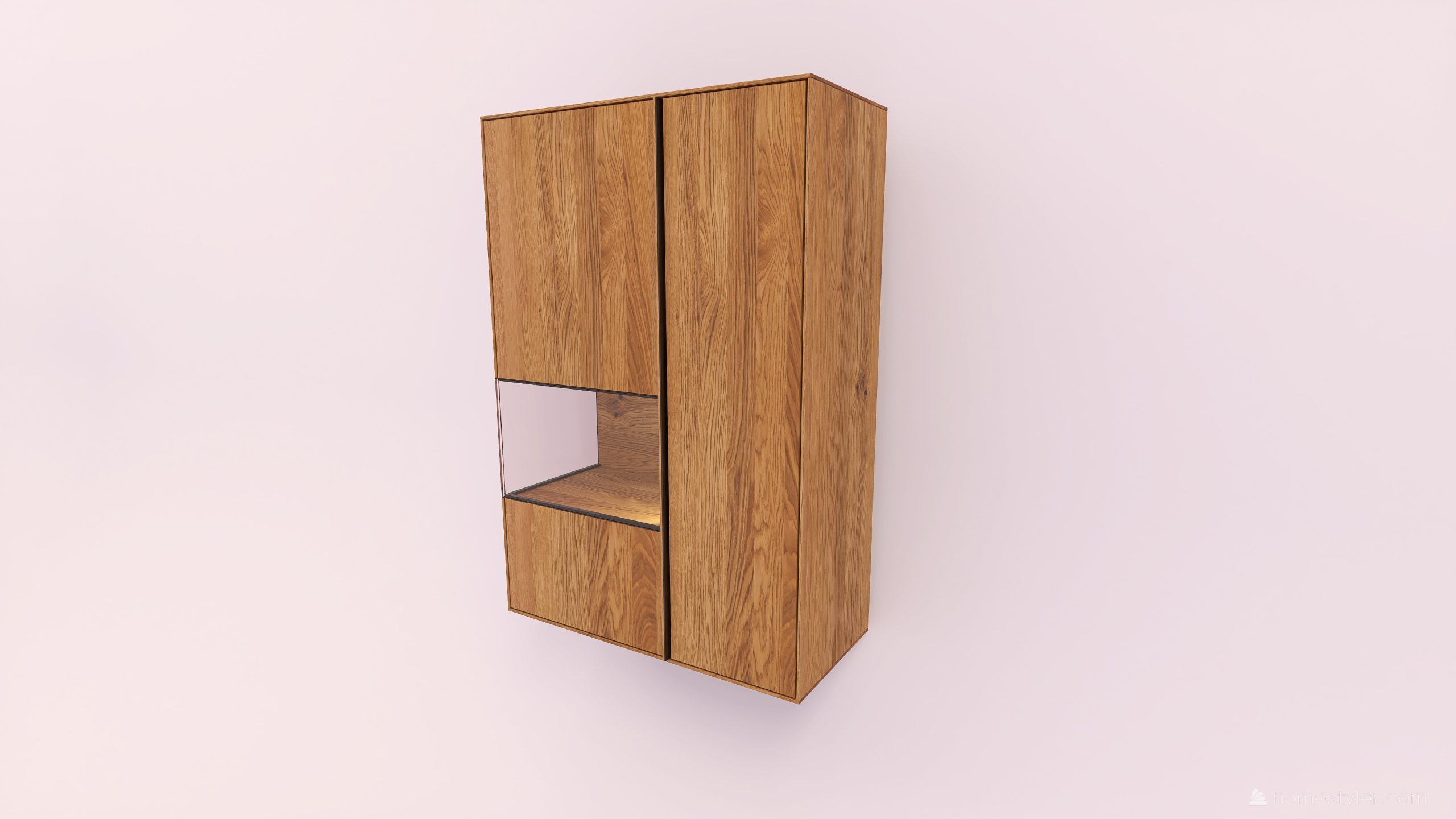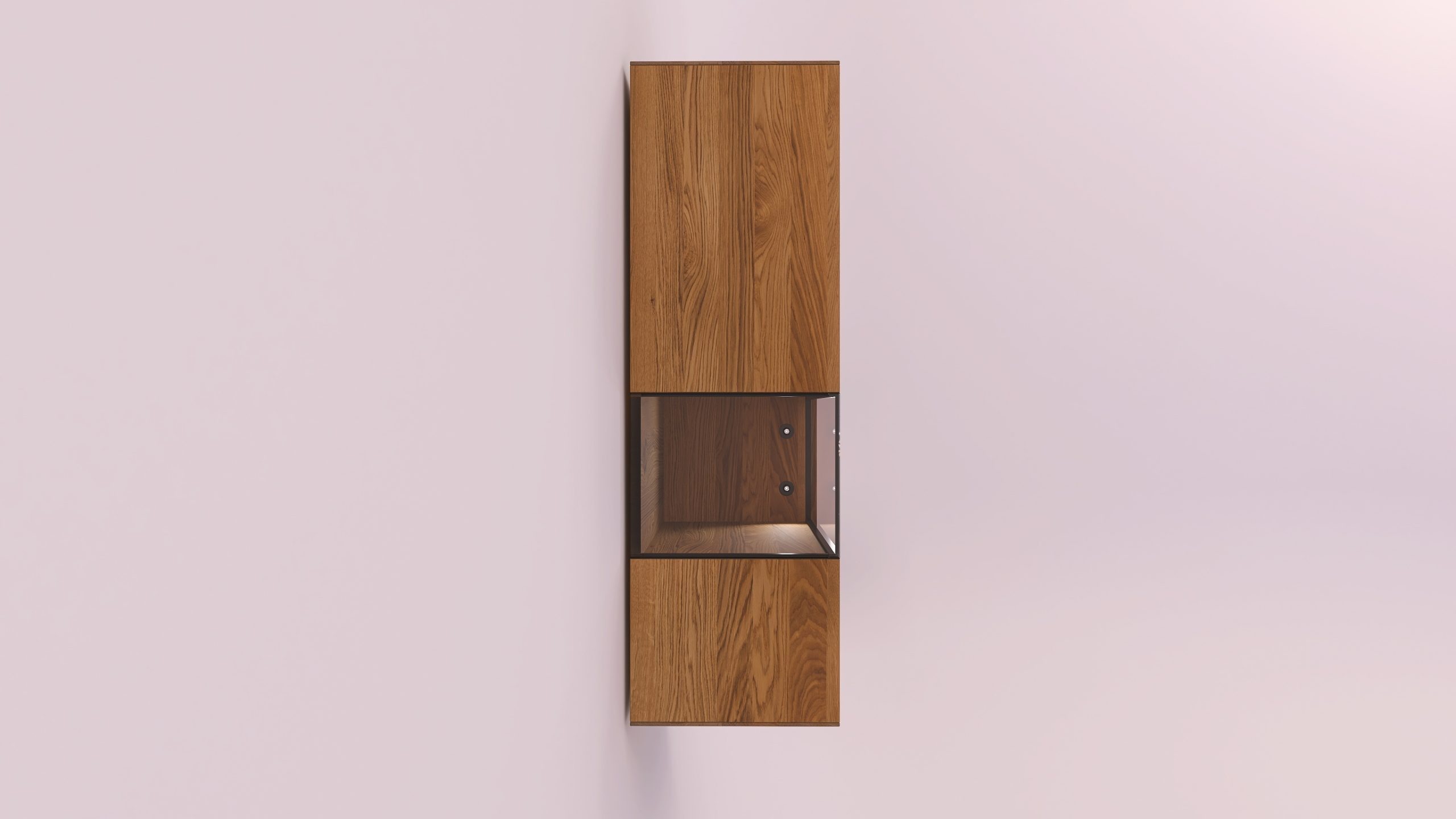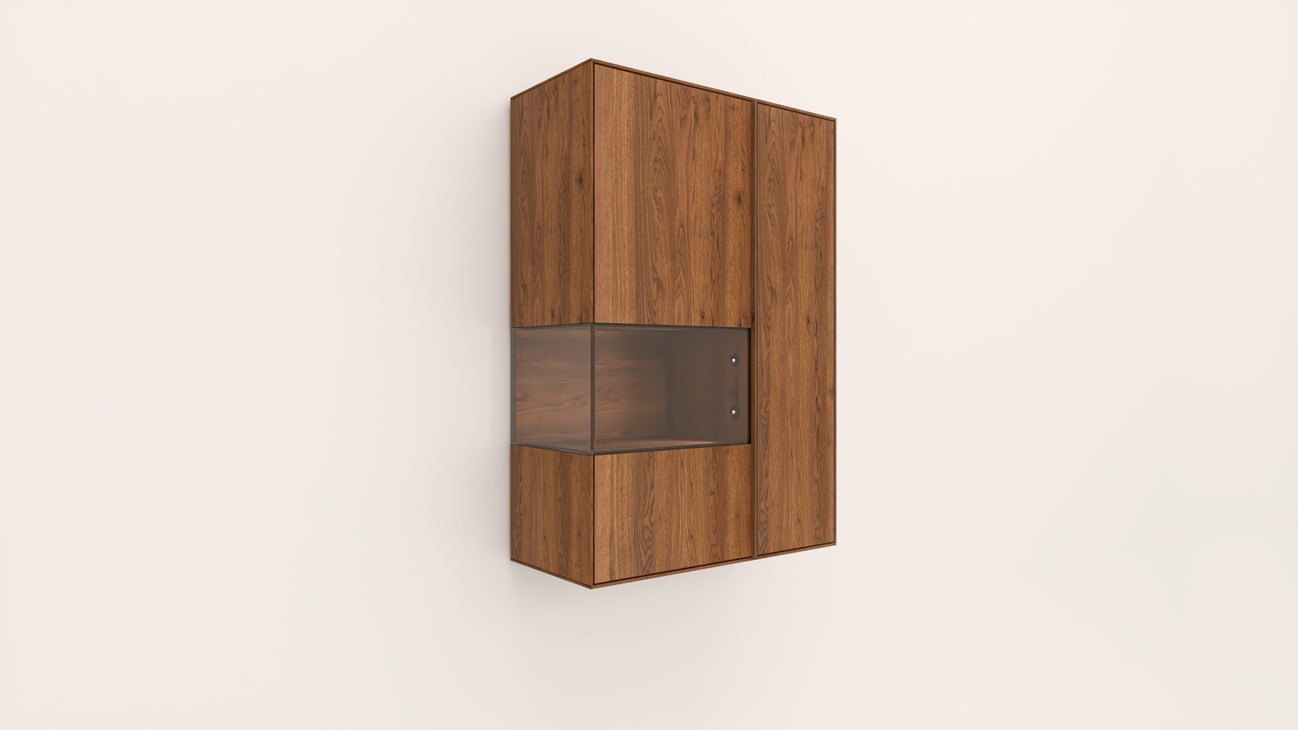 Tömöra faliszekrény, egy nyíló üvegajtóval és egy nyíló fa ajtóval. A keskeny ajtó mögött három polccal az üveges ajtó mögött pedig egy polccal. A hátfal anyaga az üveges rész mögött ( pala, kerámia) valamint a világítás opcióként választható.