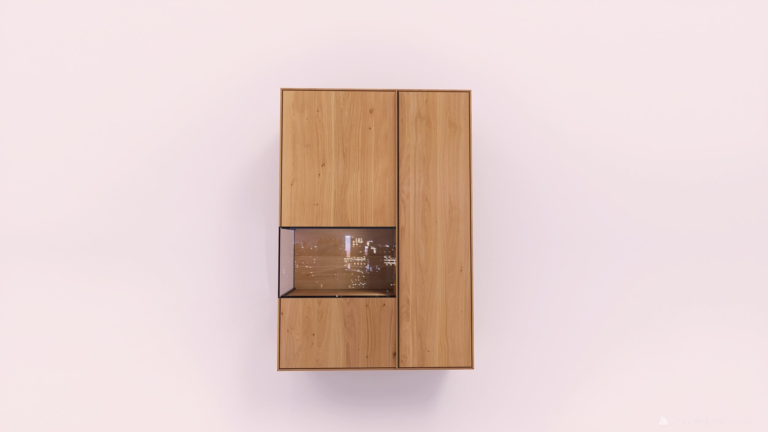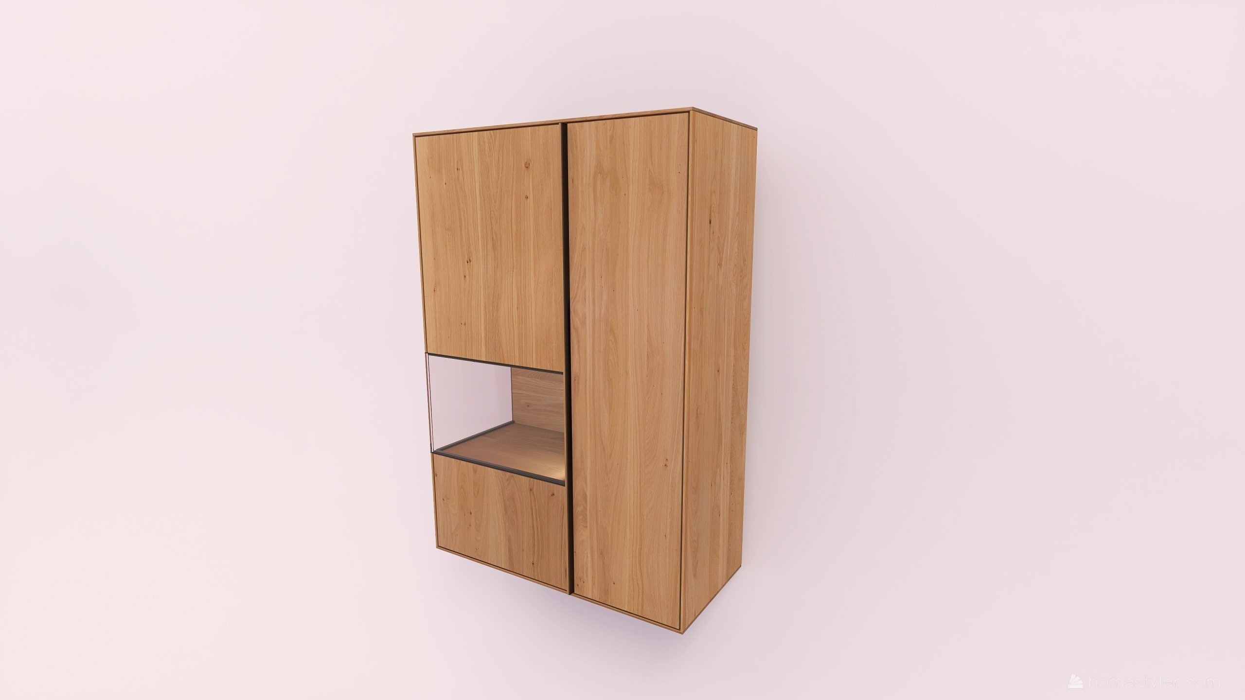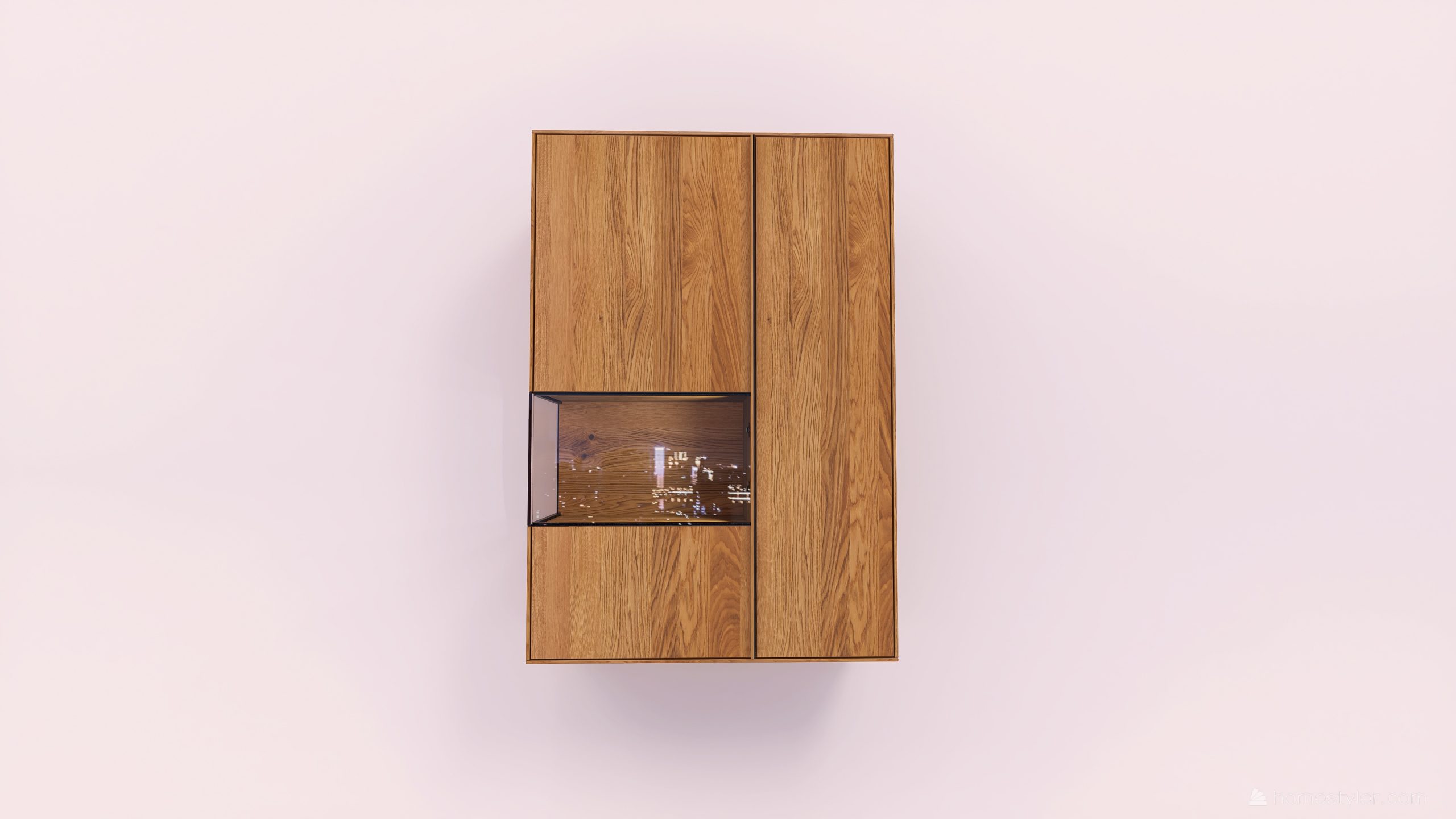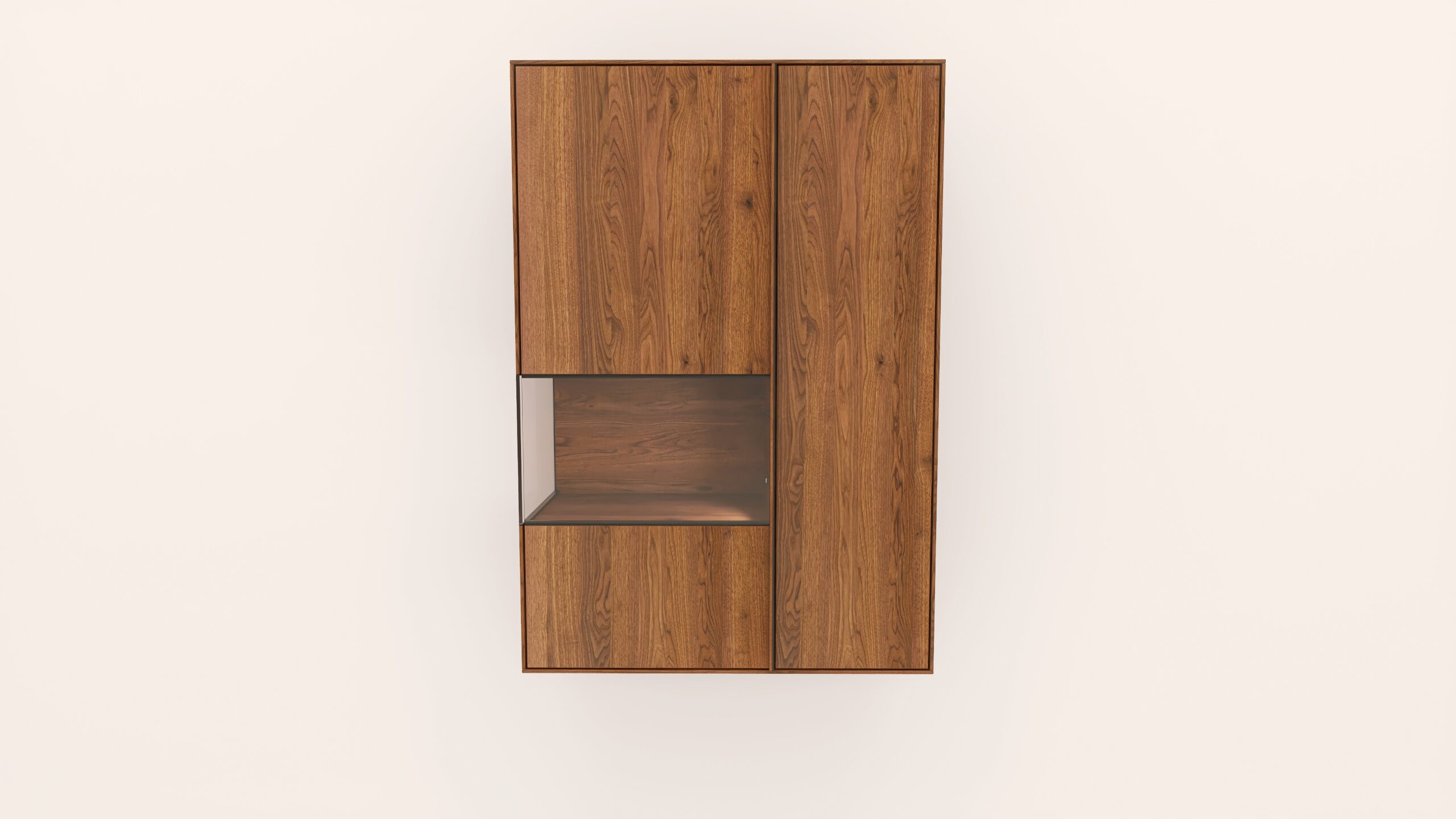 Tömöra faliszekrény, egy nyíló üvegajtóval és egy nyíló fa ajtóval. A keskeny ajtó mögött három polccal az üveges ajtó mögött pedig egy polccal. A hátfal anyaga az üveges rész mögött ( pala, kerámia) valamint a világítás opcióként választható.