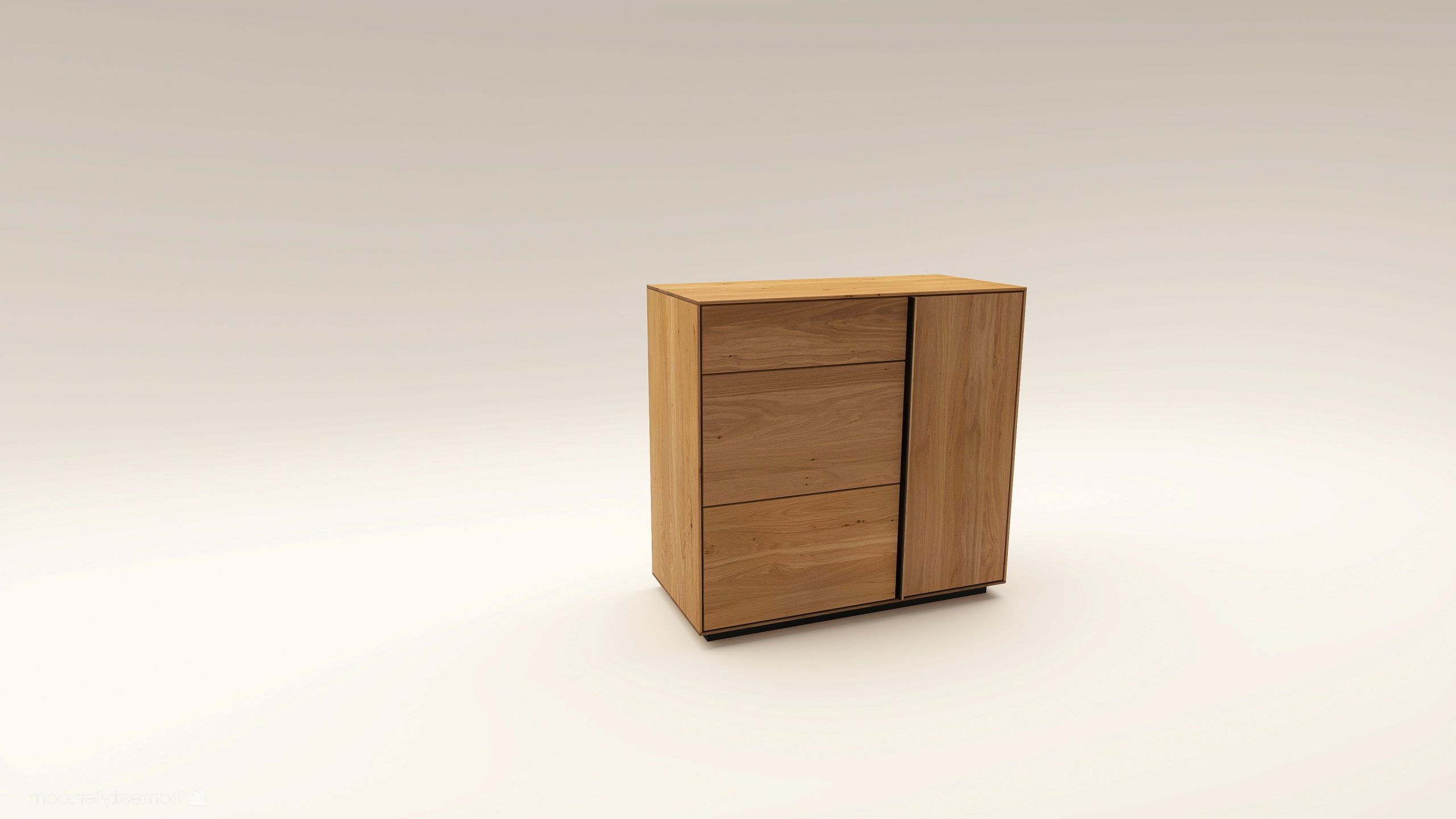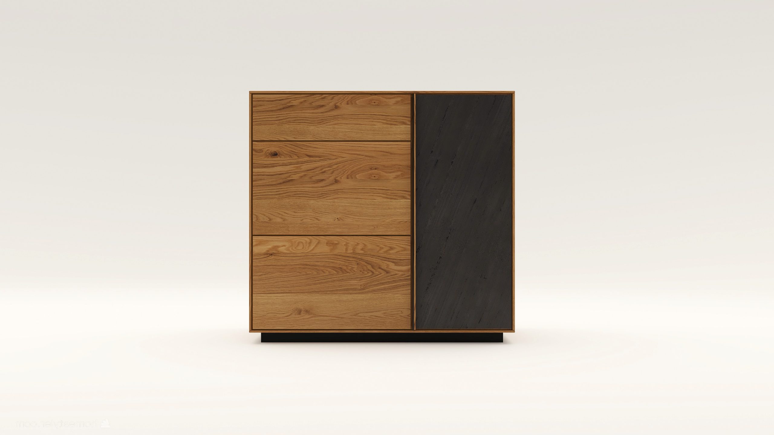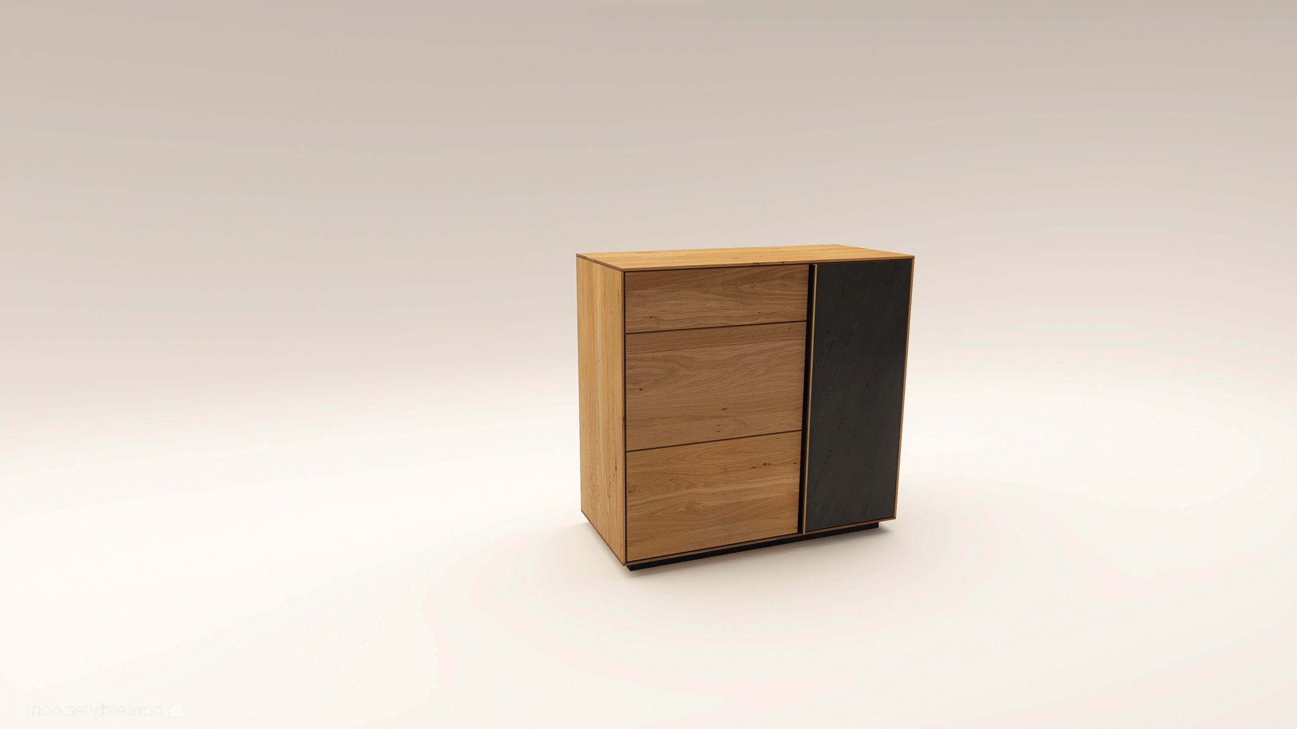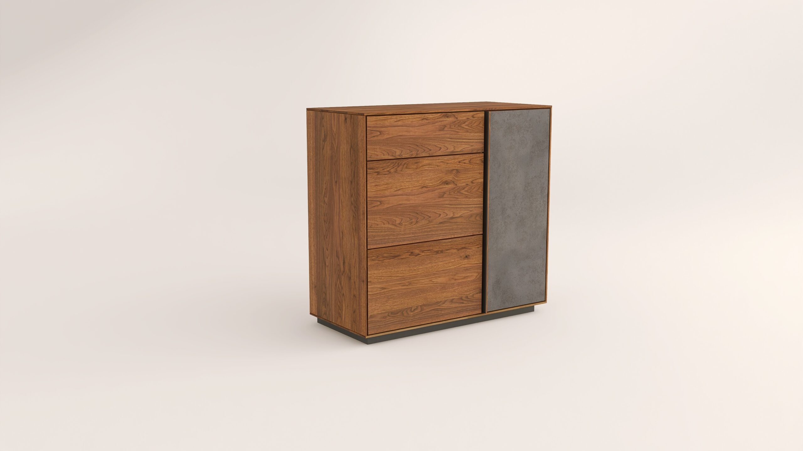 Tömörfa komód egy nyíló ajtóval mögötte két polccal, egy keskeny és két mély fiókkal. A nyíló ajtó frontfelülete szürke kerámiával vagy kőfurnérral rendelhető. Az evőeszköztartó opcióként választható. A lábazat magassága 40 mm.