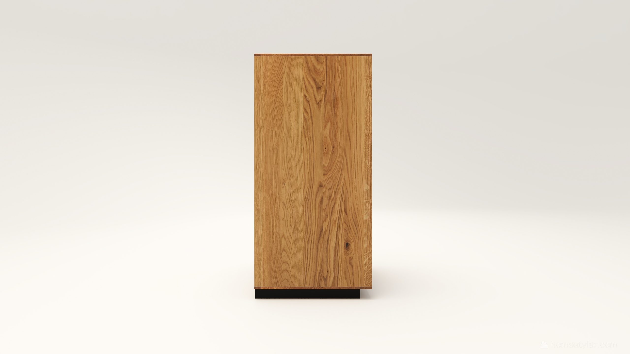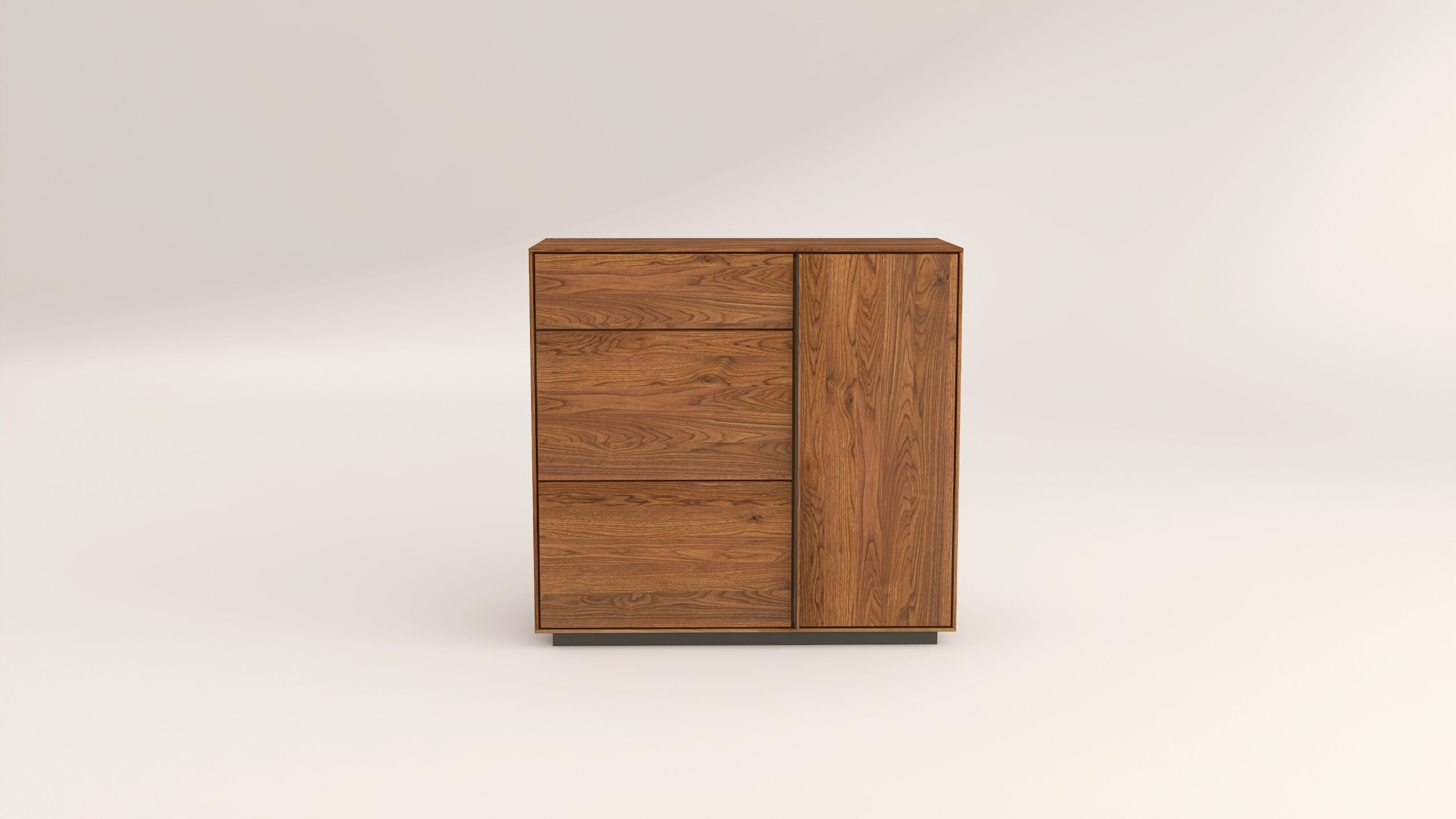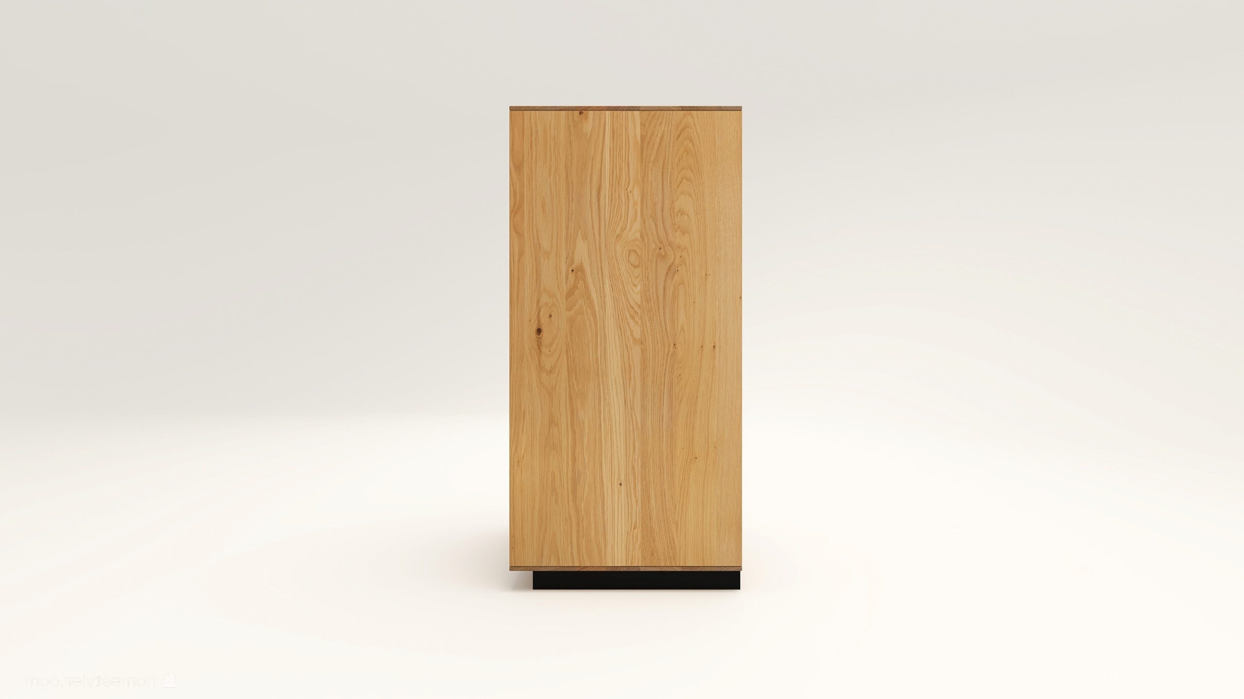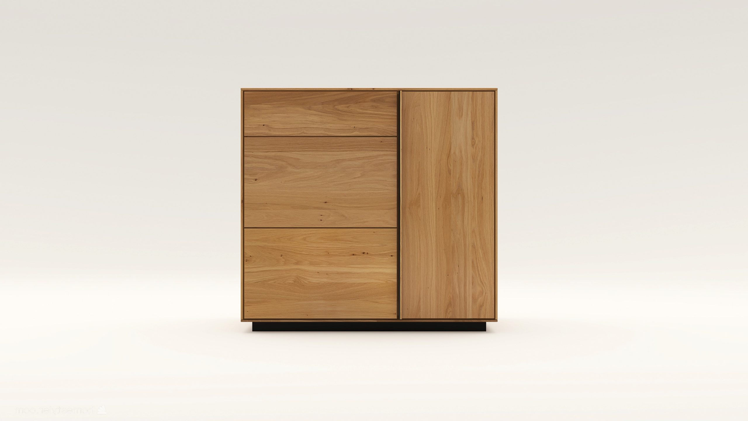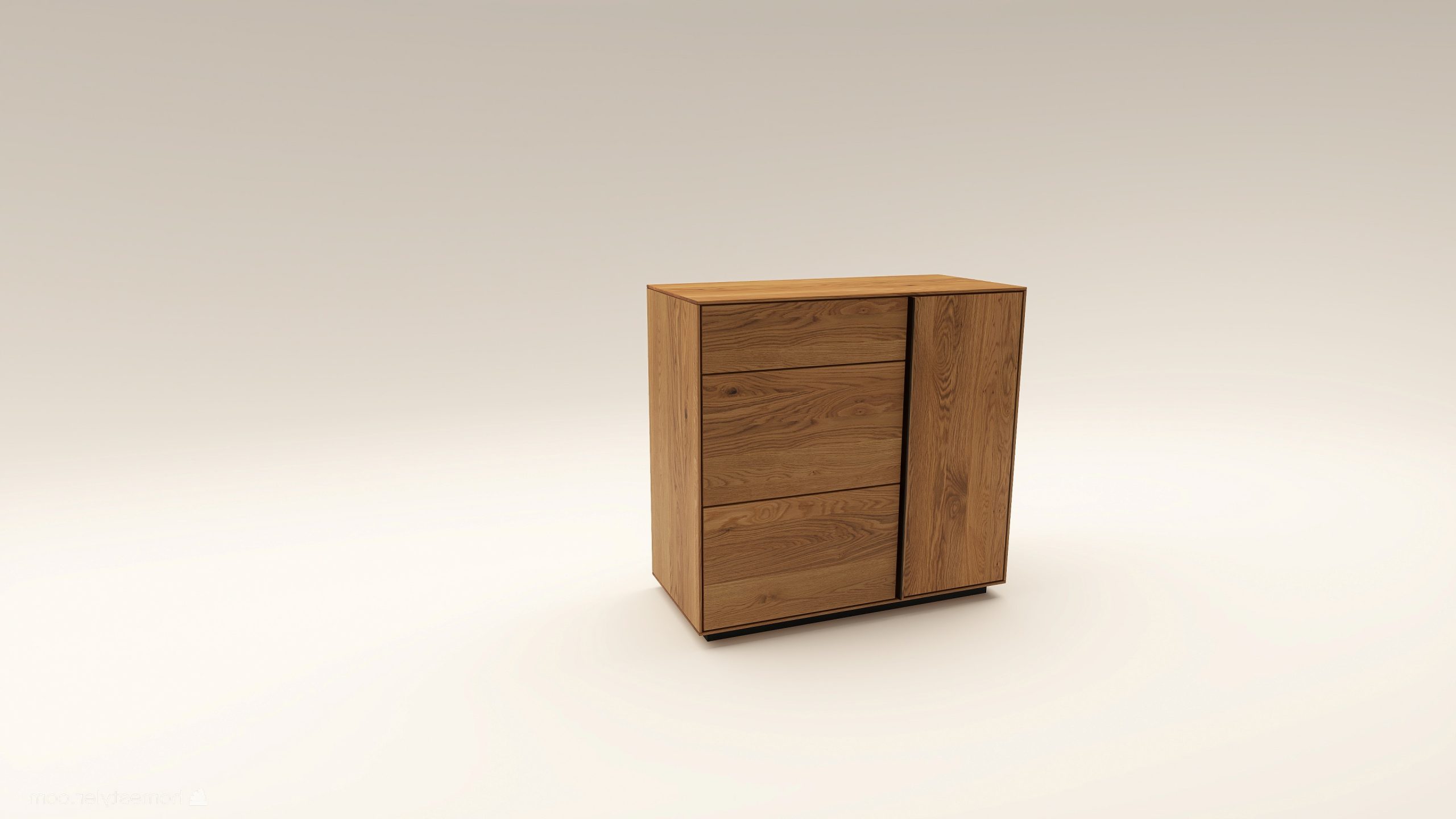 Tömörfa komód egy nyíló ajtóval mögötte két polccal, egy keskeny és két mély fiókkal. A nyíló ajtó frontfelülete szürke kerámiával vagy kőfurnérral rendelhető. Az evőeszköztartó opcióként választható. A lábazat magassága 40 mm.