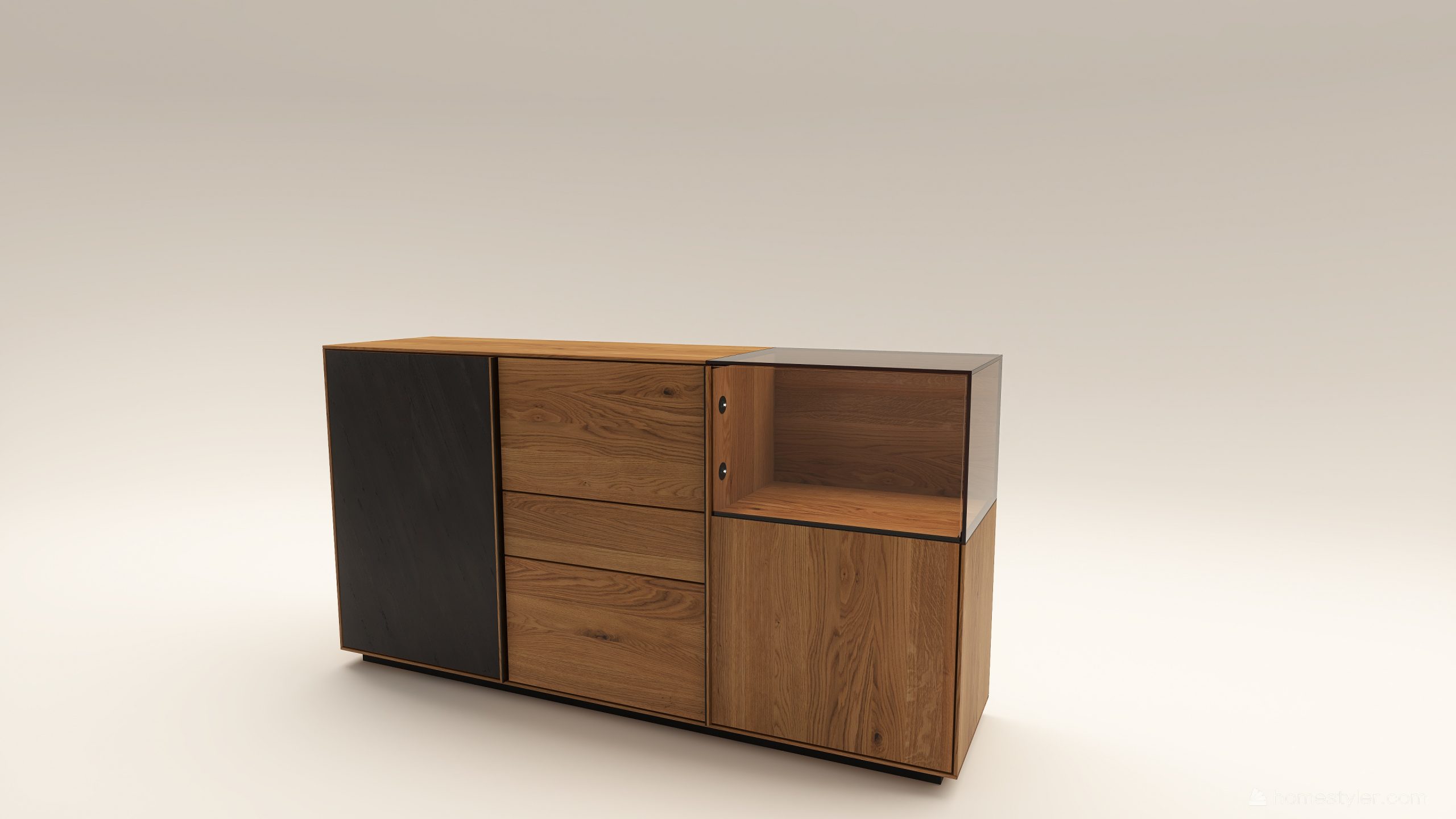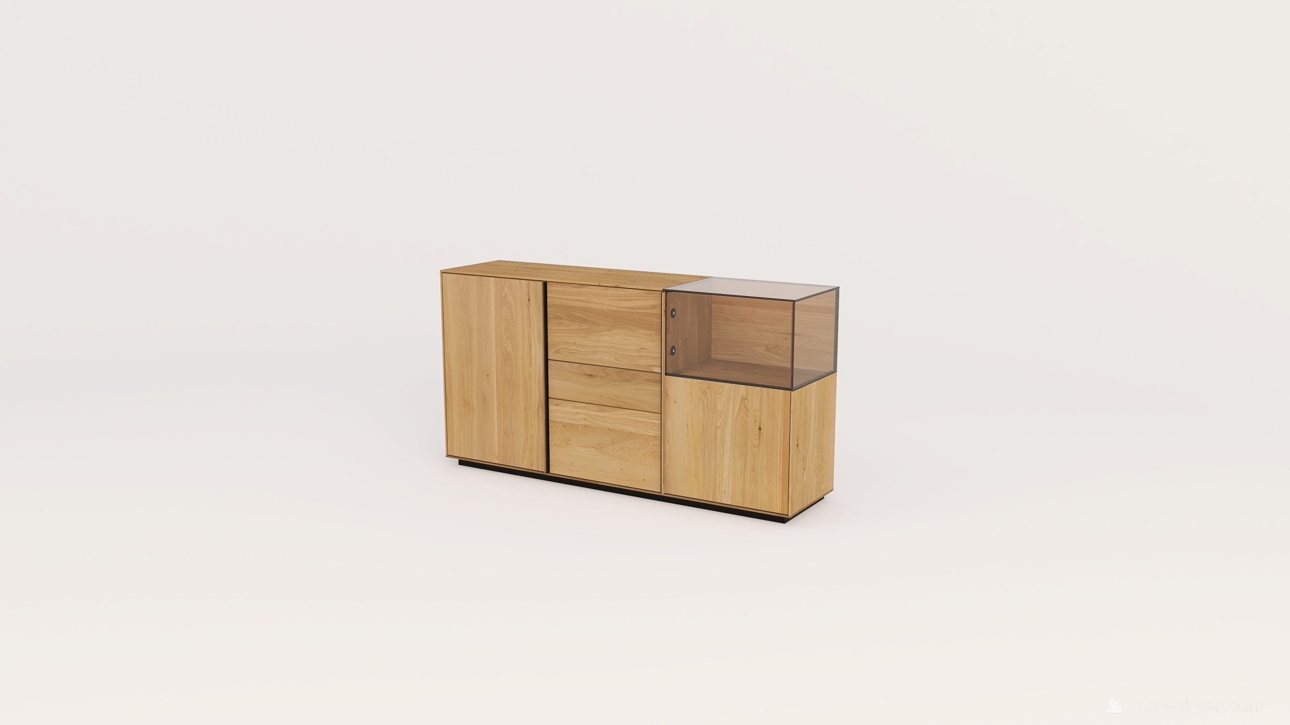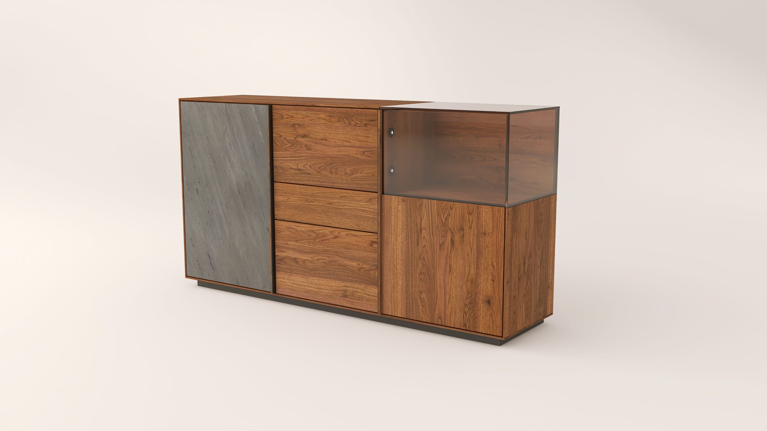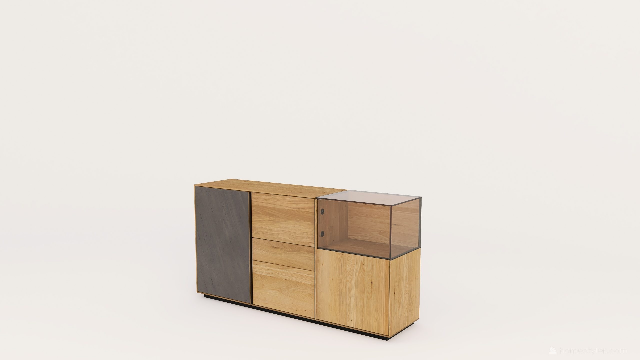 Tömörfa komód egy üveges és egy fa nyíló ajtóval mögötte két polccal, egy keskeny és két mély fiókkal. A fa nyíló ajtó frontfelülete szürke kerámiával vagy kőfurnérral rendelhető. Az evőeszköztartó, a világítás és az üveges rész mögötti hátfal anyaga ( kerámia, kő) opcióként választható.