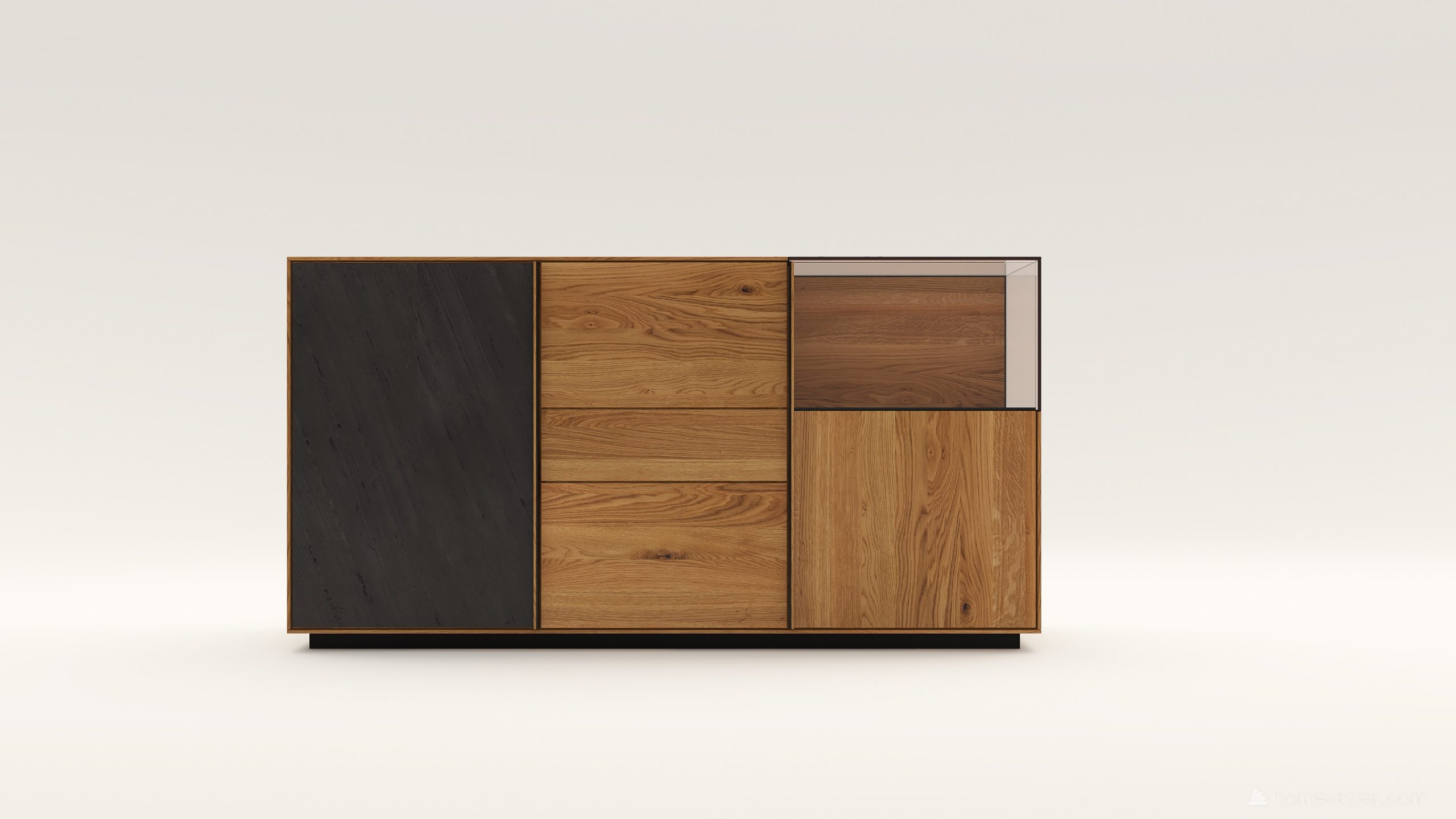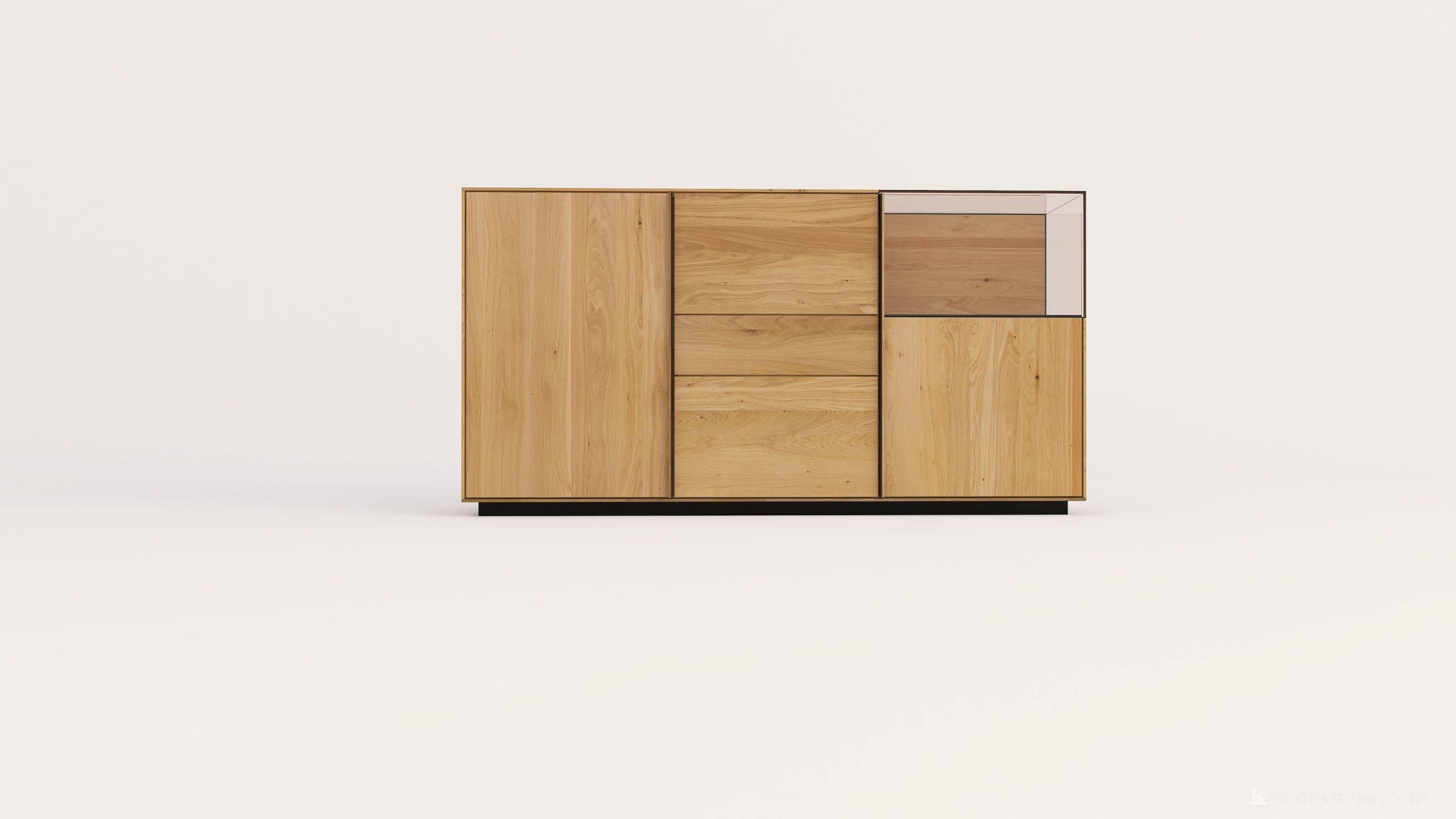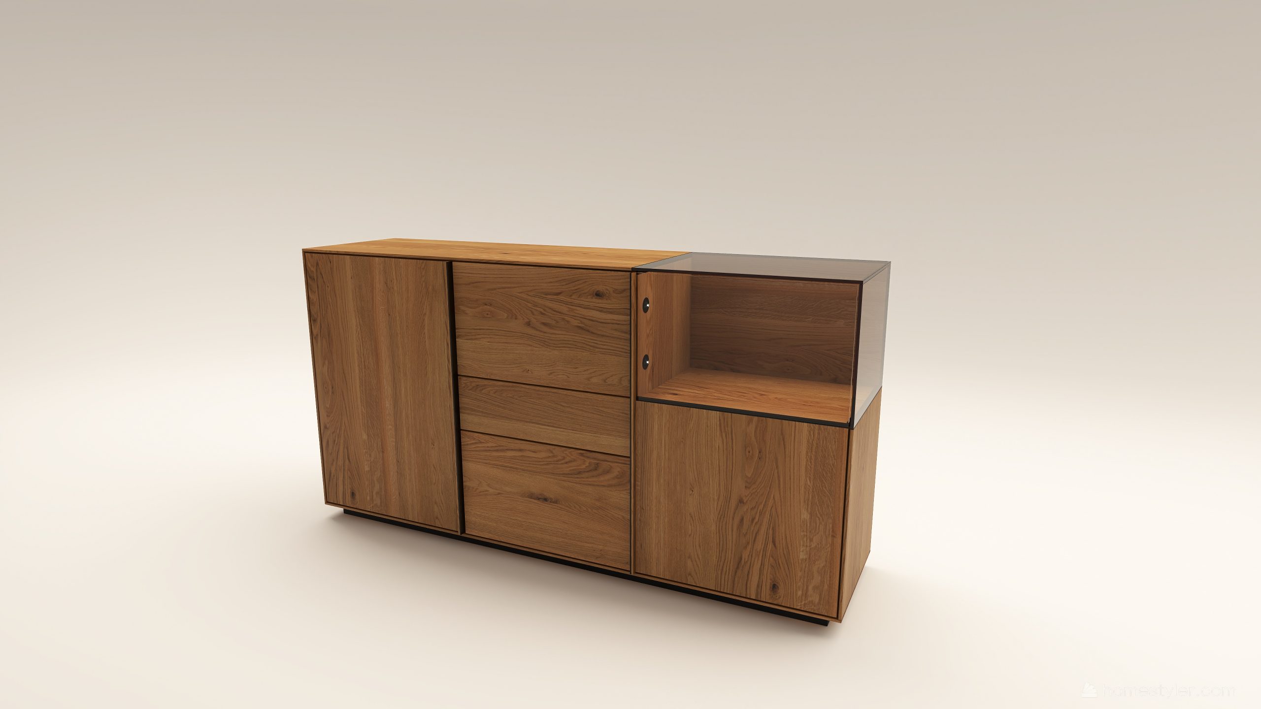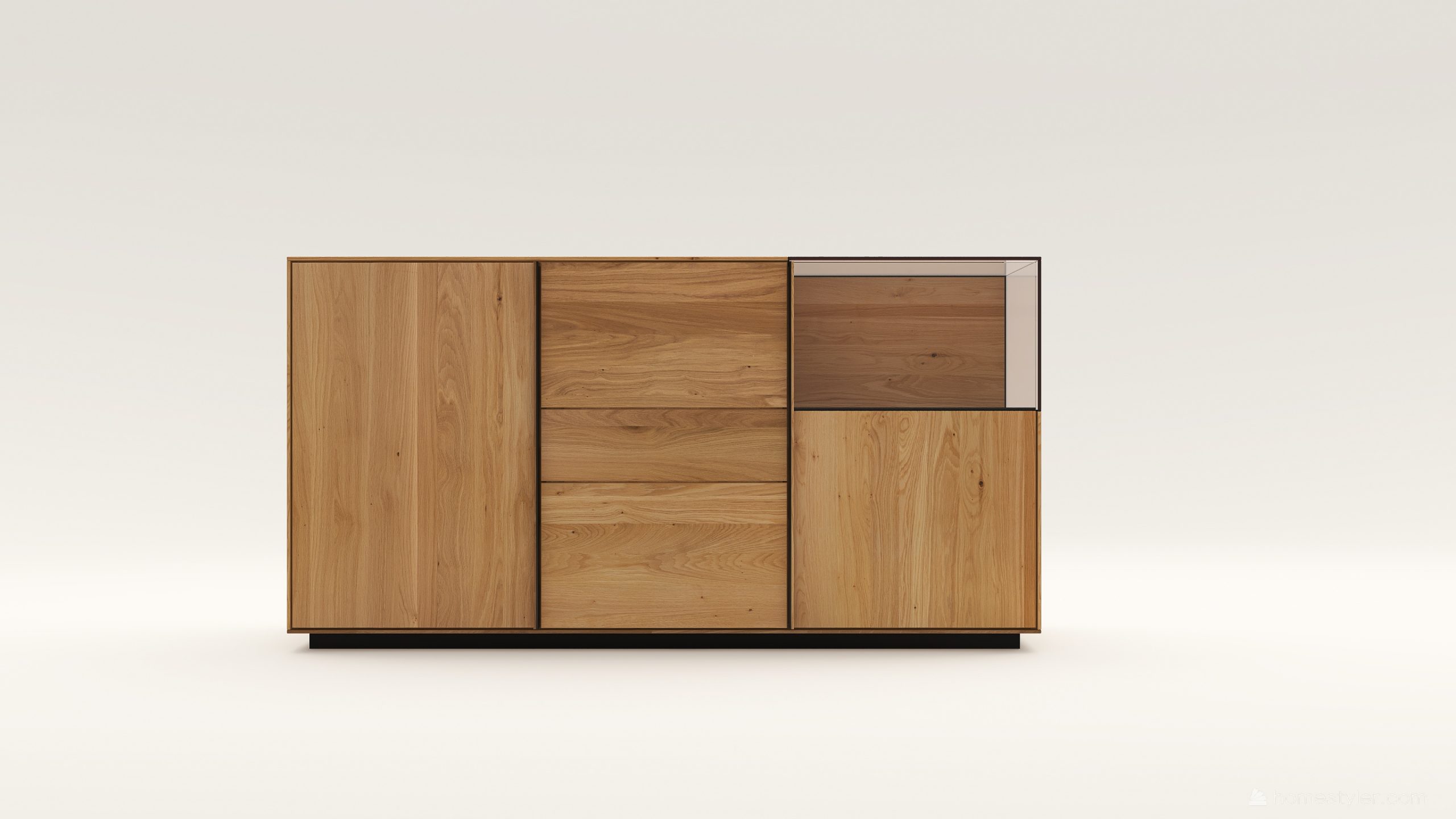 Tömörfa komód egy üveges és egy fa nyíló ajtóval mögötte két polccal, egy keskeny és két mély fiókkal. A fa nyíló ajtó frontfelülete szürke kerámiával vagy kőfurnérral rendelhető. Az evőeszköztartó, a világítás és az üveges rész mögötti hátfal anyaga ( kerámia, kő) opcióként választható.