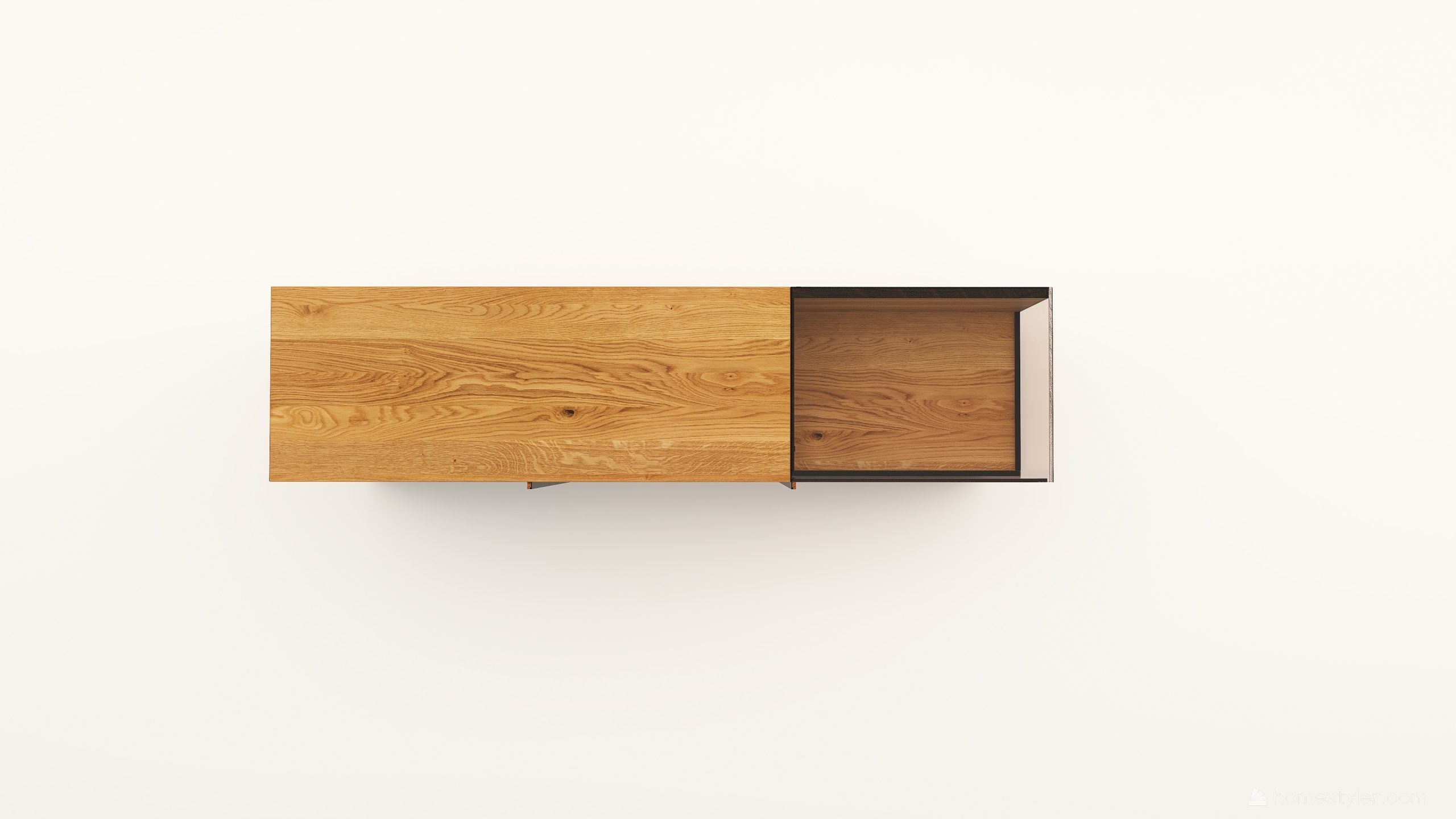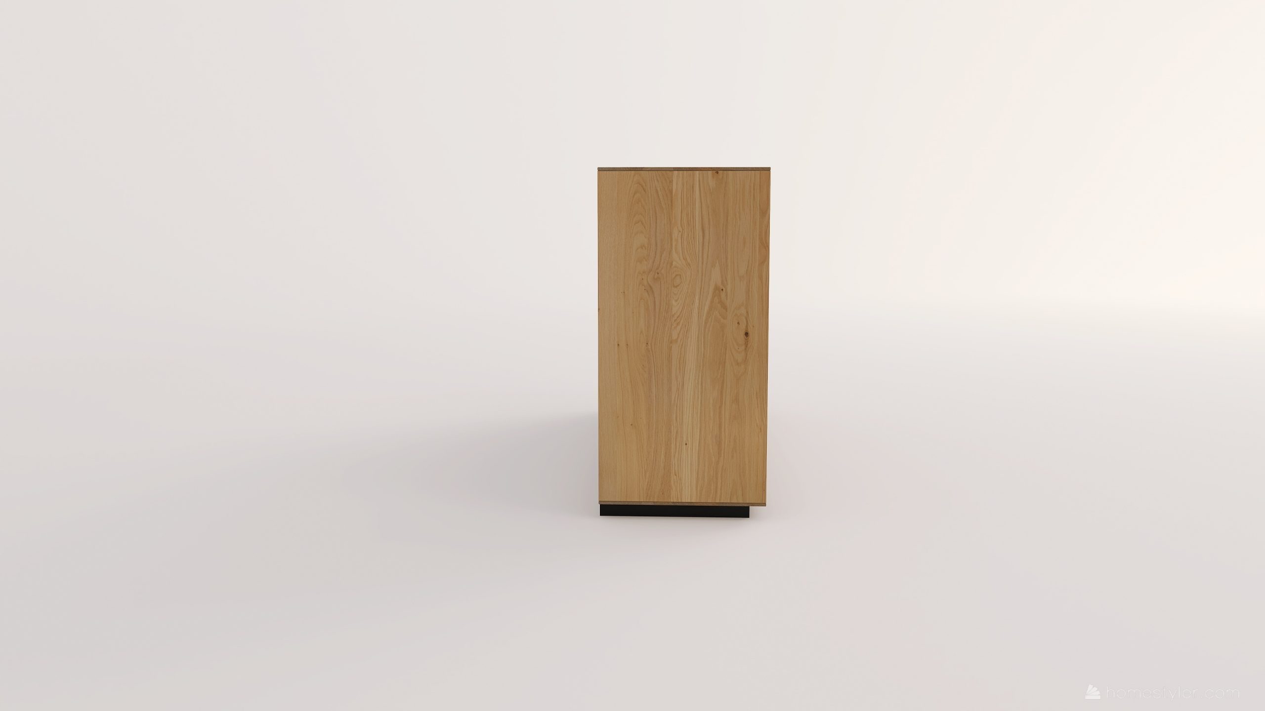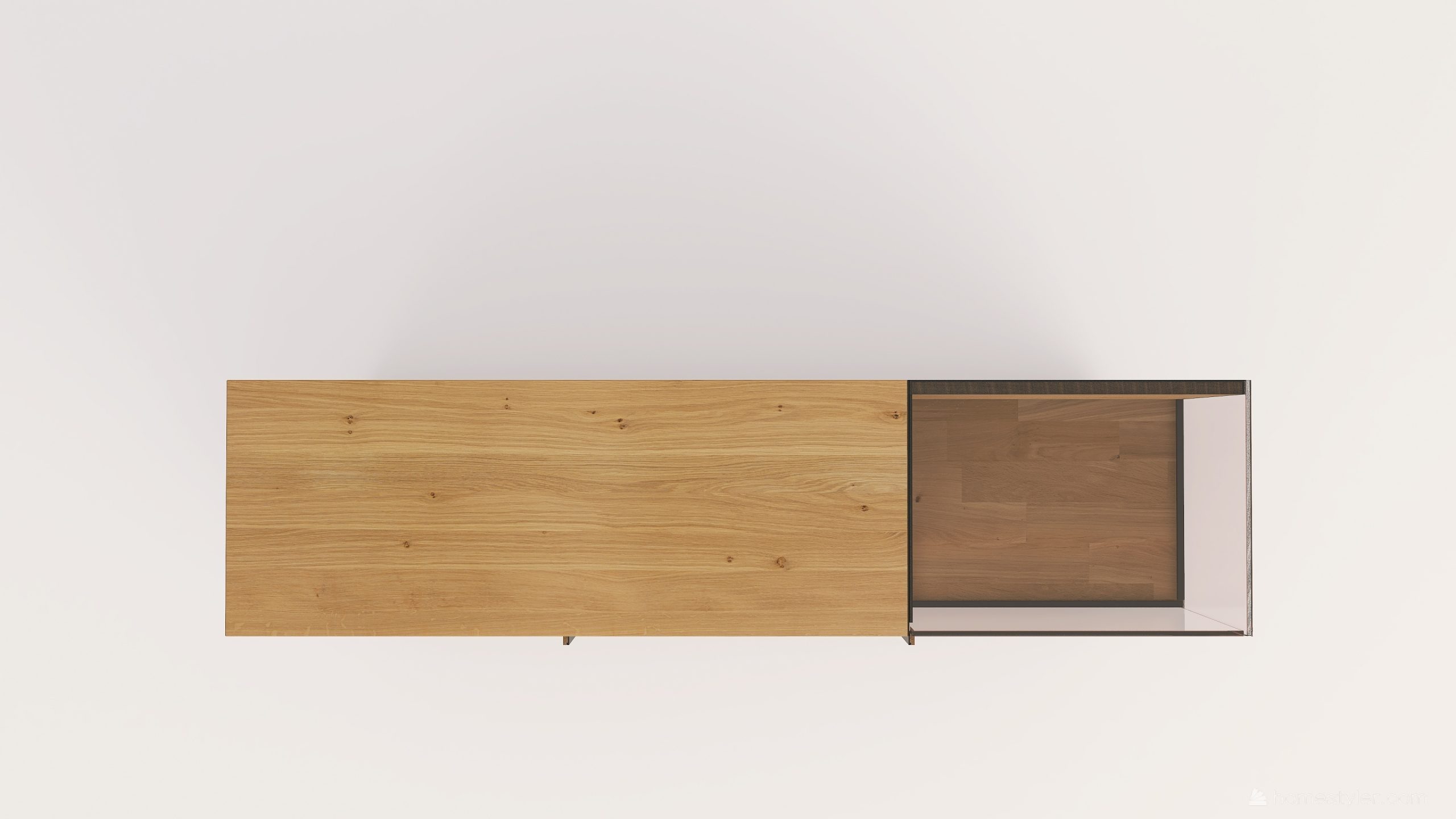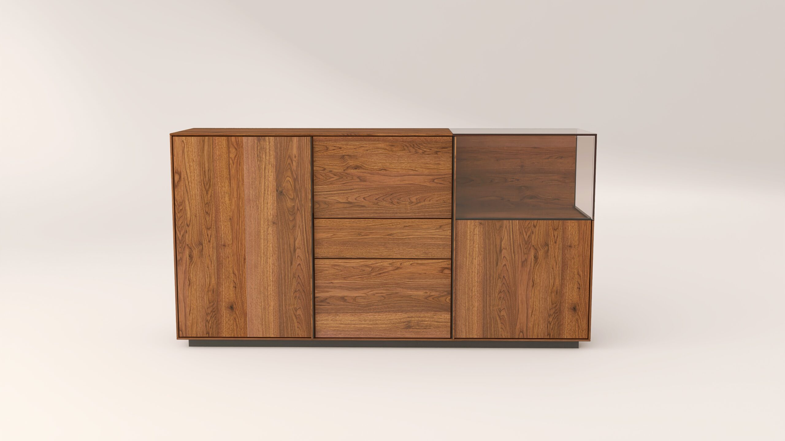 Tömörfa komód egy üveges és egy fa nyíló ajtóval mögötte két polccal, egy keskeny és két mély fiókkal. A fa nyíló ajtó frontfelülete szürke kerámiával vagy kőfurnérral rendelhető. Az evőeszköztartó, a világítás és az üveges rész mögötti hátfal anyaga ( kerámia, kő) opcióként választható.