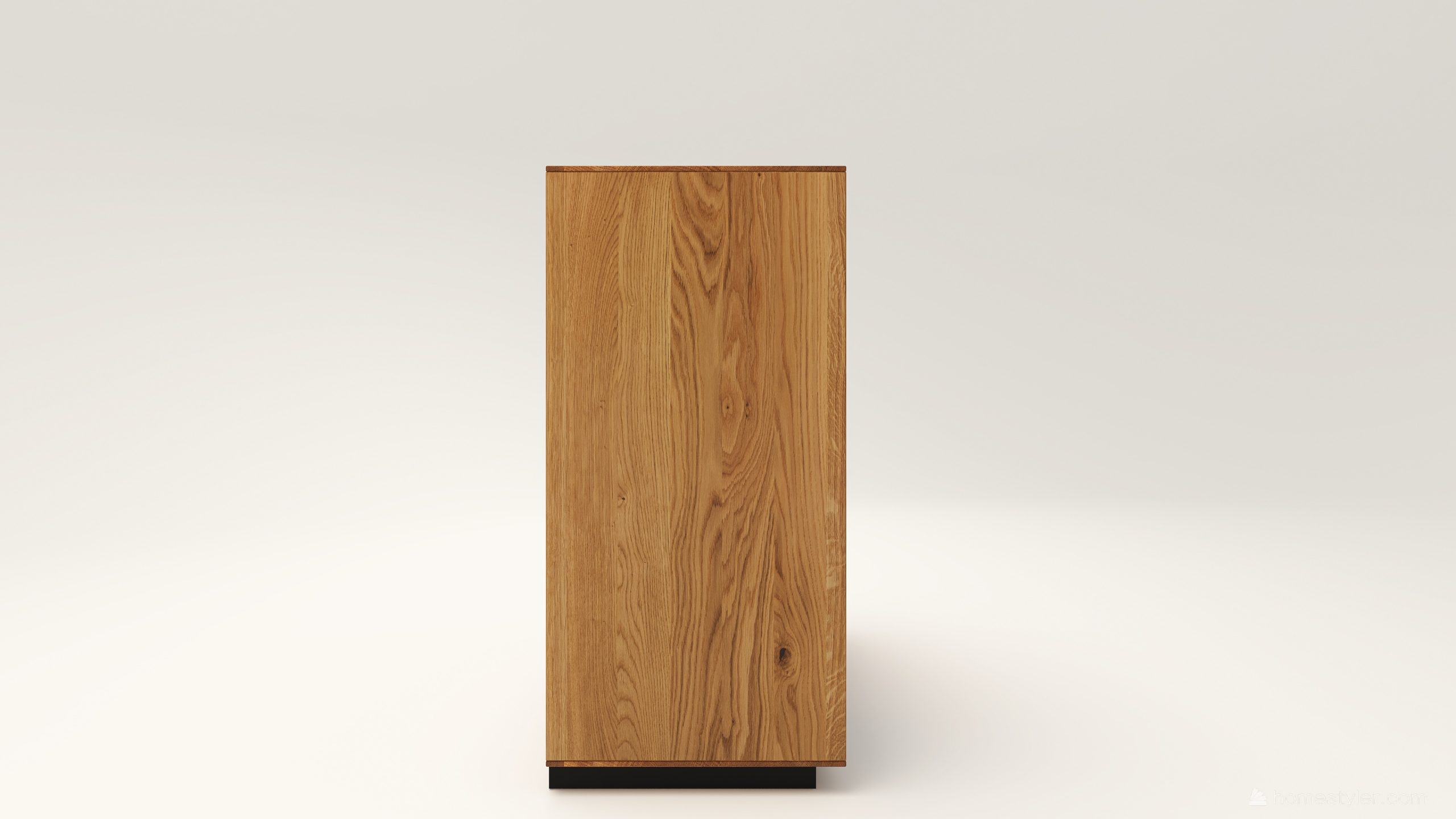 Tömörfa komód egy üveges és egy fa nyíló ajtóval mögötte két polccal, egy keskeny és két mély fiókkal. A fa nyíló ajtó frontfelülete szürke kerámiával vagy kőfurnérral rendelhető. Az evőeszköztartó, a világítás és az üveges rész mögötti hátfal anyaga ( kerámia, kő) opcióként választható. A lábazat magassága 40 mm.