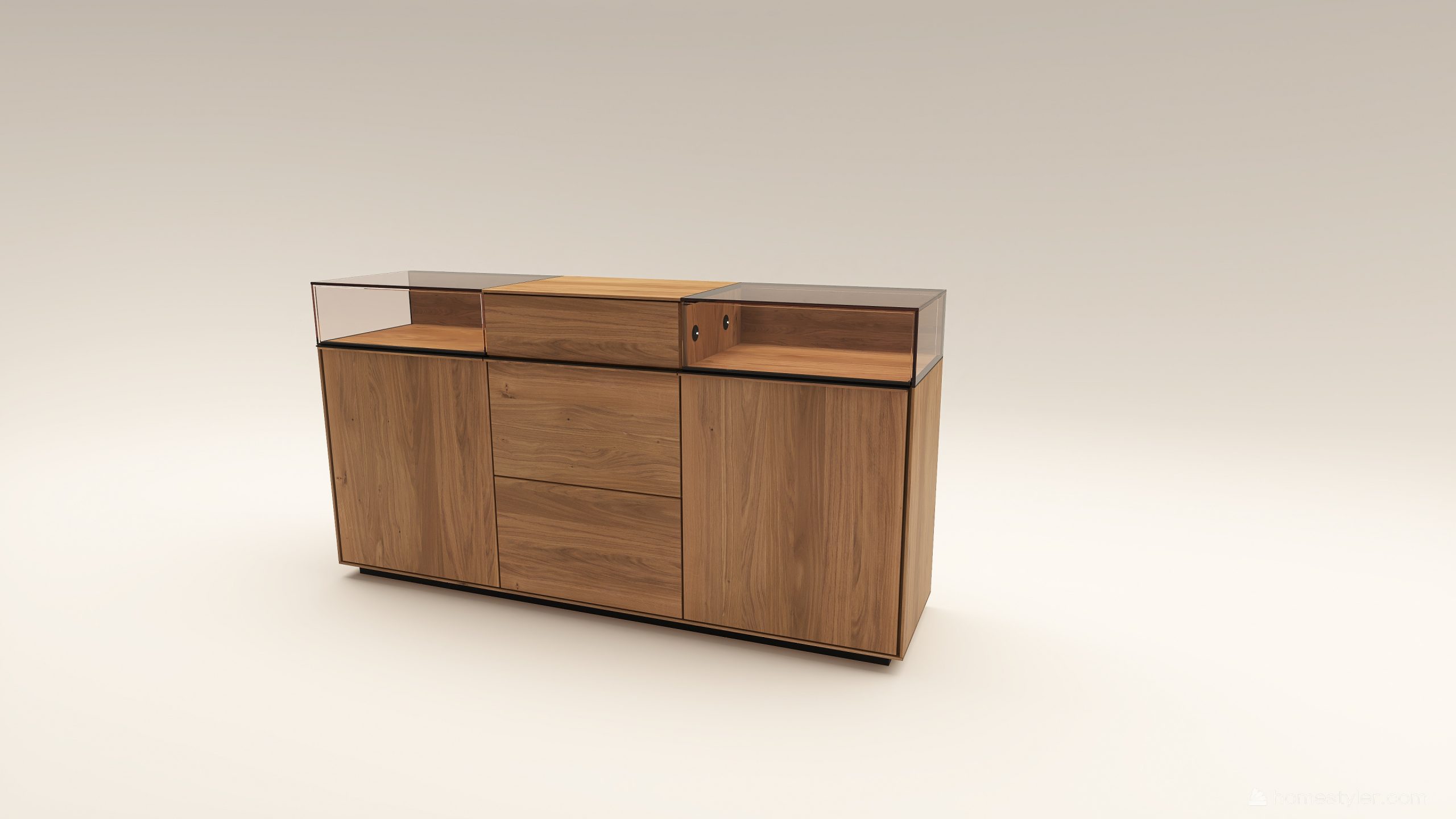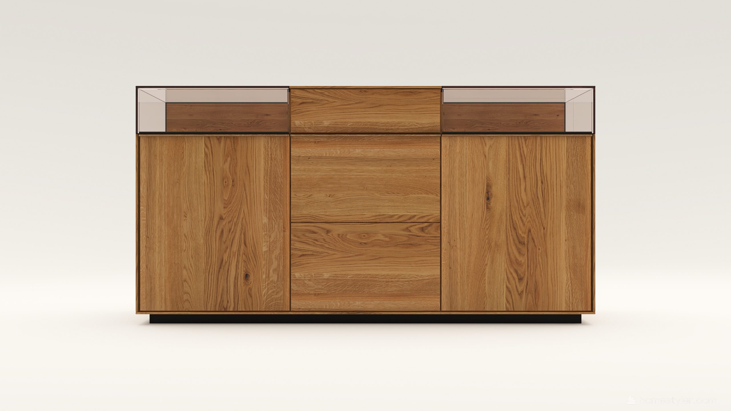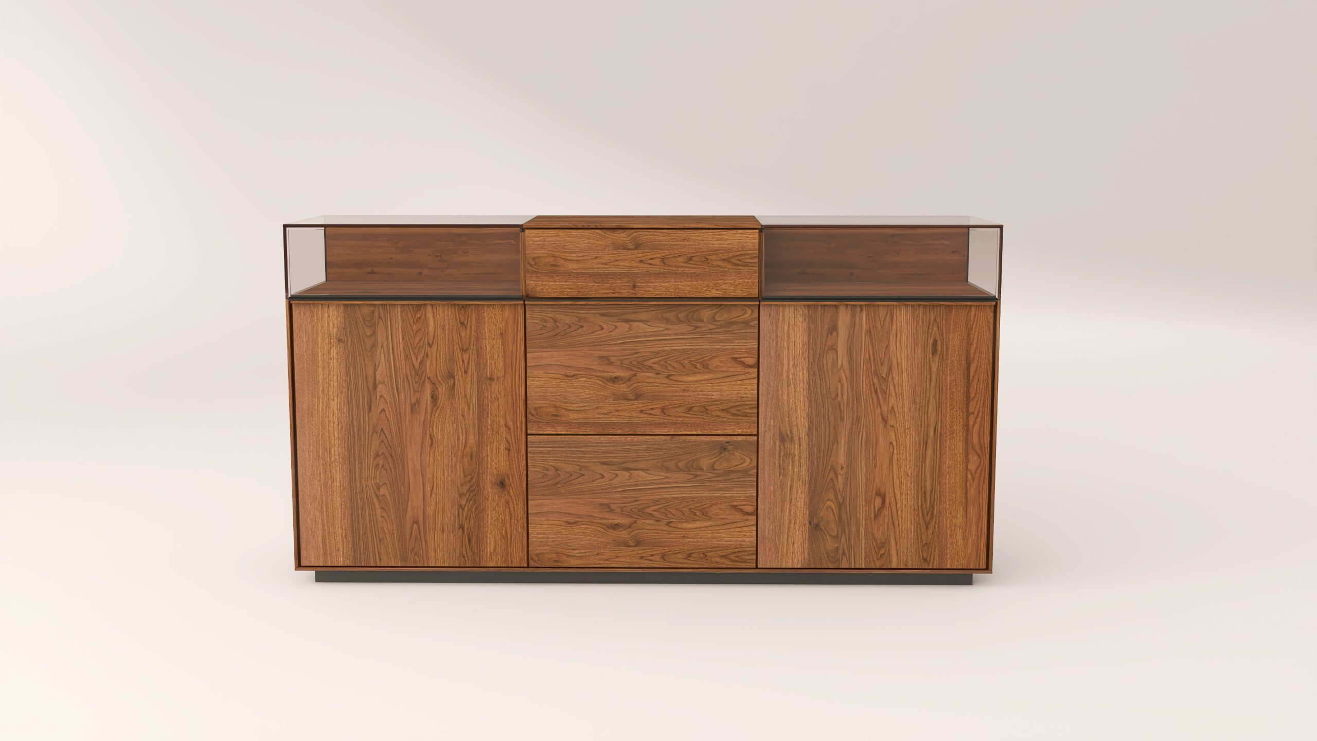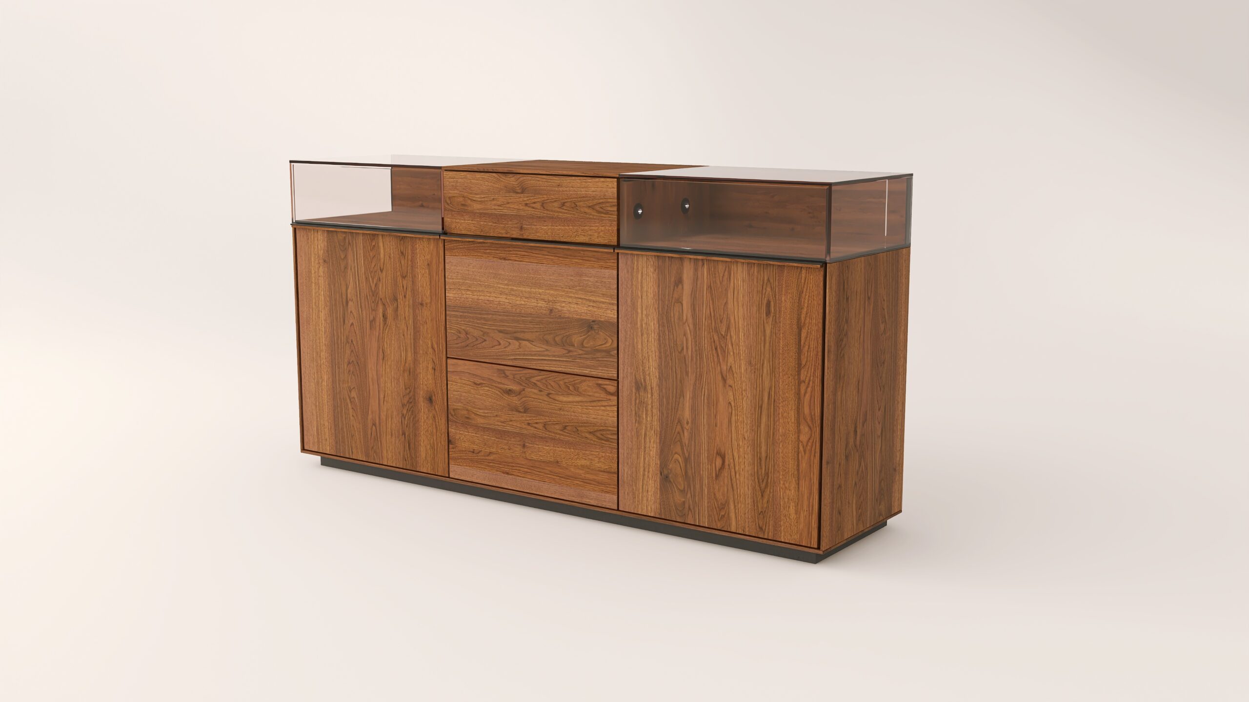 Tömörfa komód két üveges nyíló ajtóval mögötte egy-egy polccal, egy keskeny és két mély fiókkal. A két üveges fa nyíló ajtó frontfelülete szürke kerámiával vagy palafurnérral rendelhető. Az evőeszköztartó, a világítás opcióként választható. A lábazat magassága 40 mm.