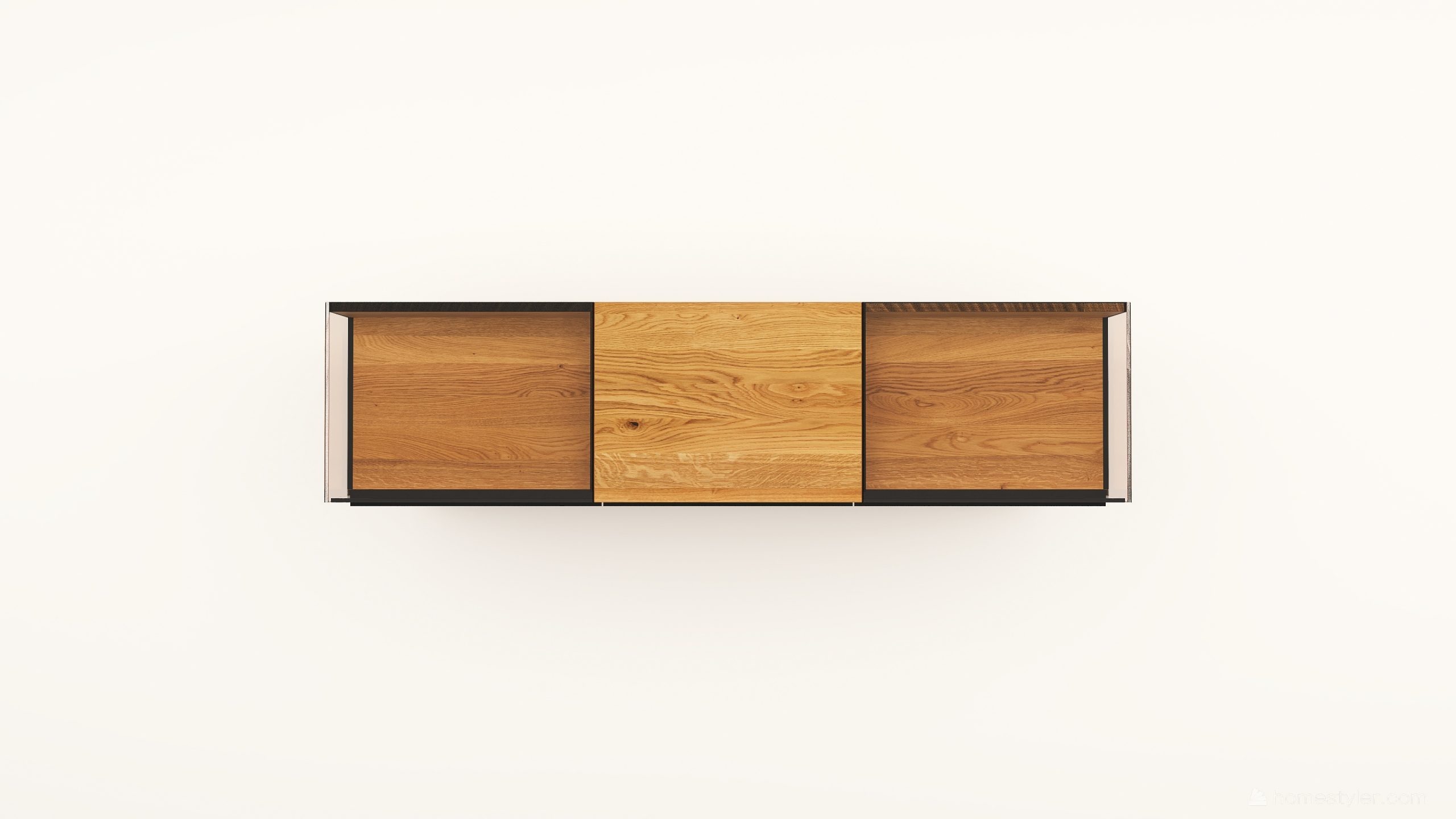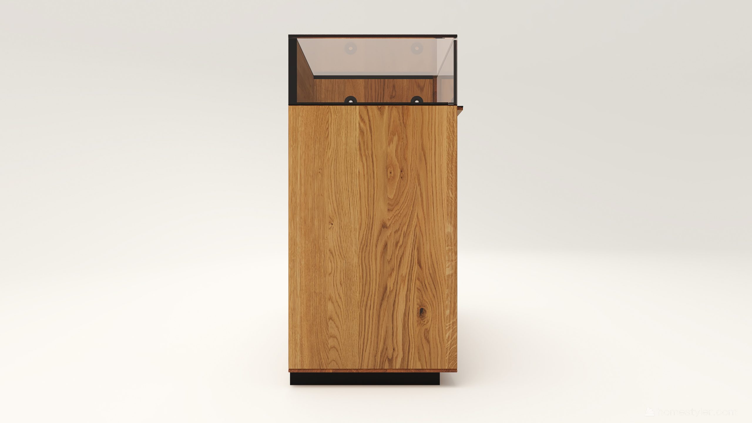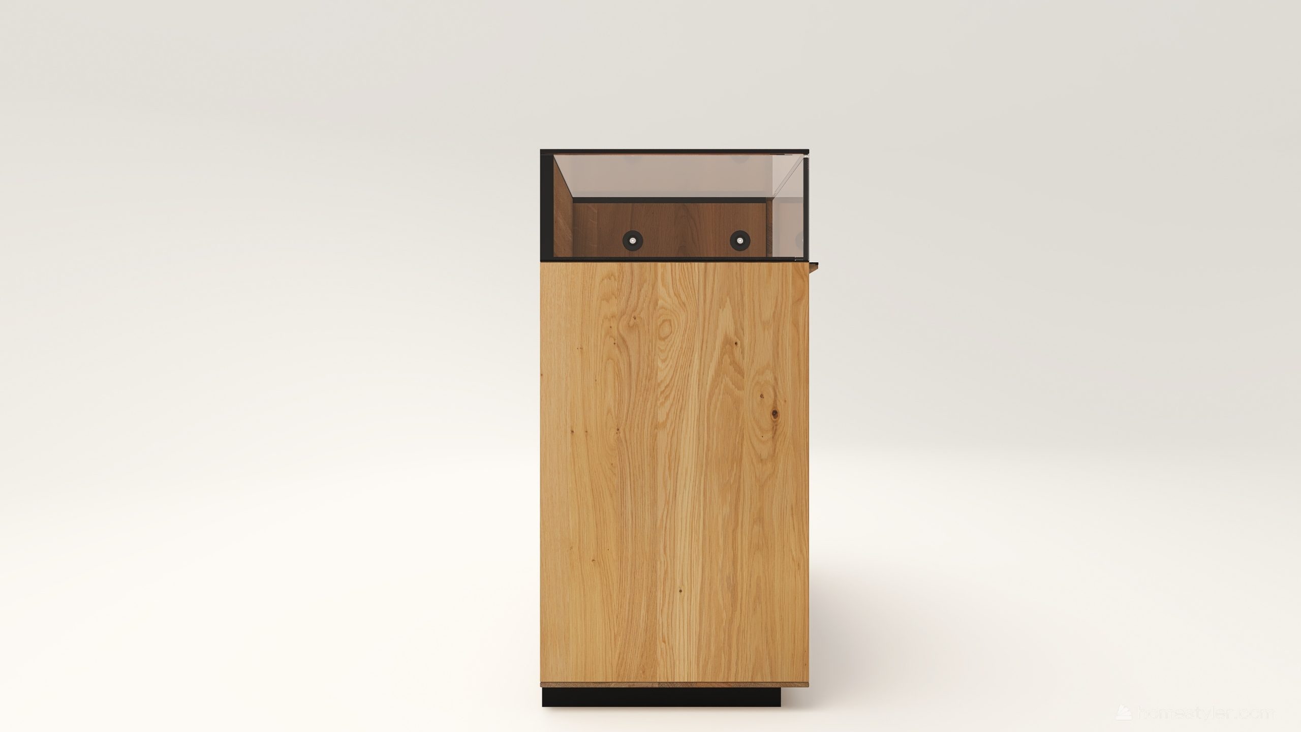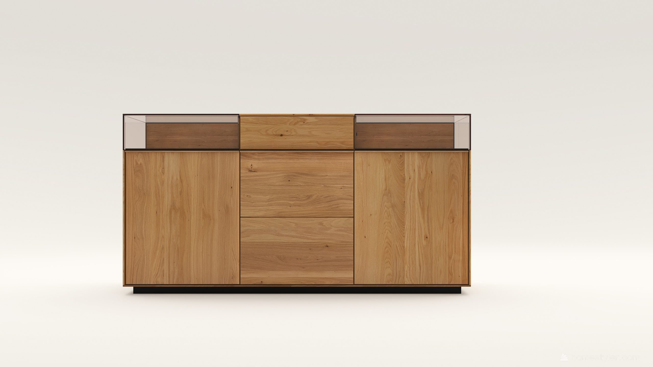 Tömörfa komód két üveges nyíló ajtóval mögötte egy-egy polccal, egy keskeny és két mély fiókkal. A két üveges fa nyíló ajtó frontfelülete szürke kerámiával vagy palafurnérral rendelhető. Az evőeszköztartó, a világítás opcióként választható. A lábazat magassága 40 mm.