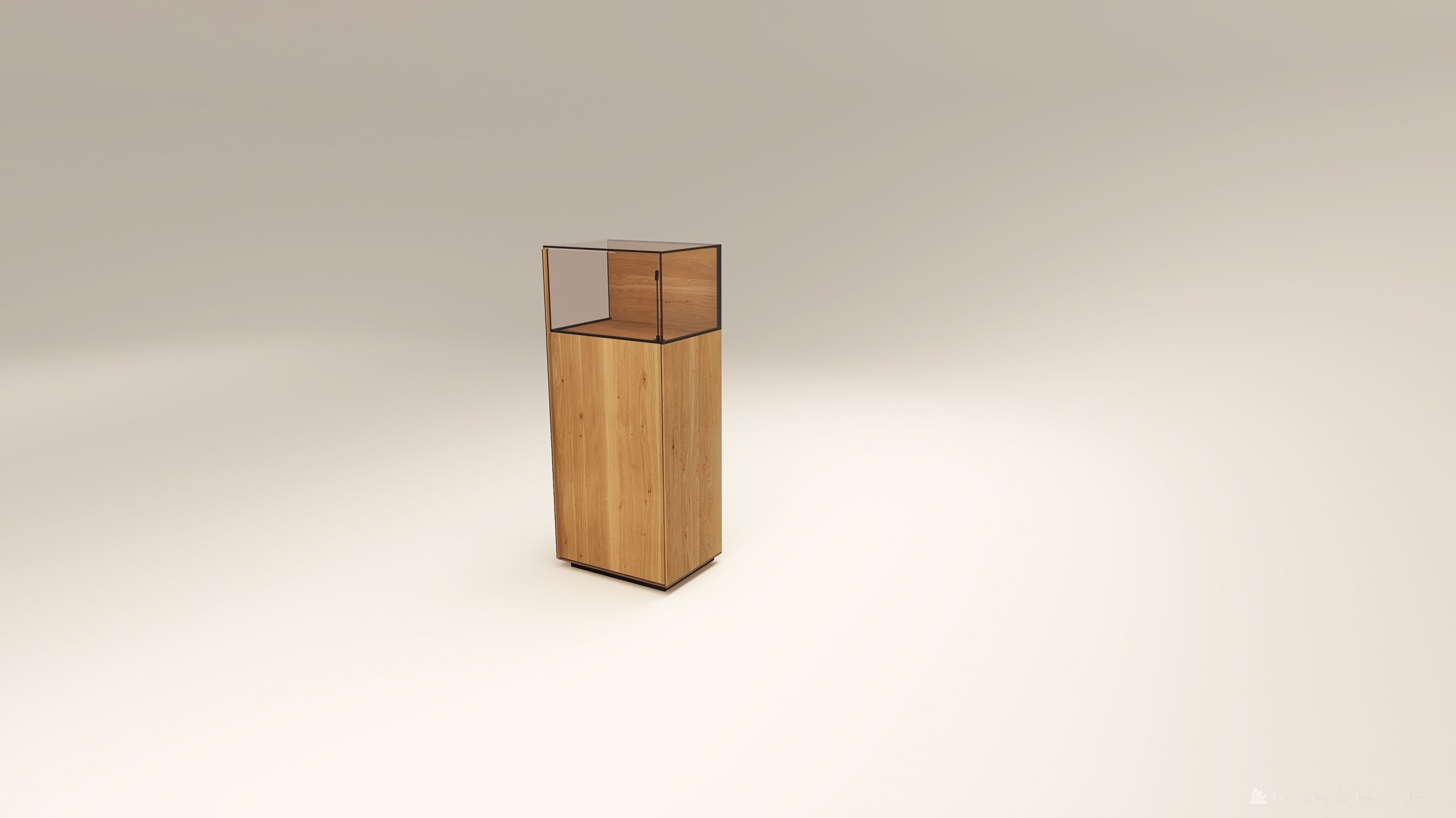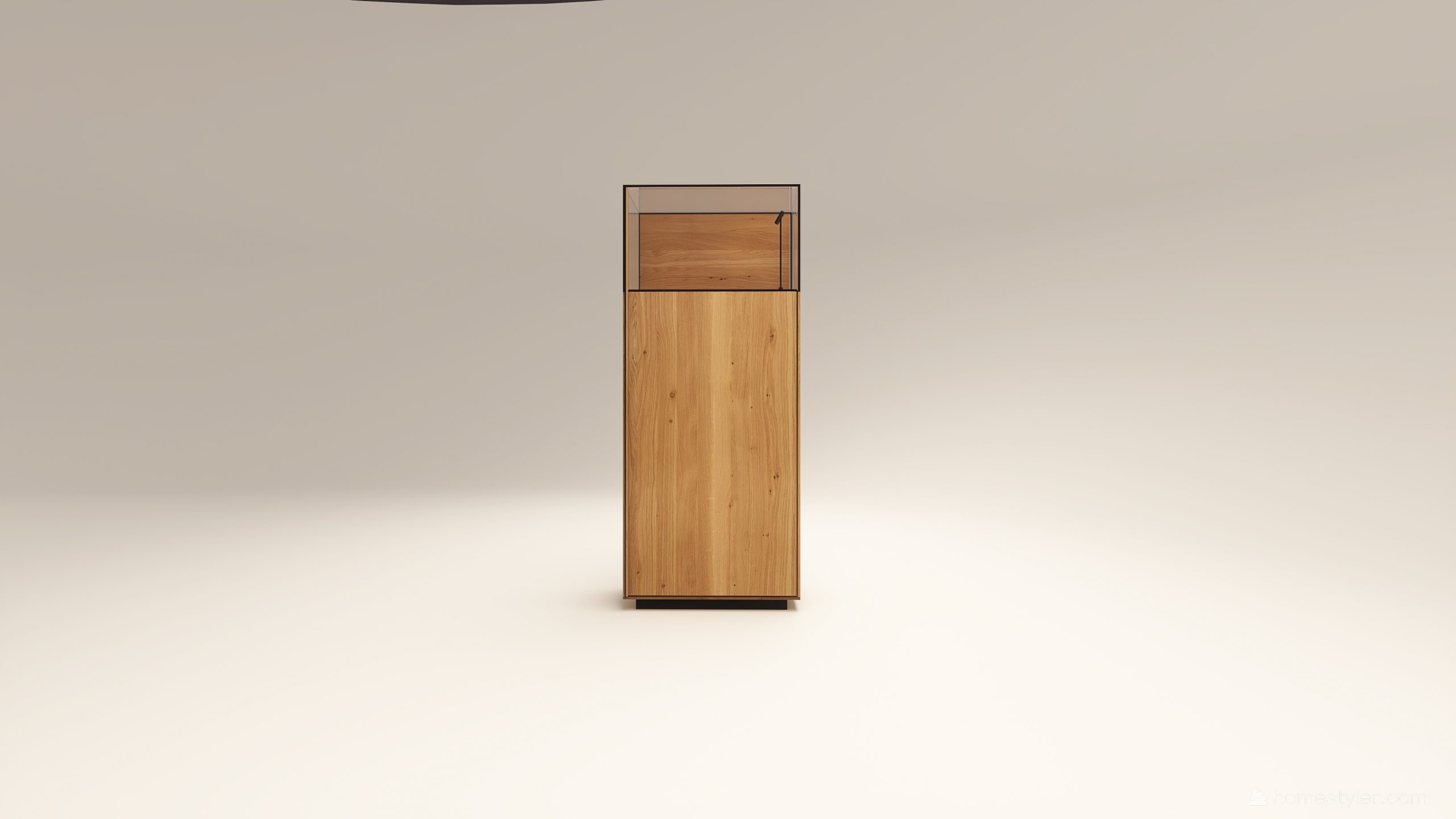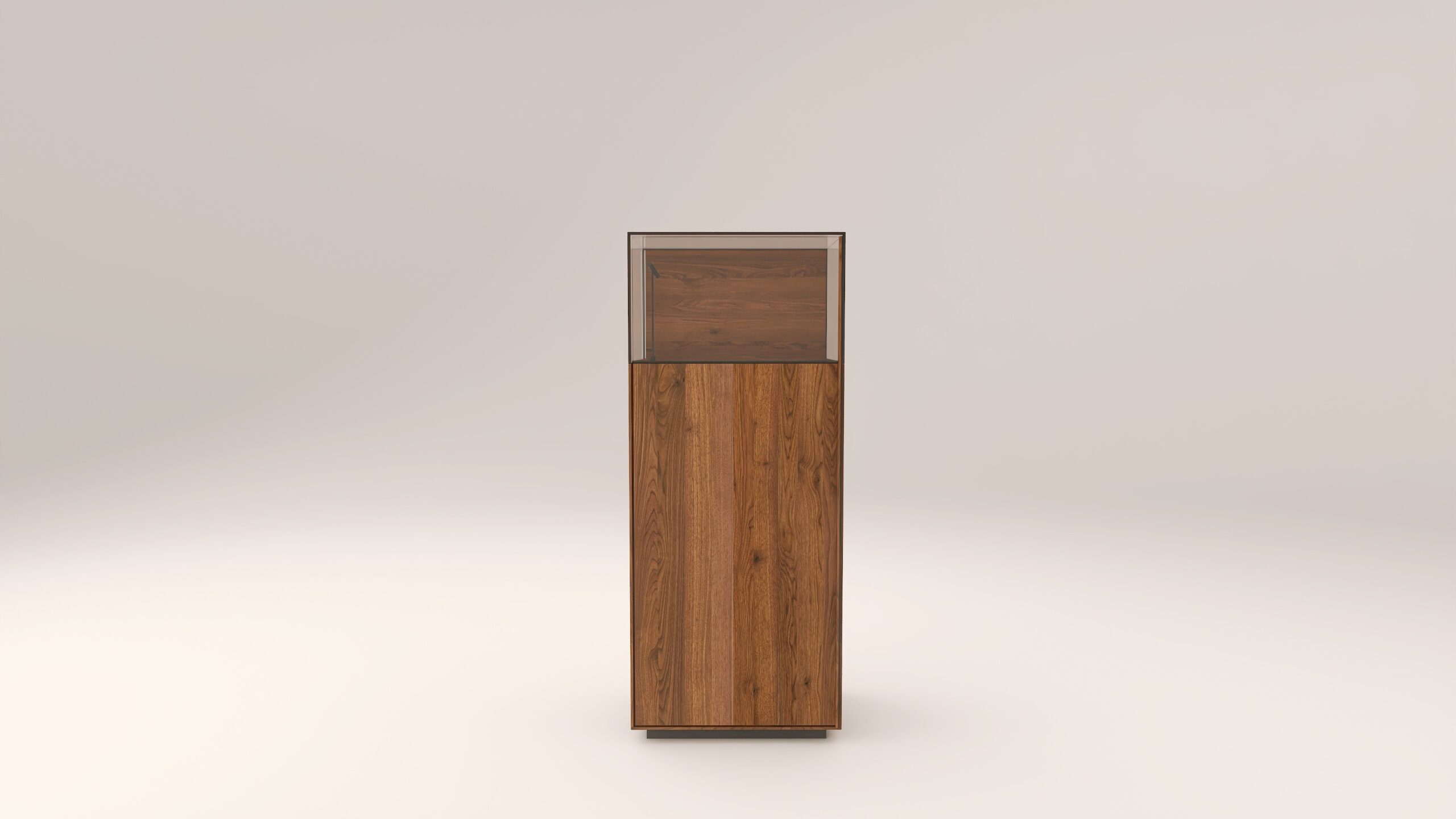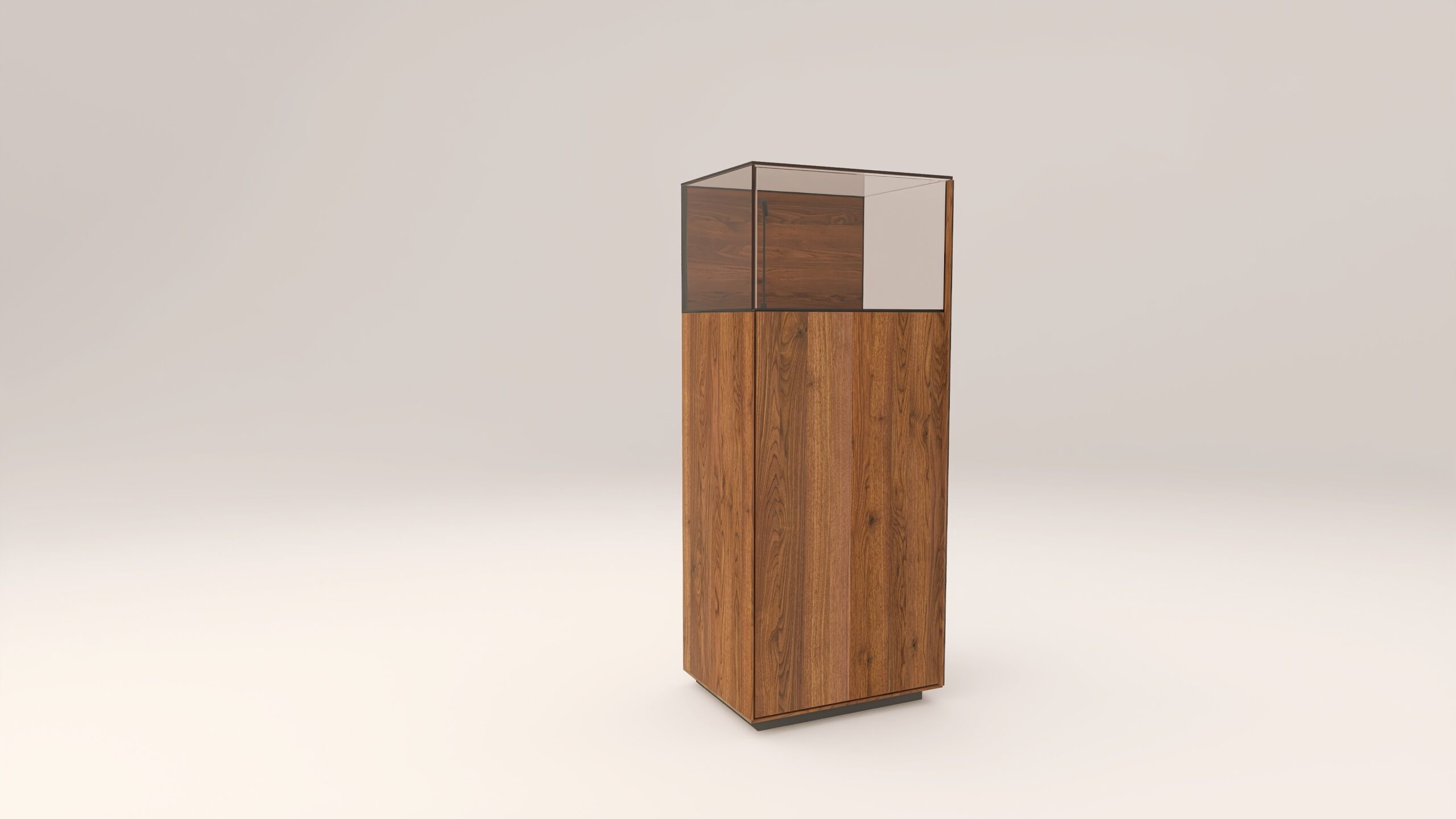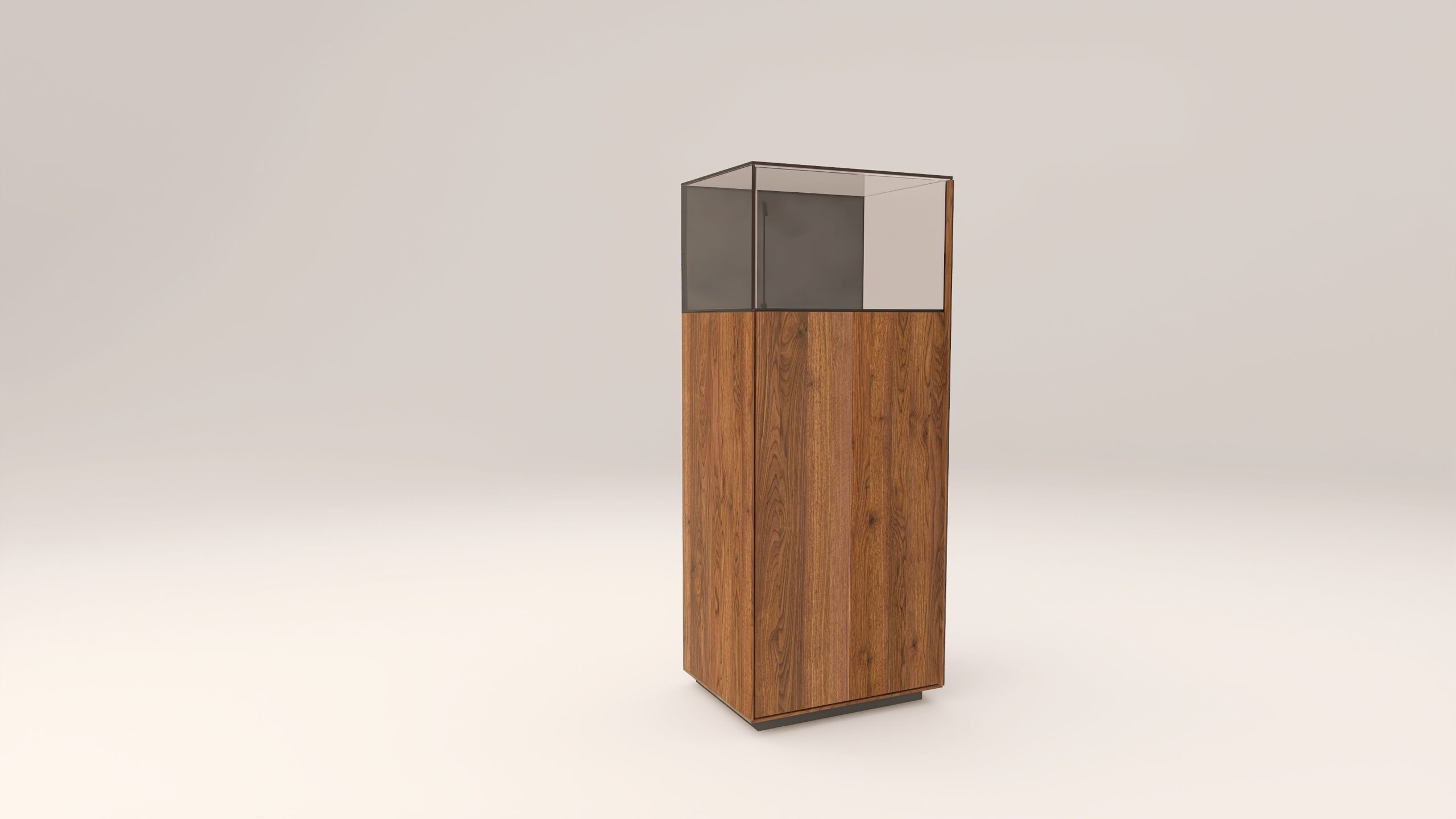 Alacsony tömörfa szekrény, egy üveges ajtóval mögötte két polccal. A hátfal anyaga ( kő, kerámia) és a világítás opcióként választható. A lábazat magassága 40 mm.