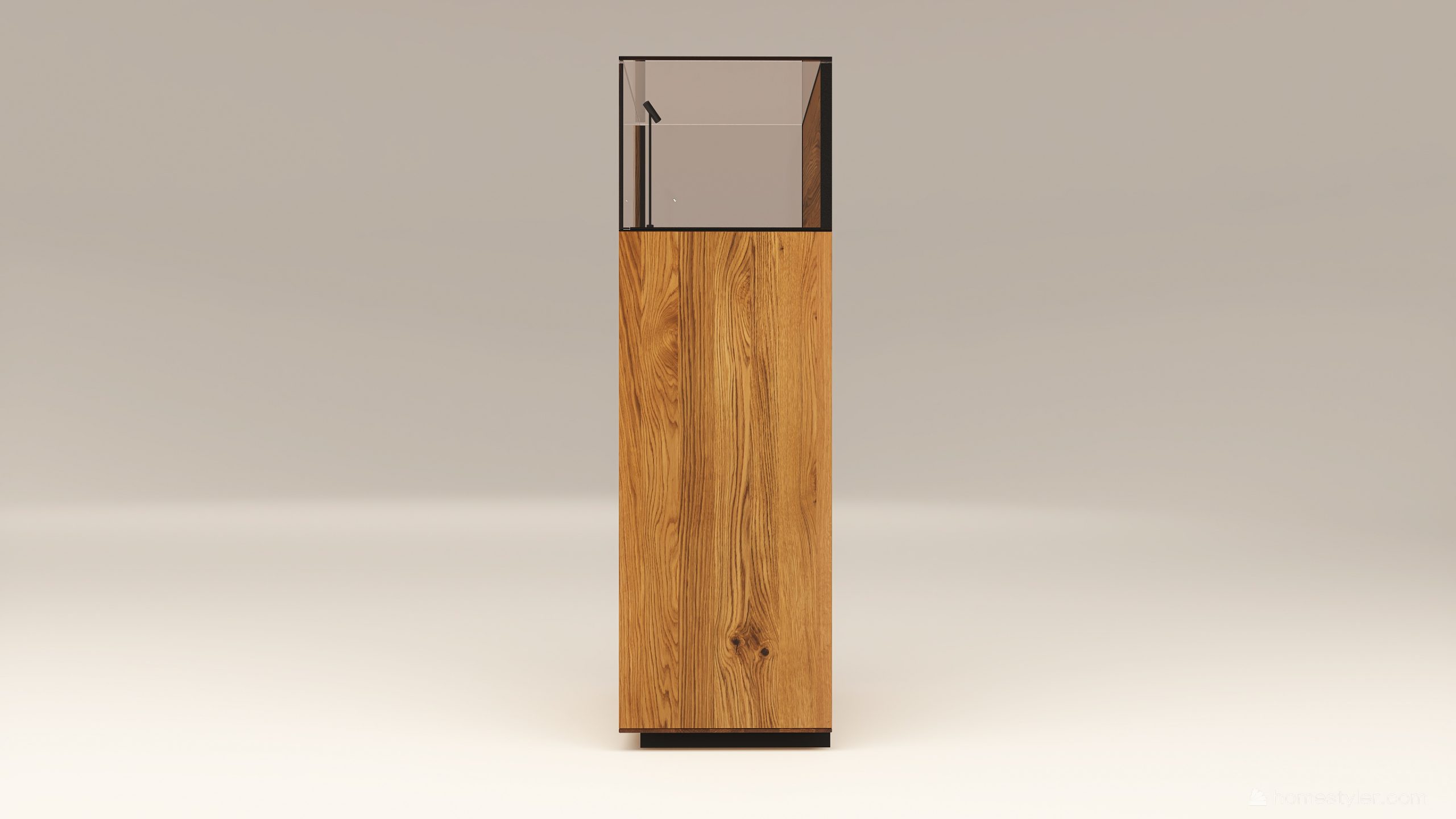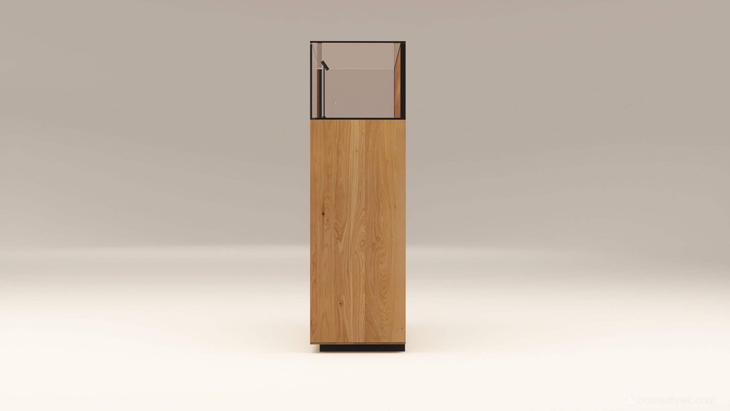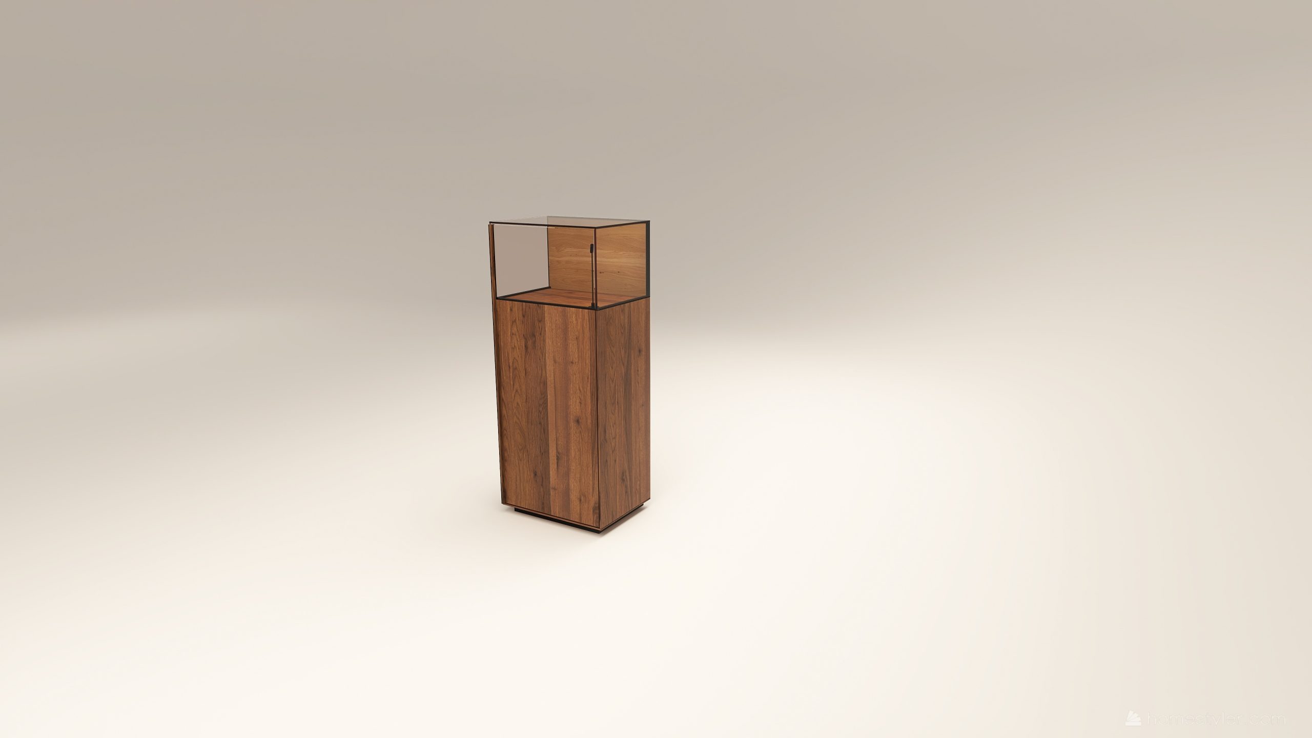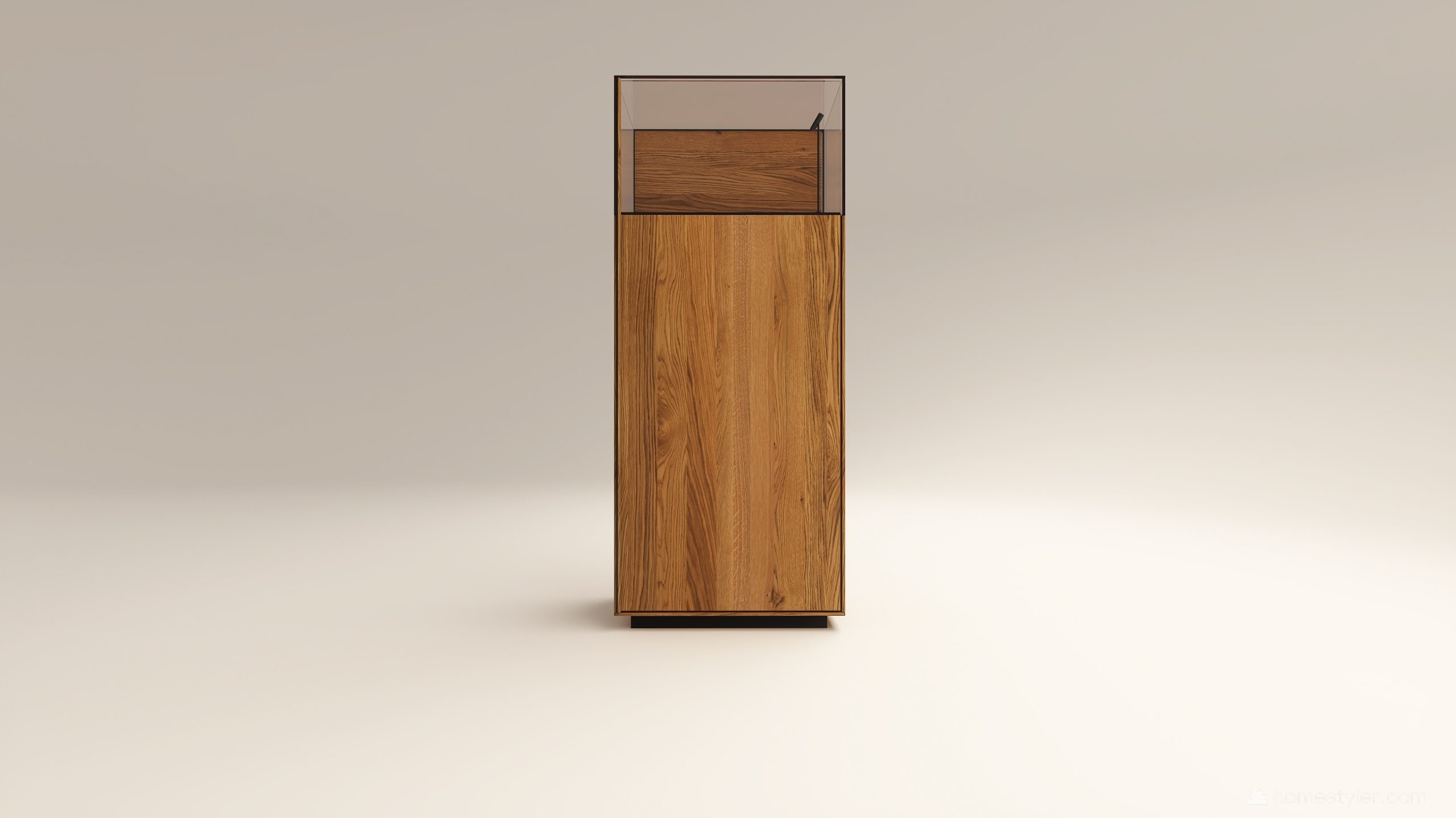 Alacsony tömörfa szekrény, egy üveges ajtóval mögötte két polccal. A hátfal anyaga ( kő, kerámia) és a világítás opcióként választható. A lábazat magassága 40 mm.