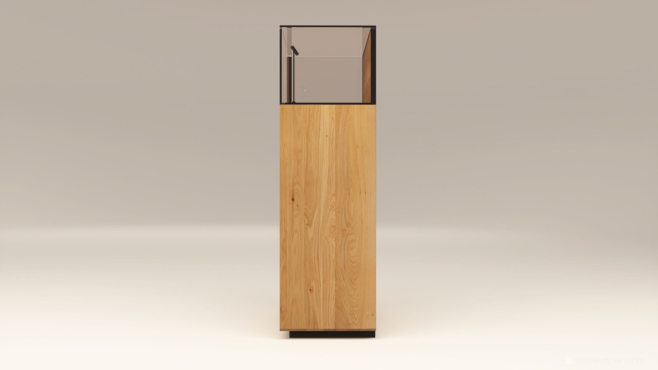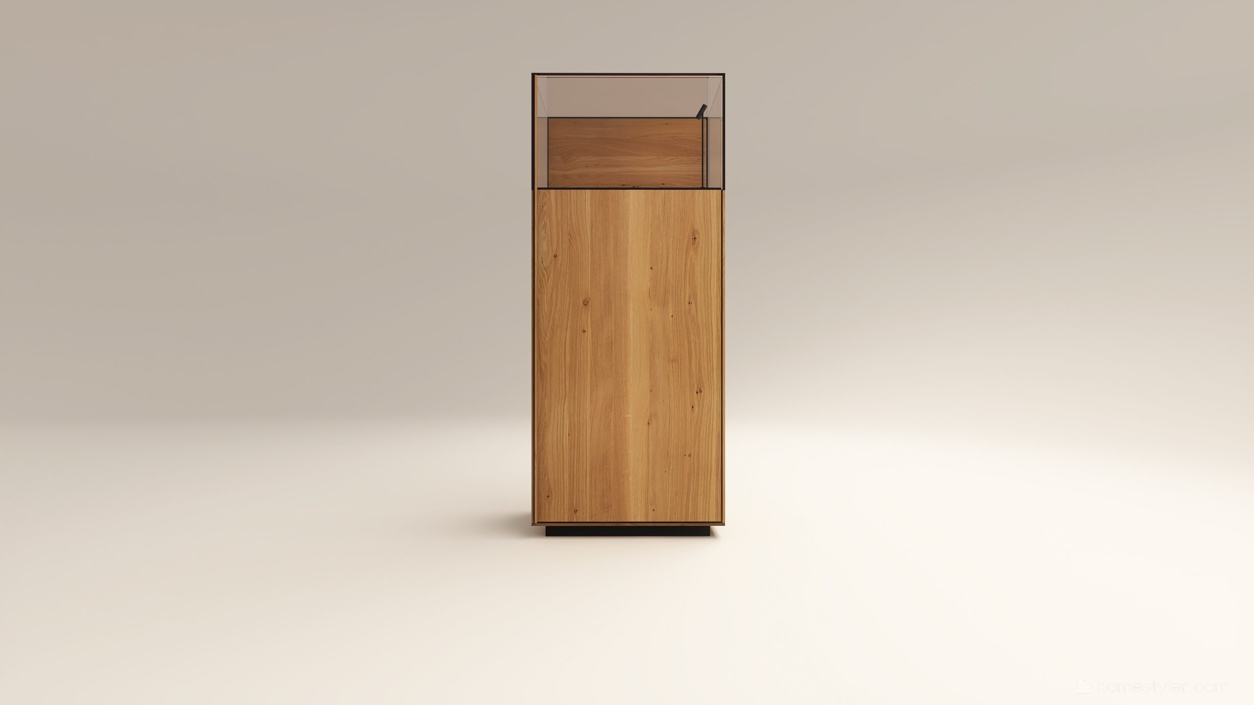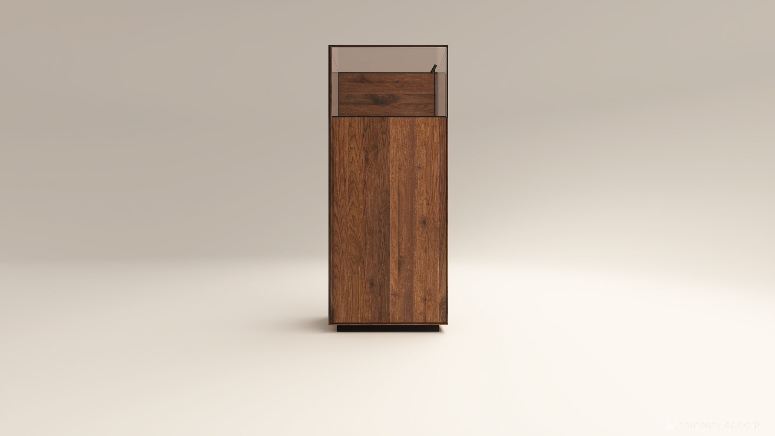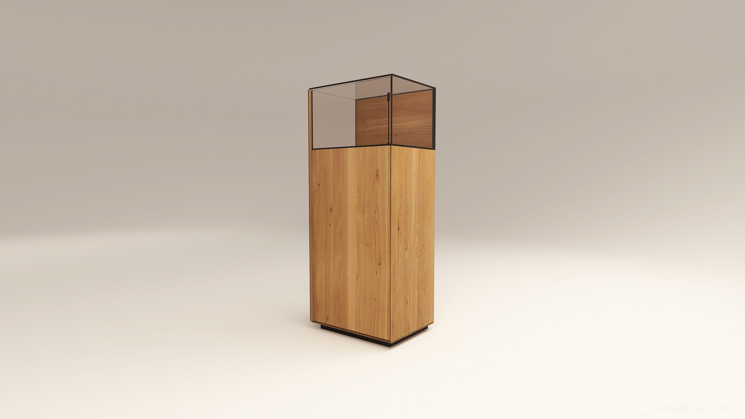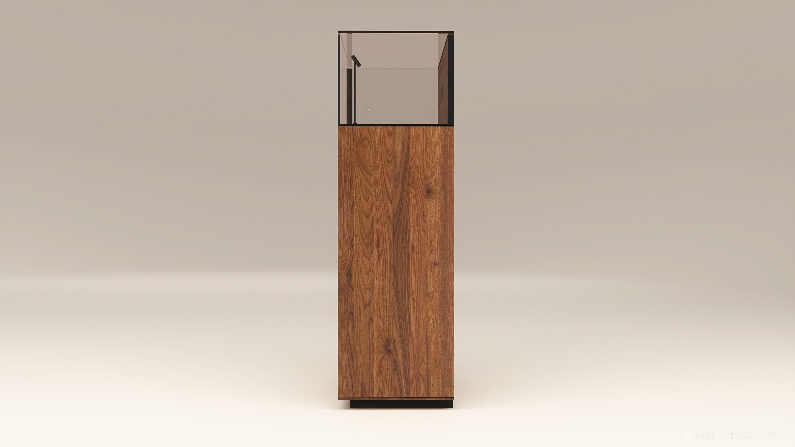 Alacsony tömörfa szekrény, egy üveges ajtóval mögötte két polccal. A hátfal anyaga ( kő, kerámia) és a világítás opcióként választható. A lábazat magassága 40 mm.