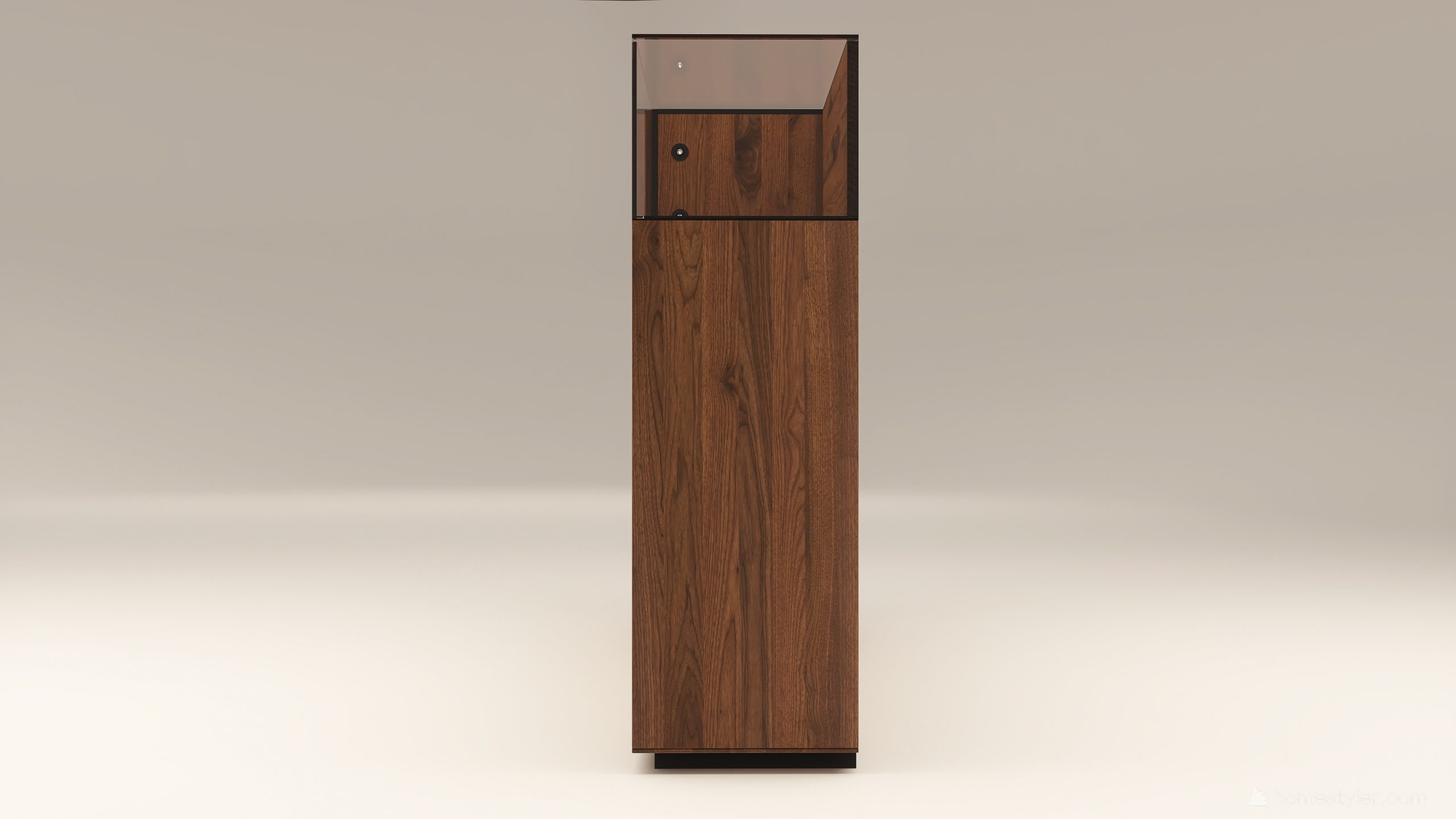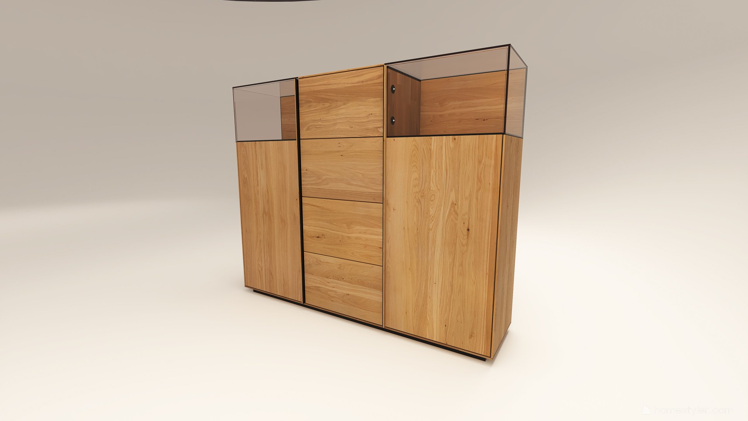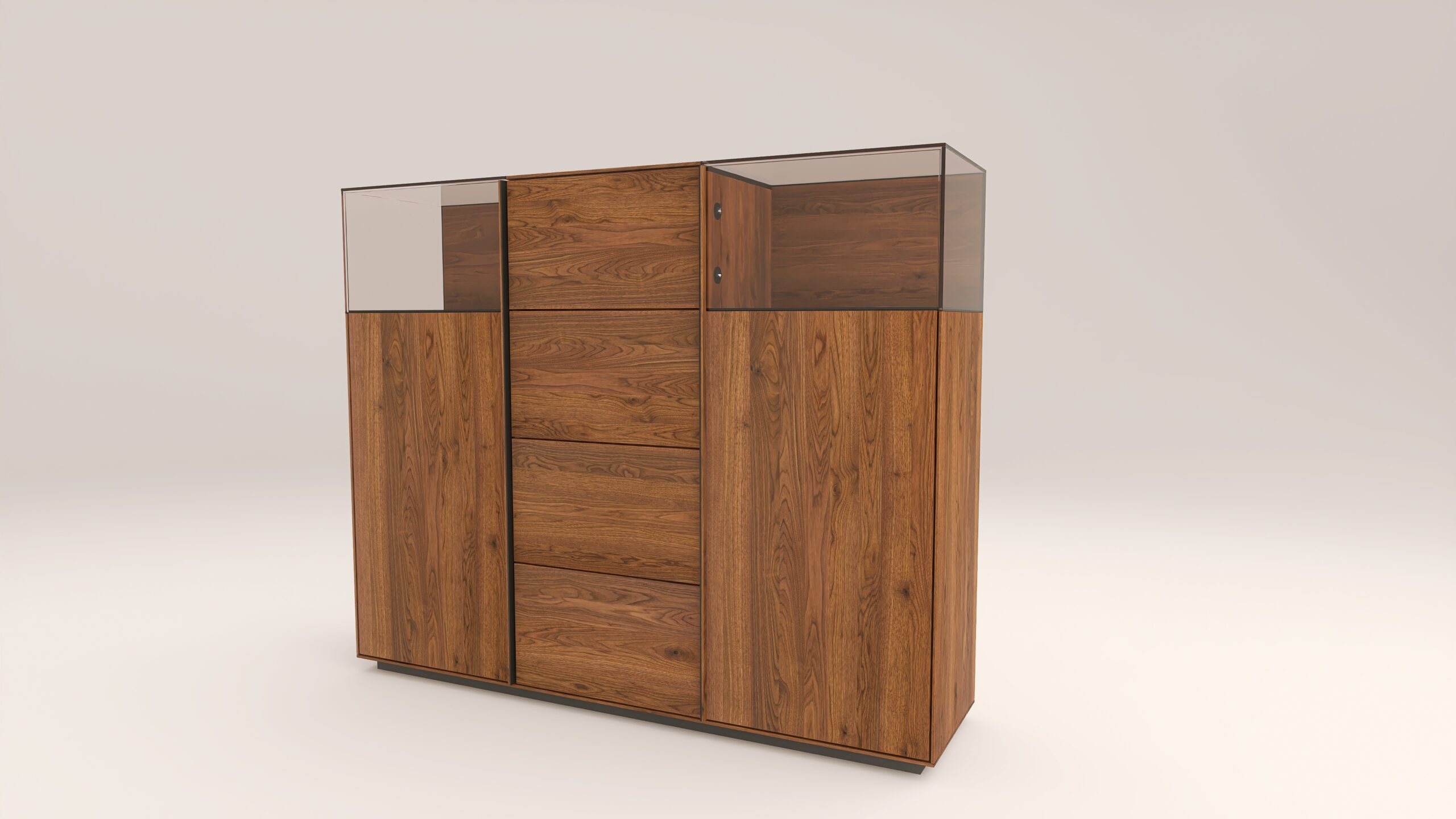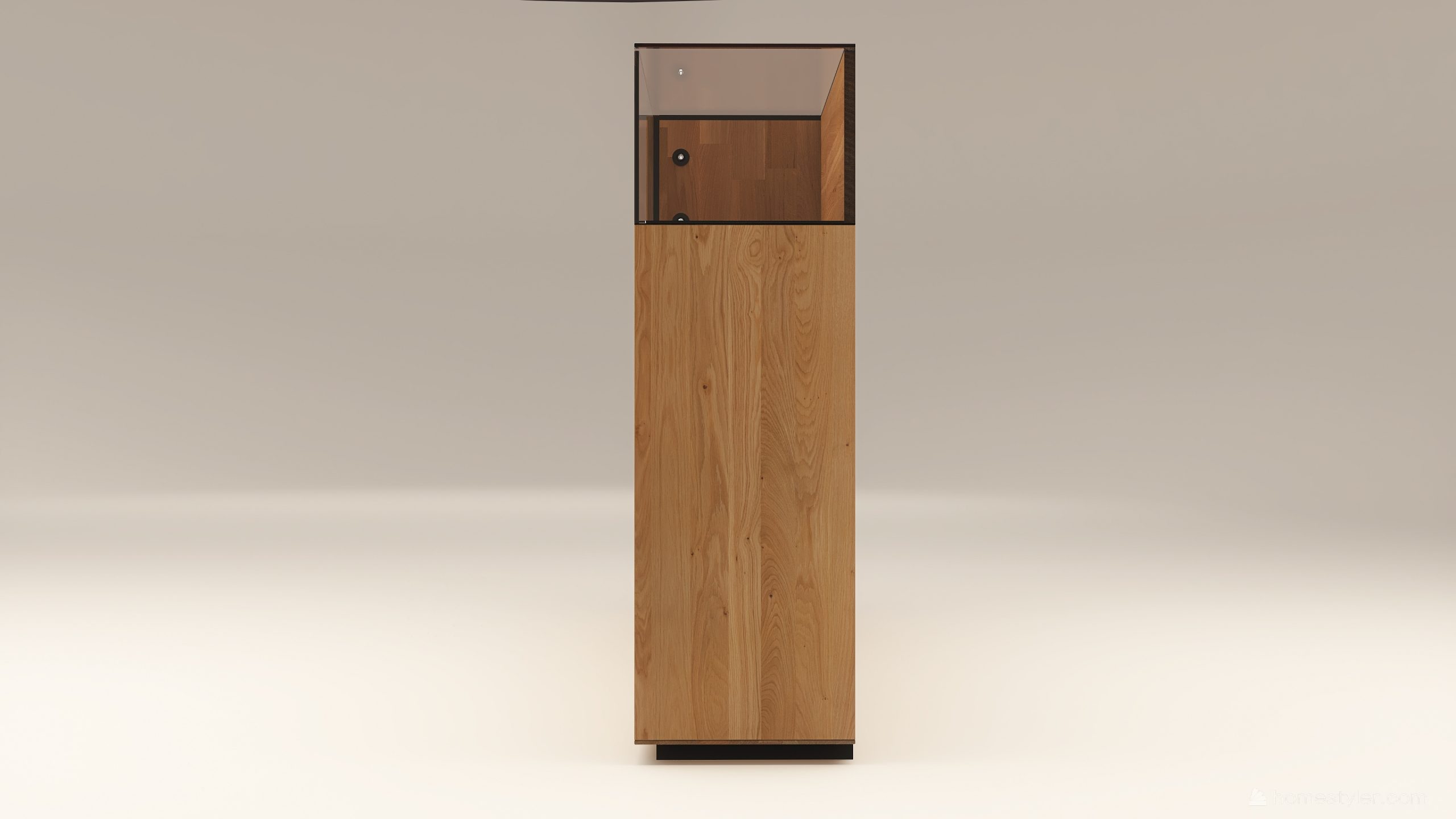 Tömörfa szekrény, két üveges ajtóval mögötte két-két illetve három polccal és négy fiókkal. A hátfal anyaga ( pala, kő) és a világítás opcióként választható. A lábazat magassága 40 mm.