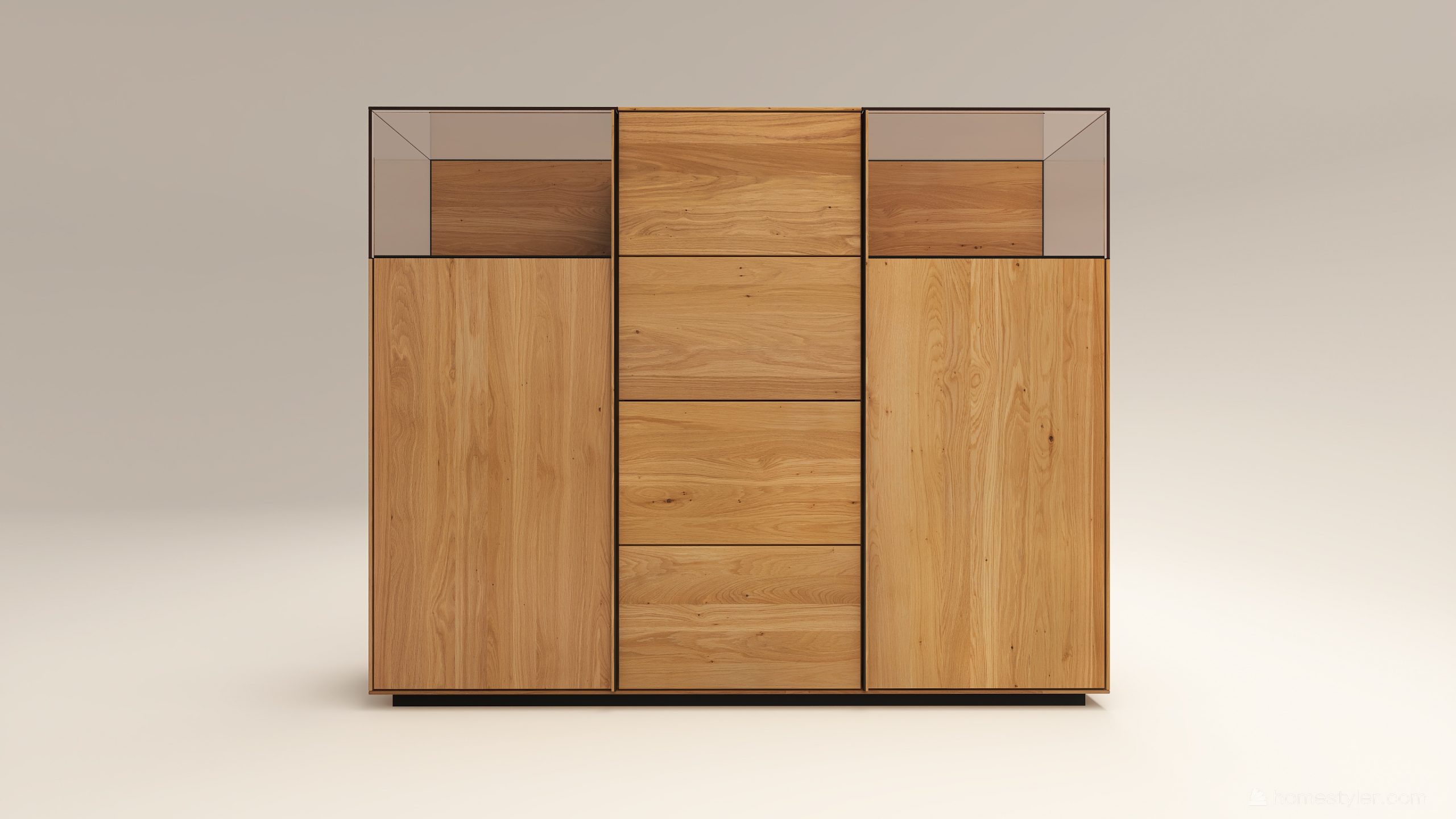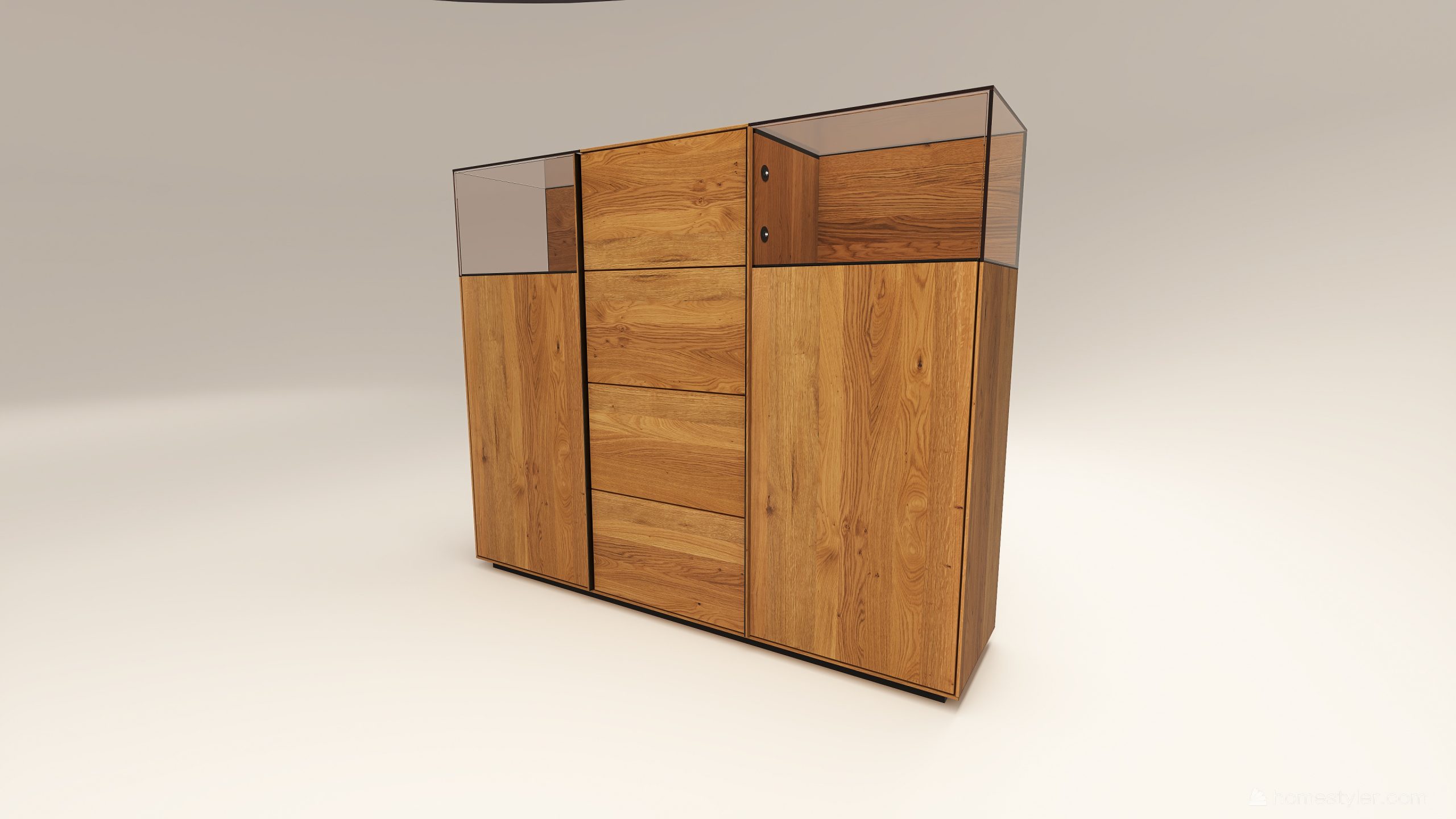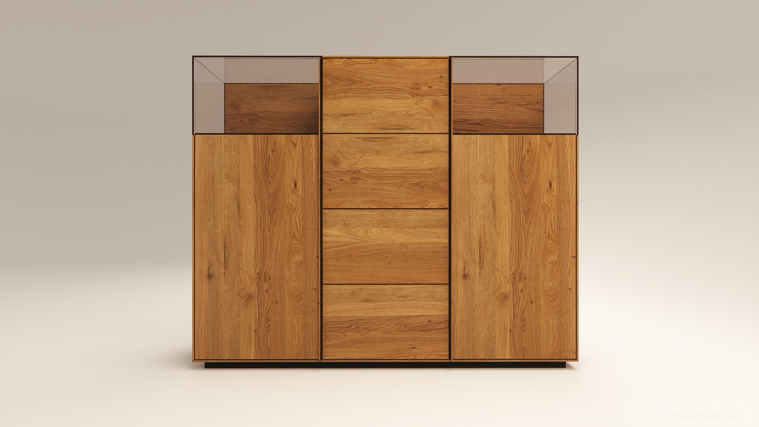 Tömörfa szekrény, két üveges ajtóval mögötte két-két illetve három polccal és négy fiókkal. A hátfal anyaga ( pala, kő) és a világítás opcióként választható. A lábazat magassága 40 mm.