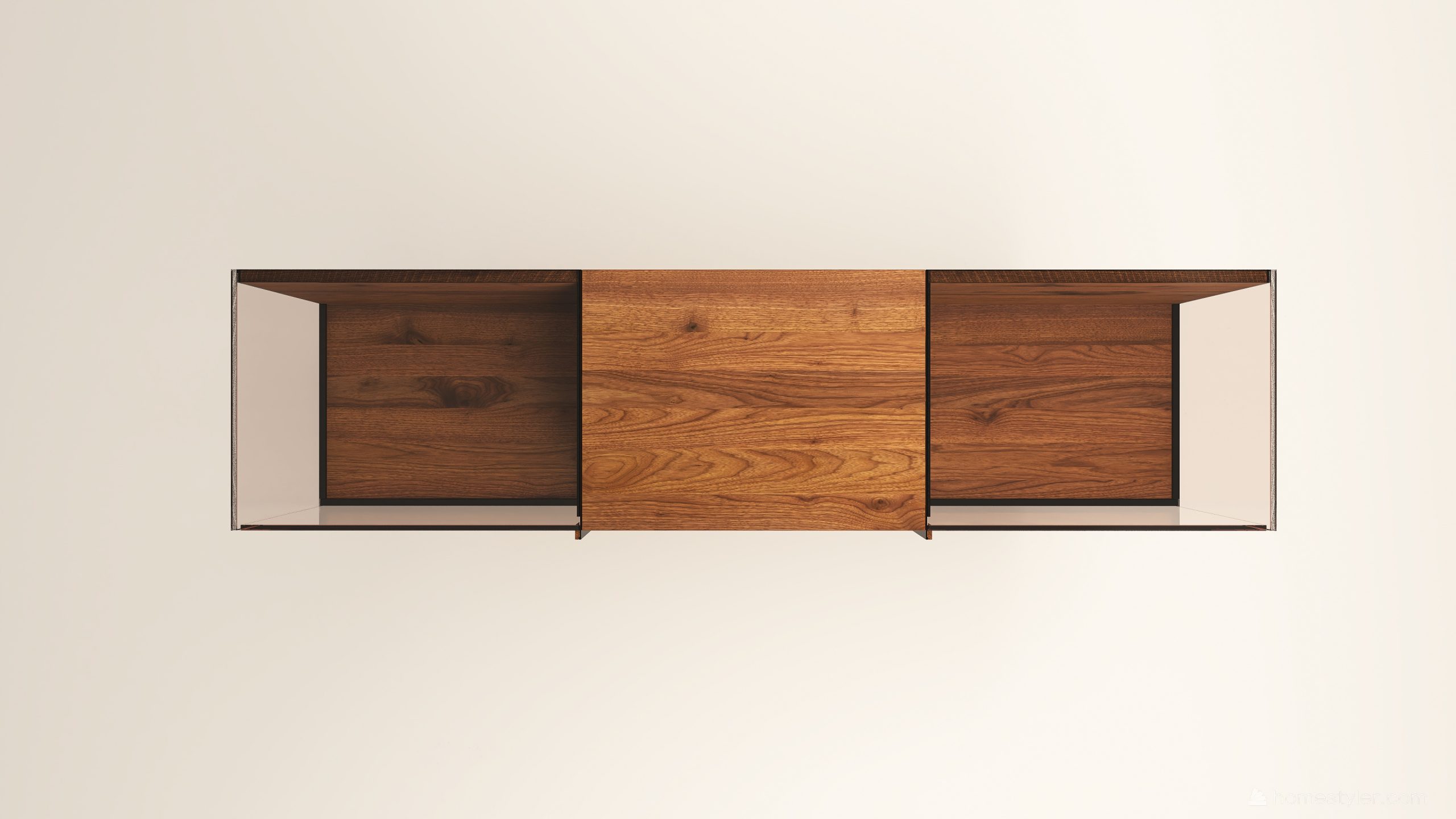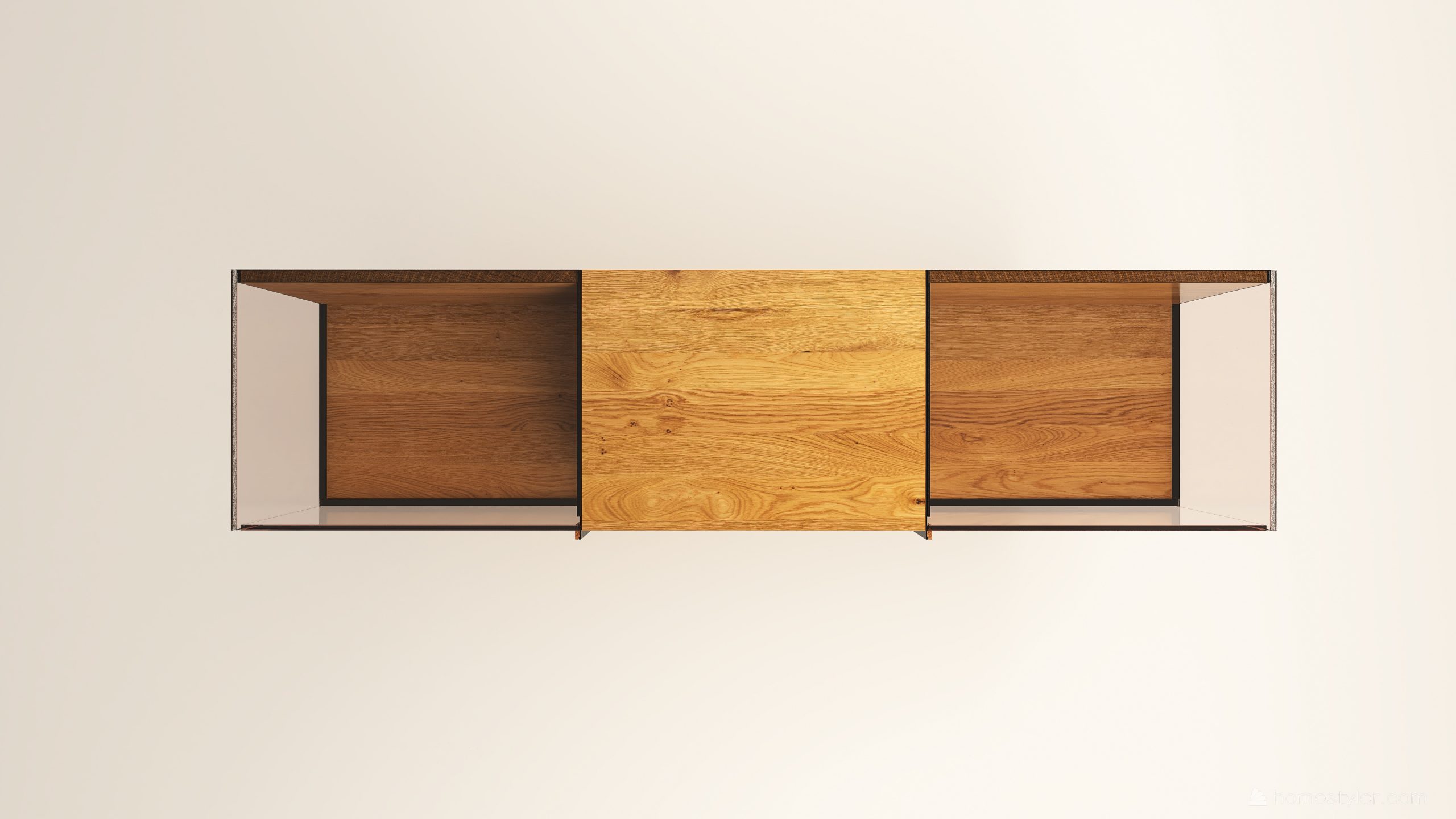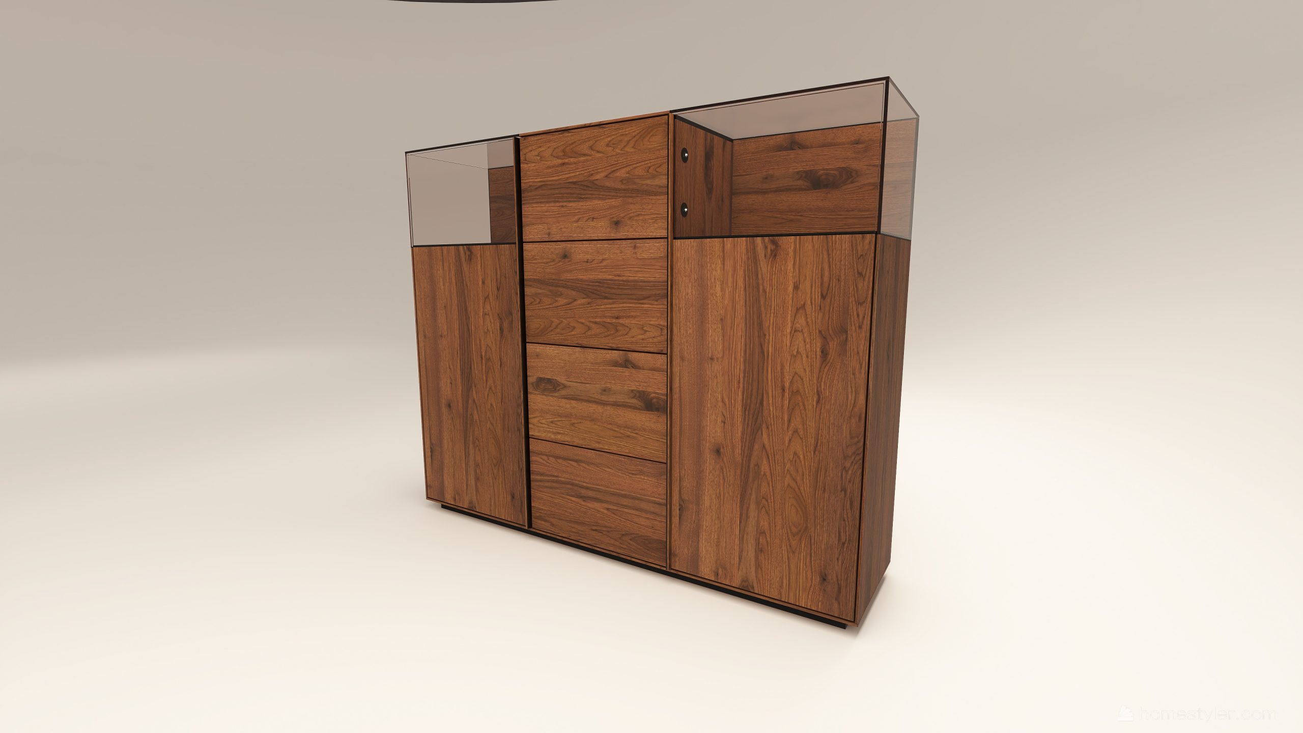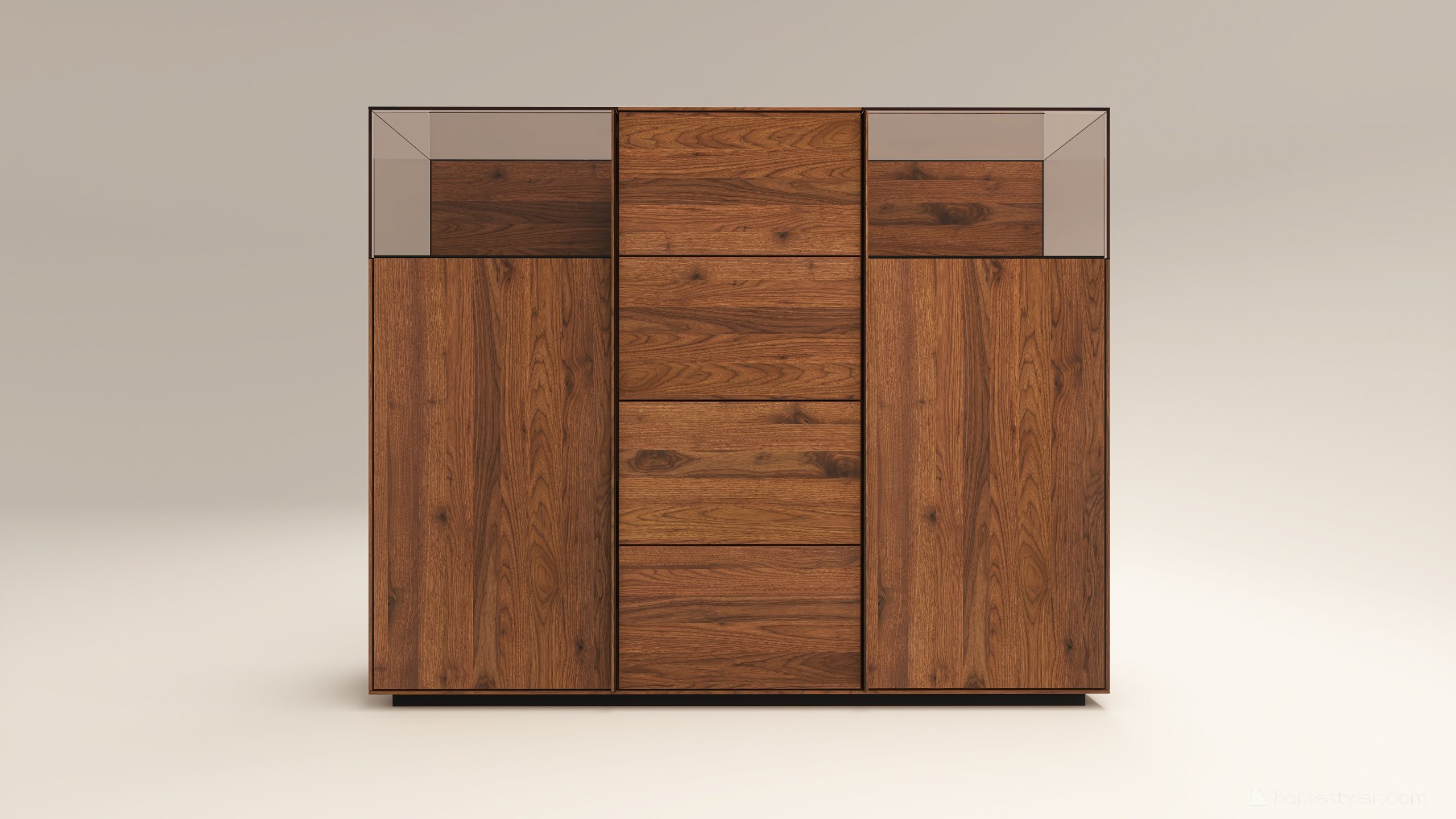 Tömörfa szekrény, két üveges ajtóval mögötte két-két illetve három polccal és négy fiókkal. A hátfal anyaga ( pala, kő) és a világítás opcióként választható. A lábazat magassága 40 mm.