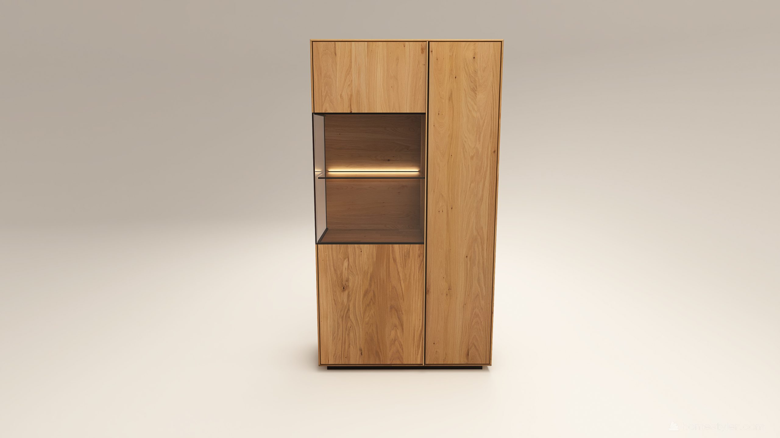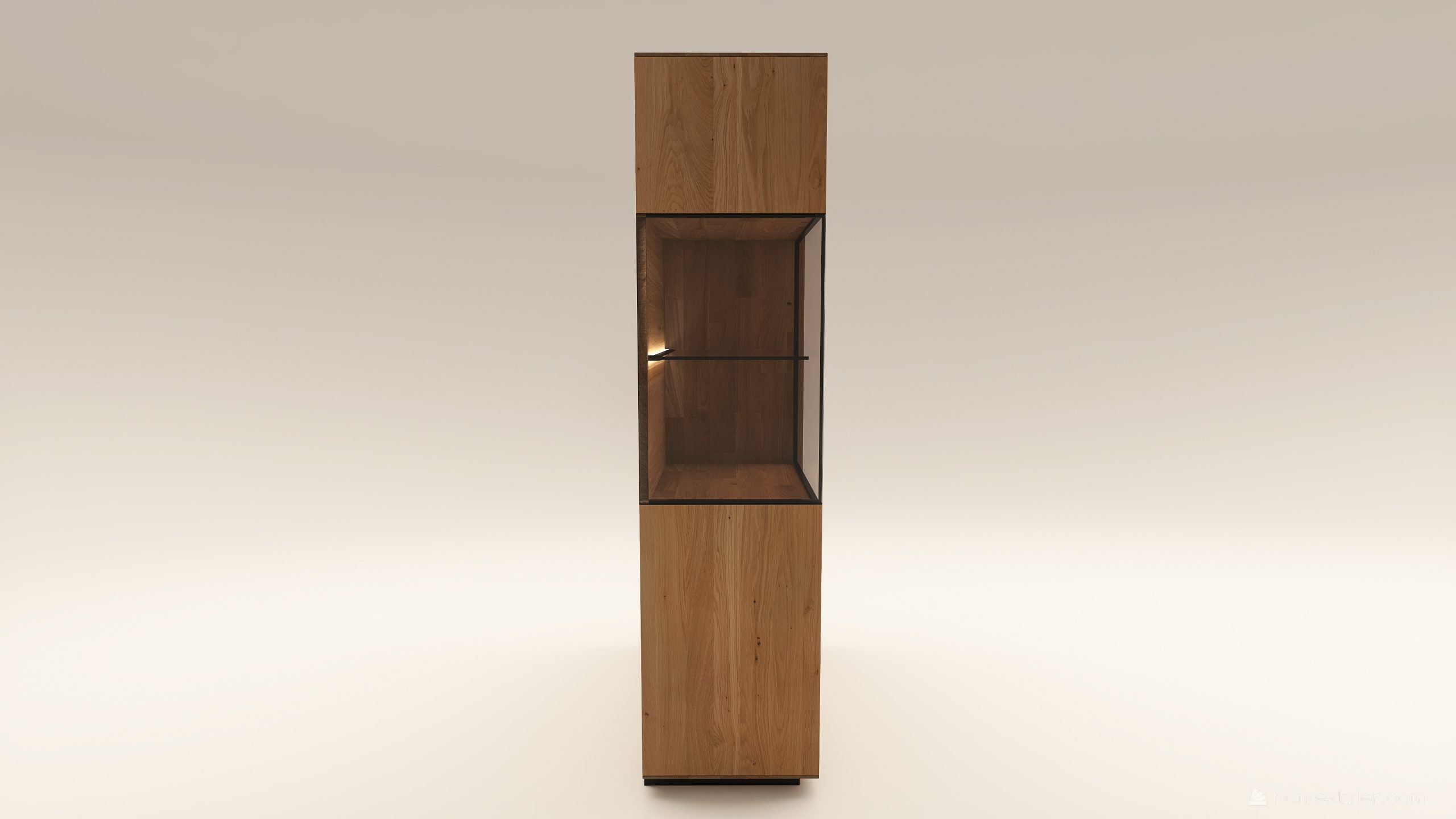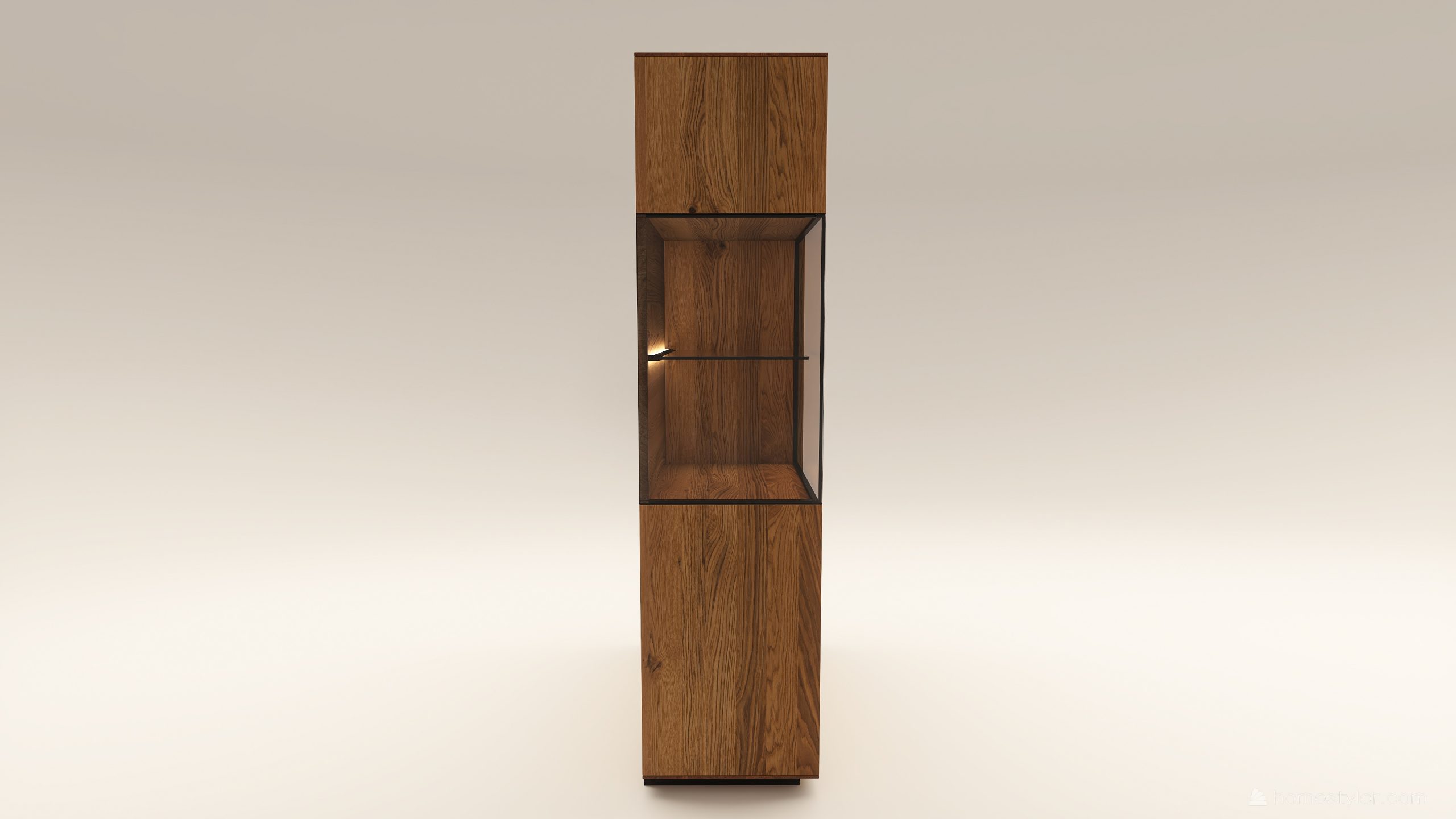 Tömörfa szekrény, egy üveges ajtóval mögötte egy üveg polccal és egy fa polccal. Továbbá egy fa ajtóval mögötte négy fa polccal. A hátfal anyaga (kő, kerámia) és a világítás opcióként választható. A lábazat magassága 40 mm.