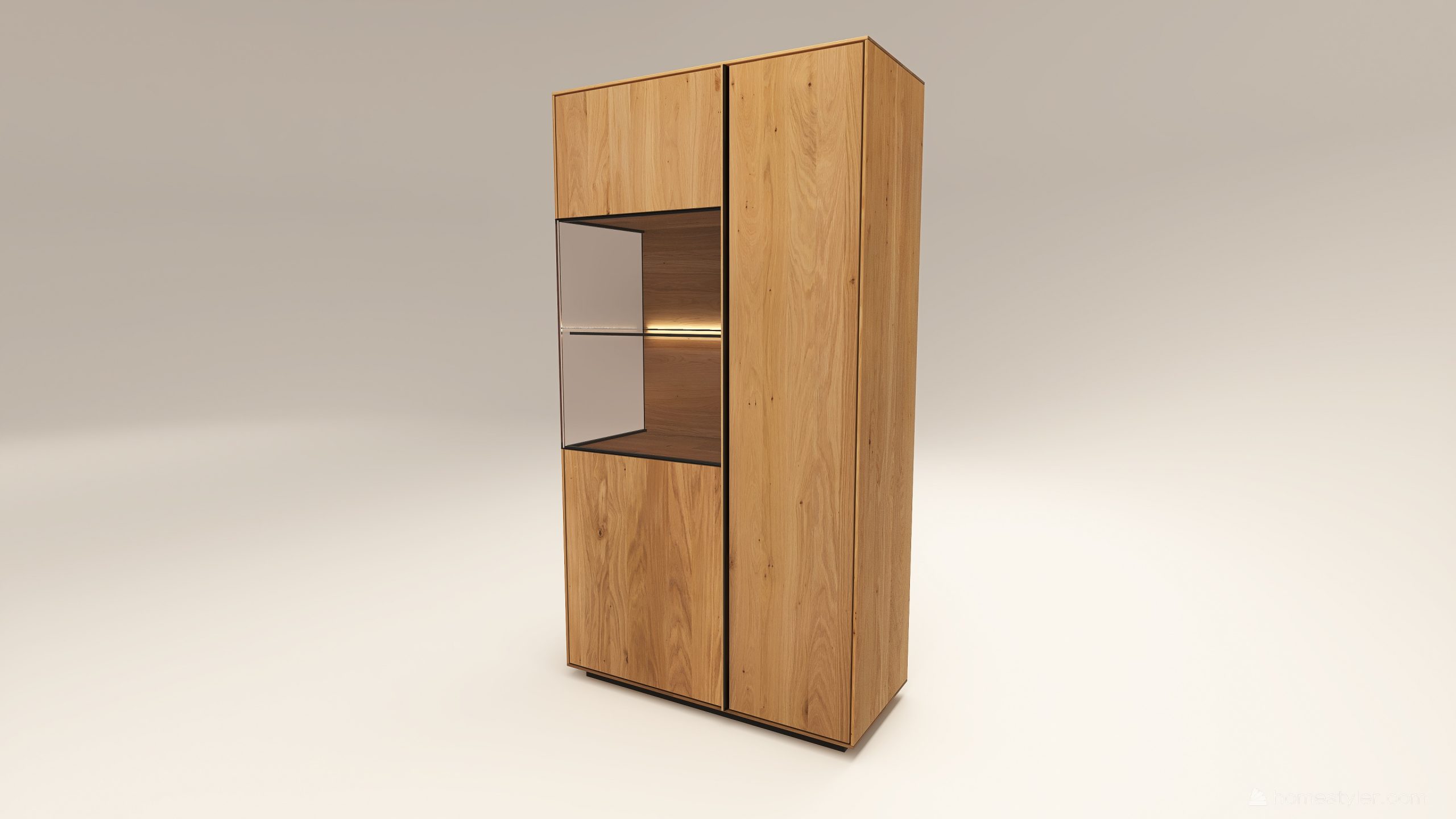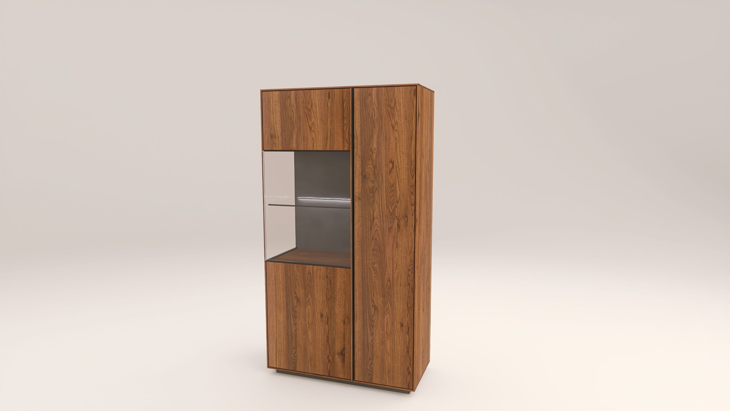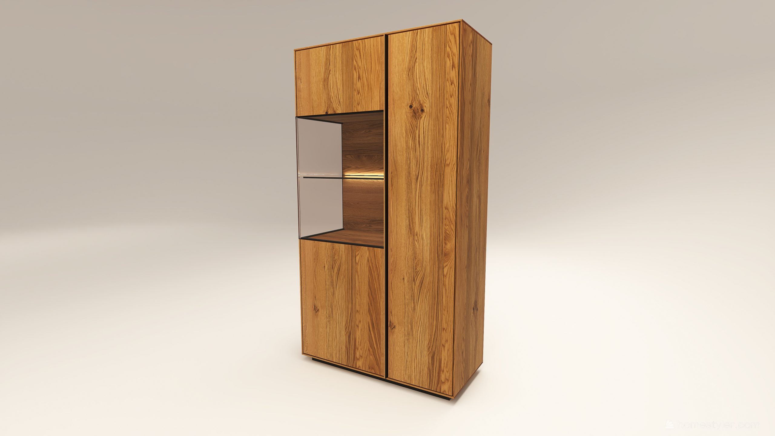 Tömörfa szekrény, egy üveges ajtóval mögötte egy üveg polccal és egy fa polccal. Továbbá egy fa ajtóval mögötte négy fa polccal. A hátfal anyaga (kő, kerámia) és a világítás opcióként választható. A lábazat magassága 40 mm.