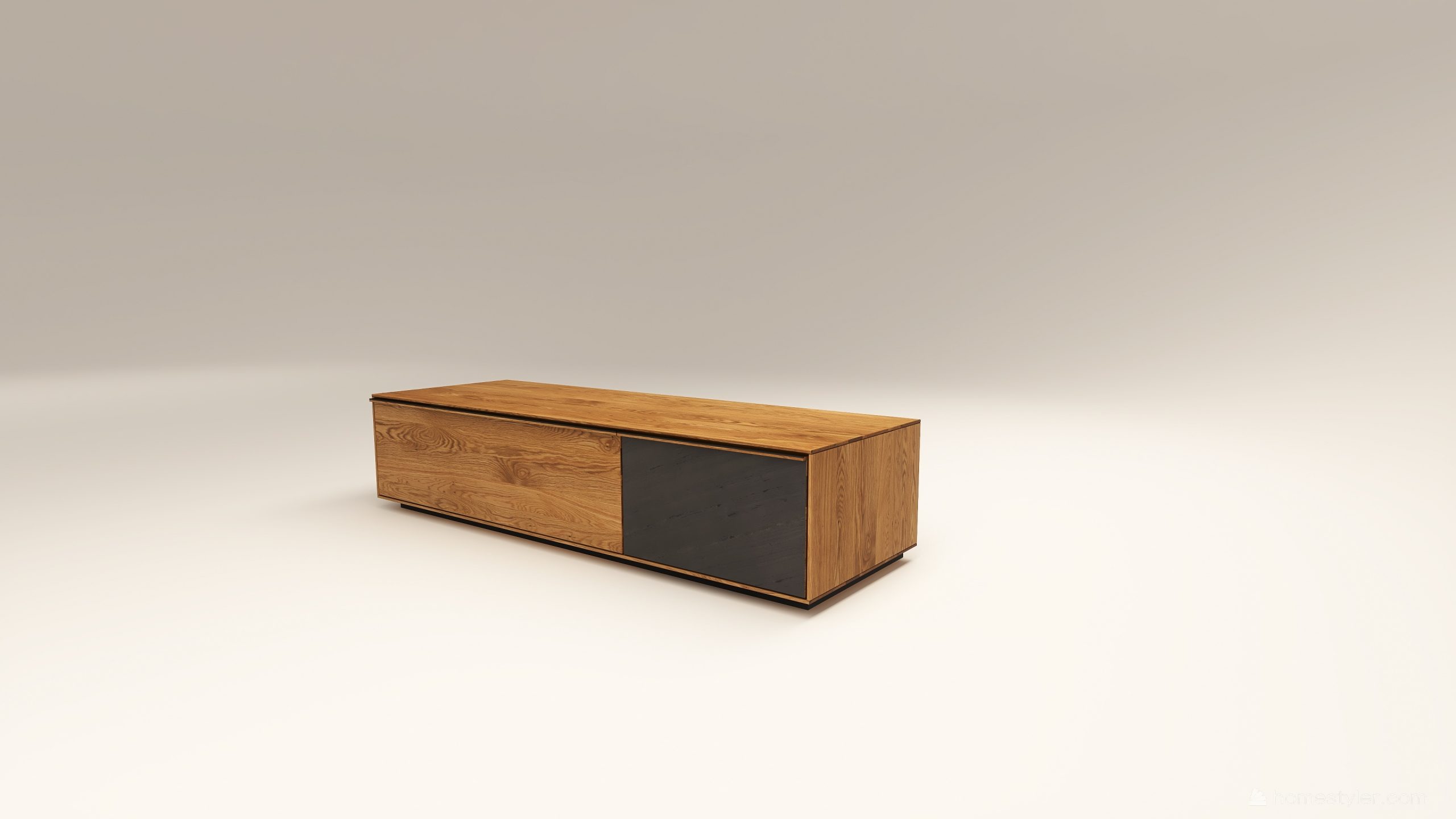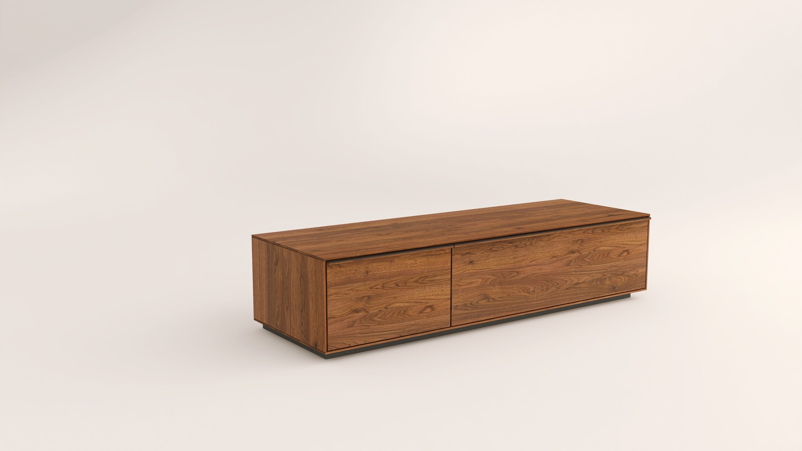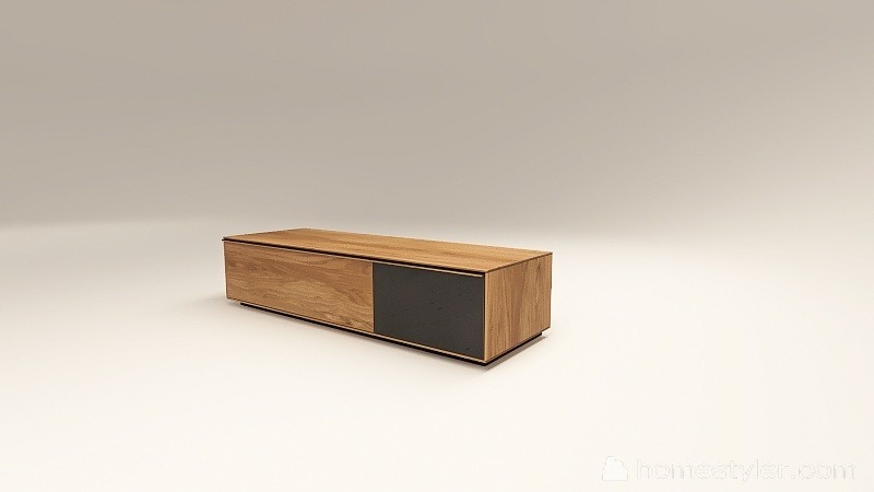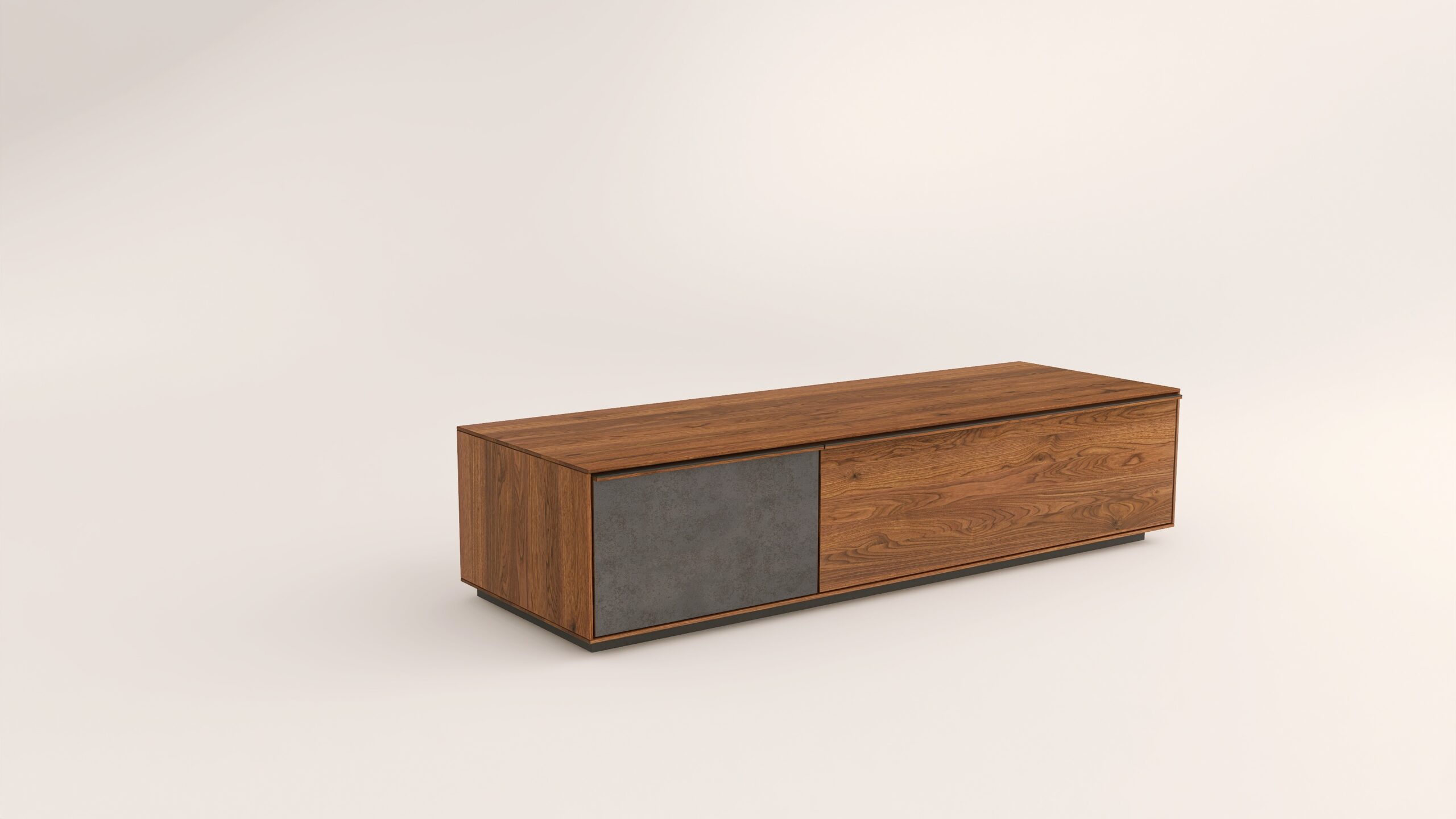 Tömör fából készült alacsony szekrény, egy lenyíló ajtóval egy mély fiókkal. A mély fiók frontfelülete szürke kerámiával vagy palafurnérral rendelhető. A kábelkivezetés opcióként választható. A lábazat magassága 40 mm.