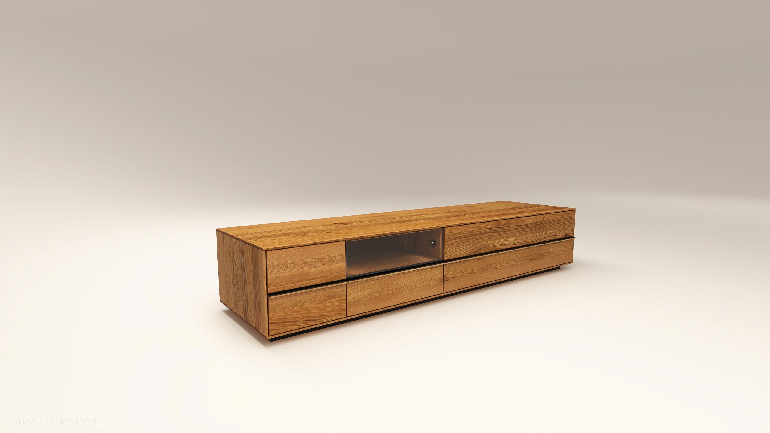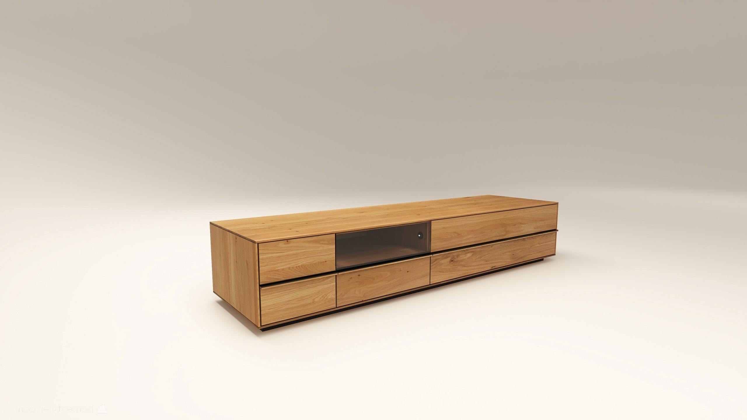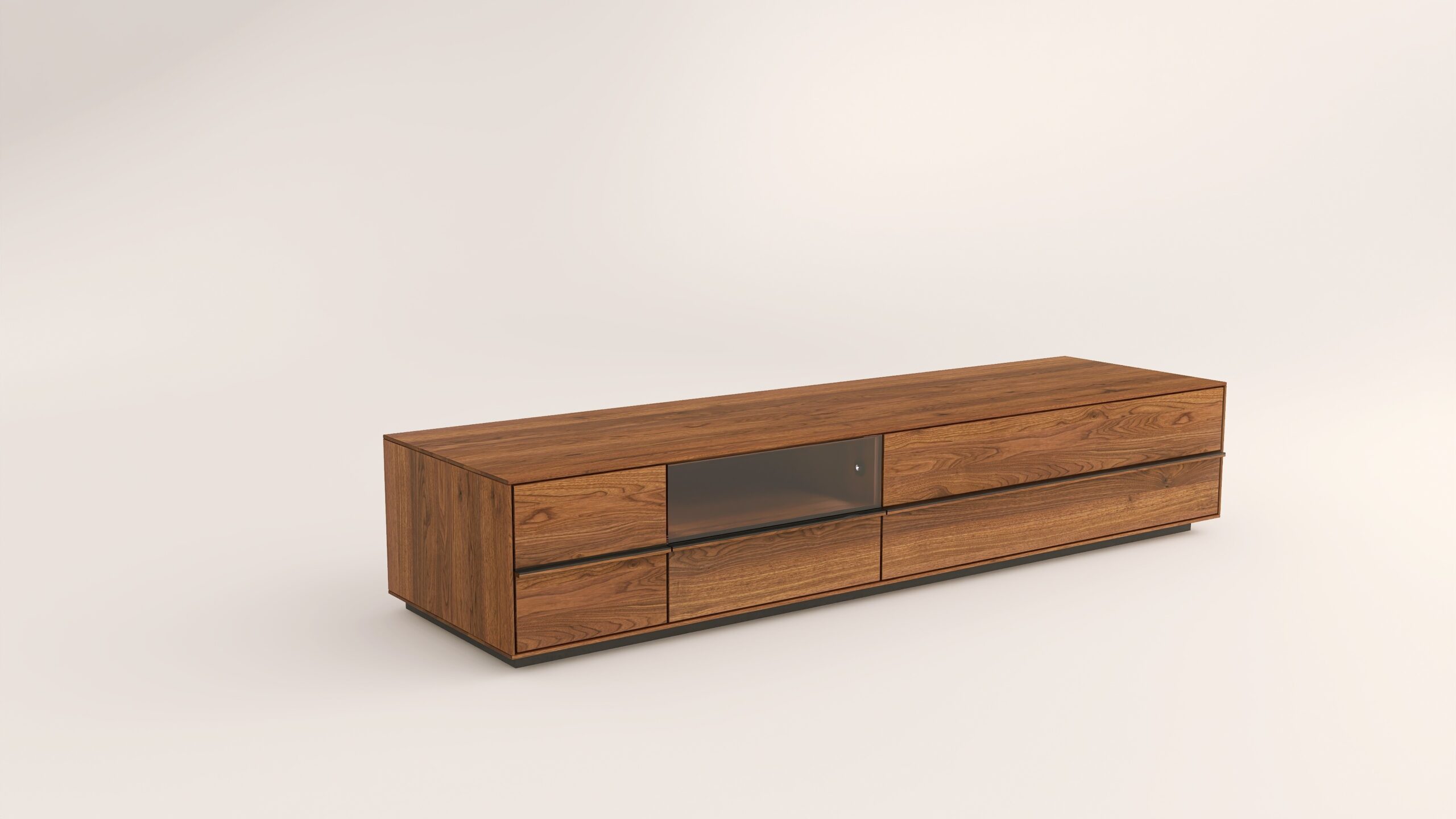Fából készült alacsony szekrény, egy üveges lenyíló ajtóval két mély fiókkal. A kábelkivezetés opcióként választható. A lábazat magassága 40 mm.