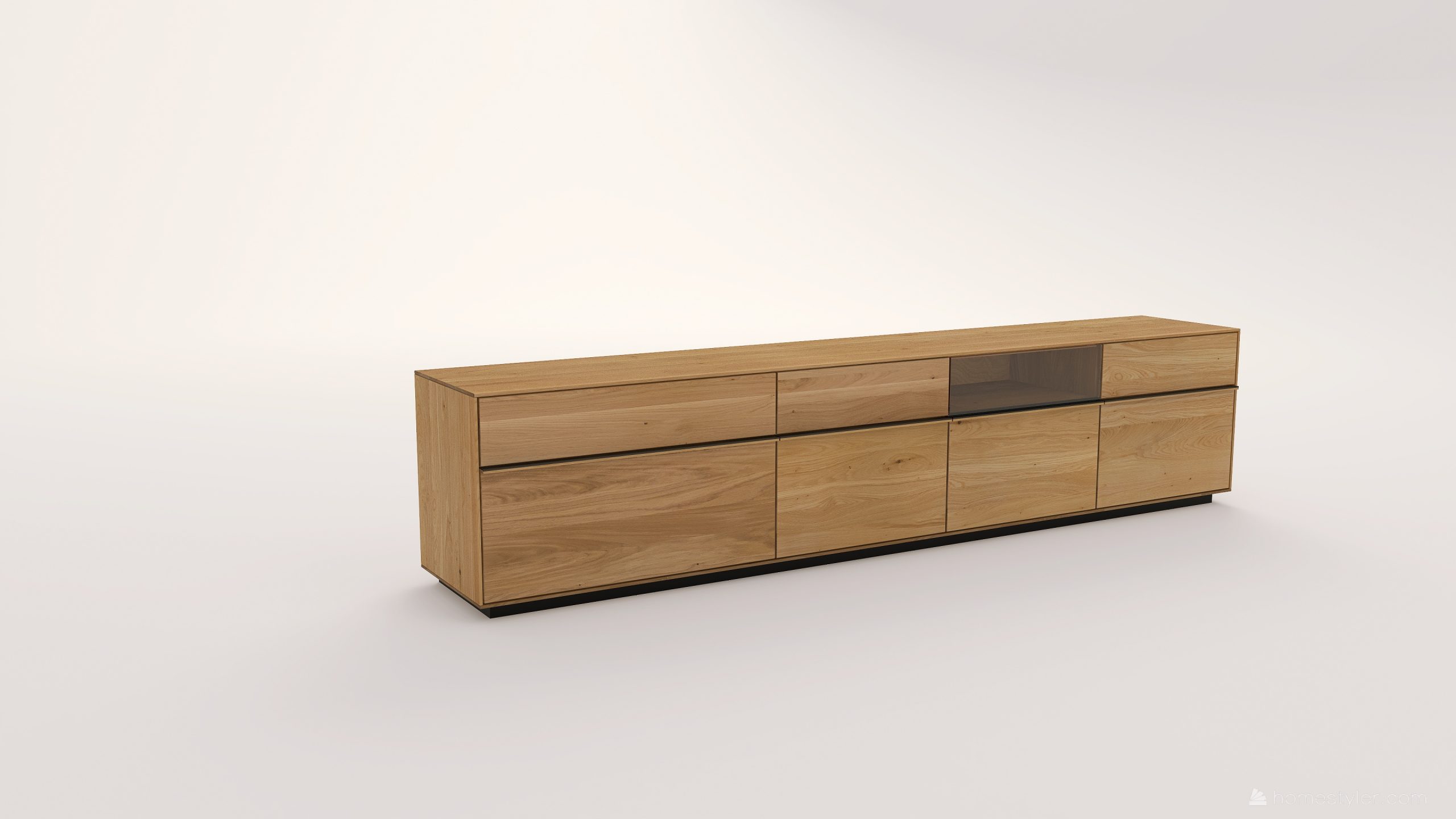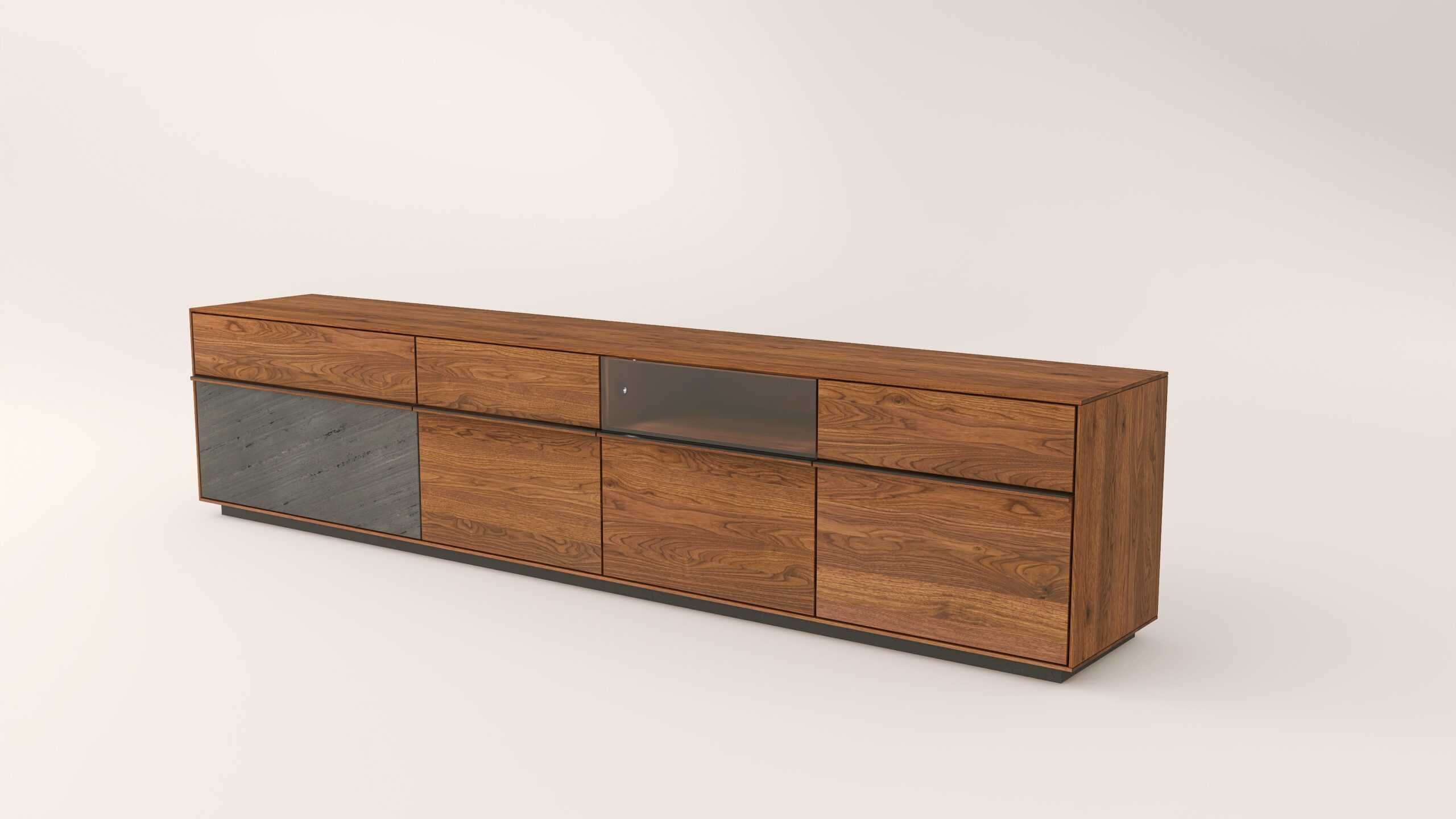 Alacsony tömörfa szekrény, egy üveges lenyíló ajtóval , két nyíló ajtóval, egy keskeny és egy mély fiókkal. A mélyfiók frontfelülete szürke kerámiával vagy palafurnérral rendelhető. A kábelkivezetés és világítás opcióként választható. A lábazat magassága 40 mm.